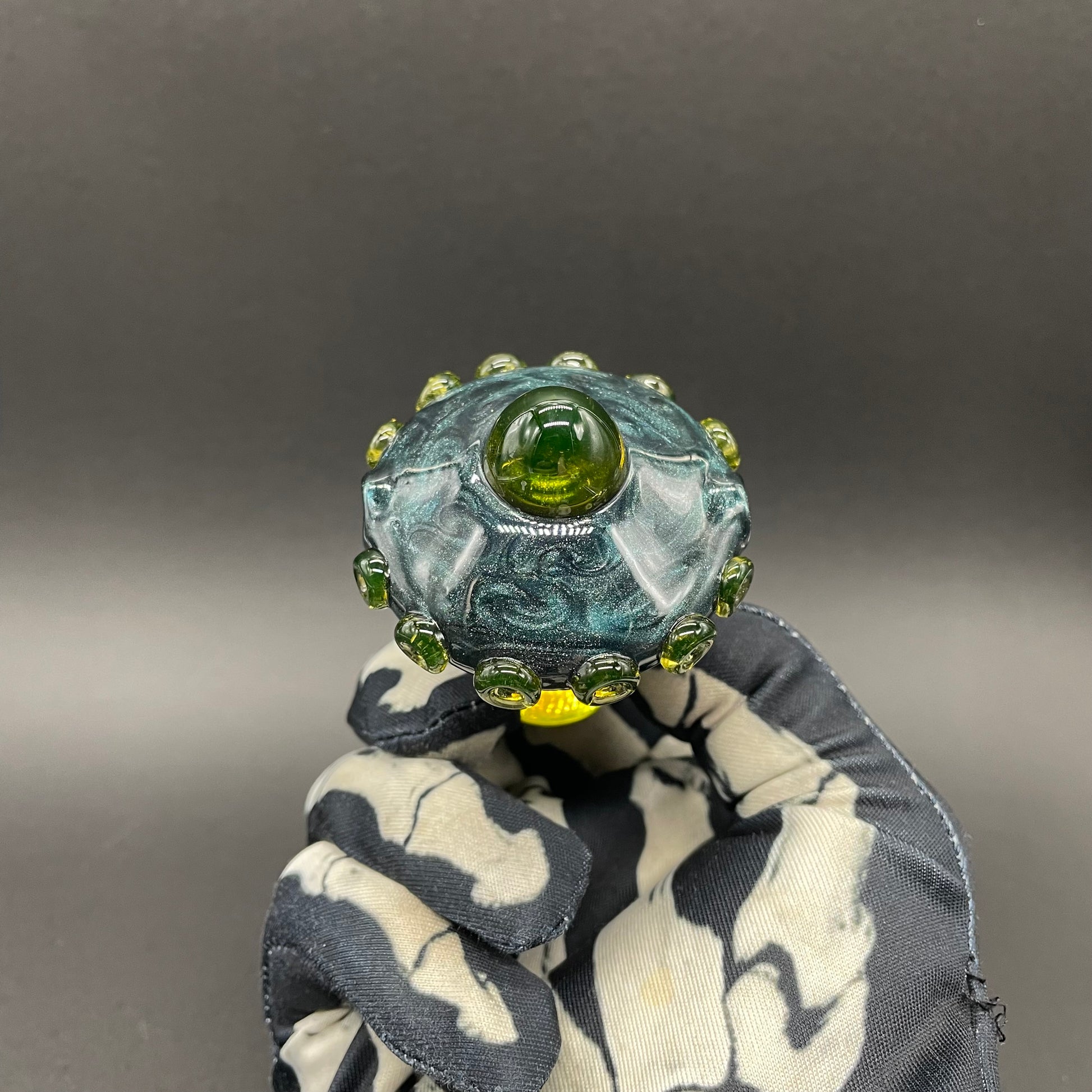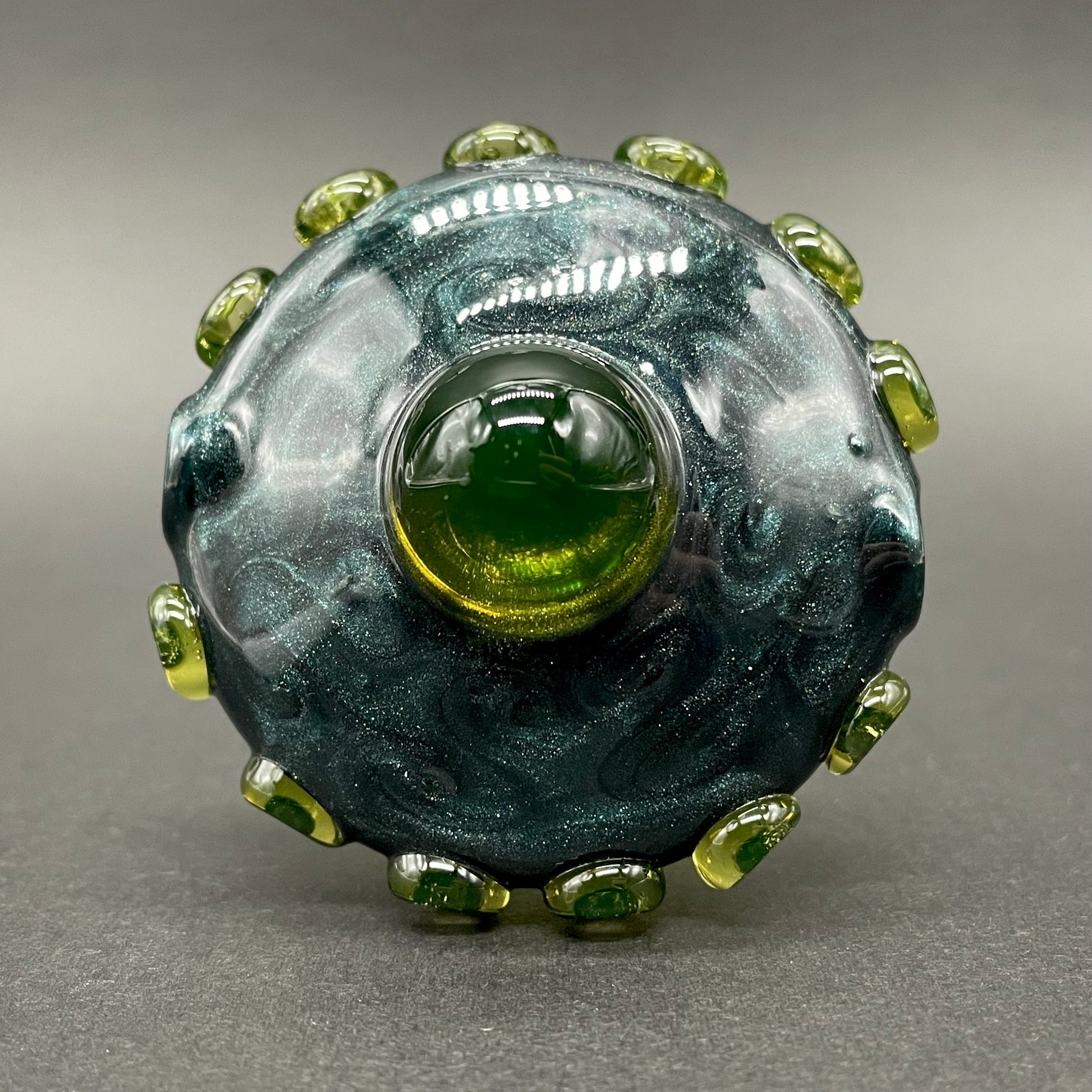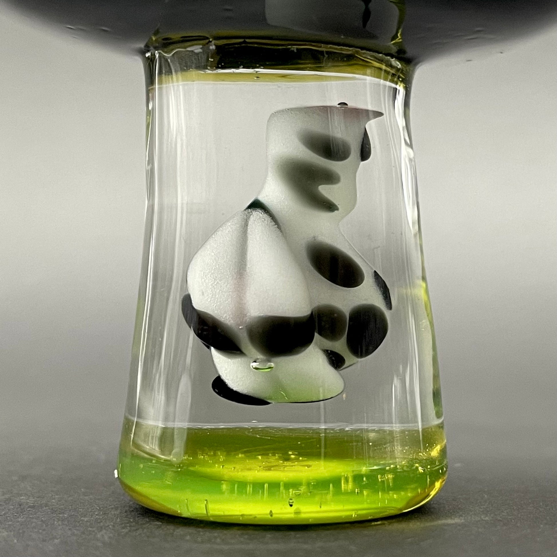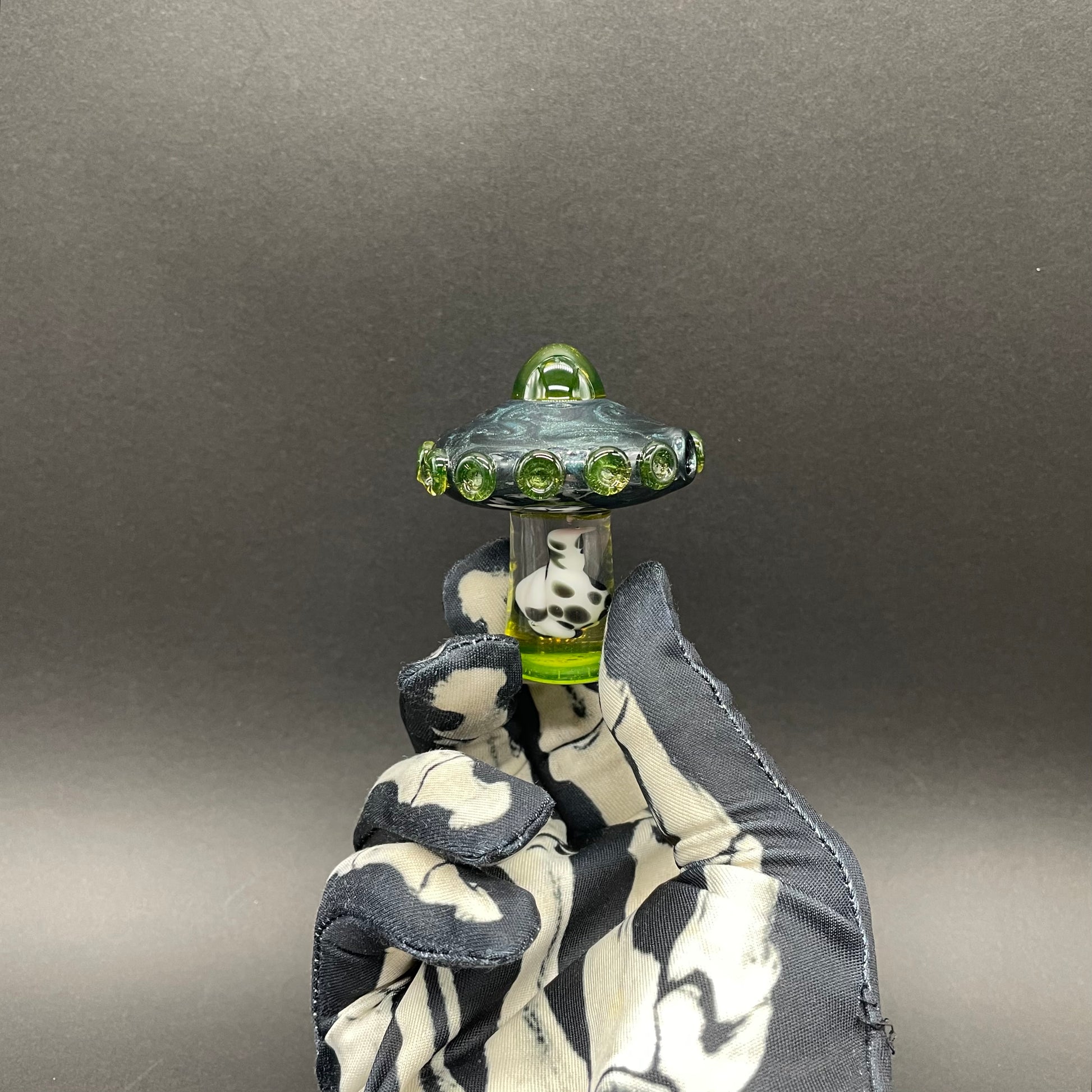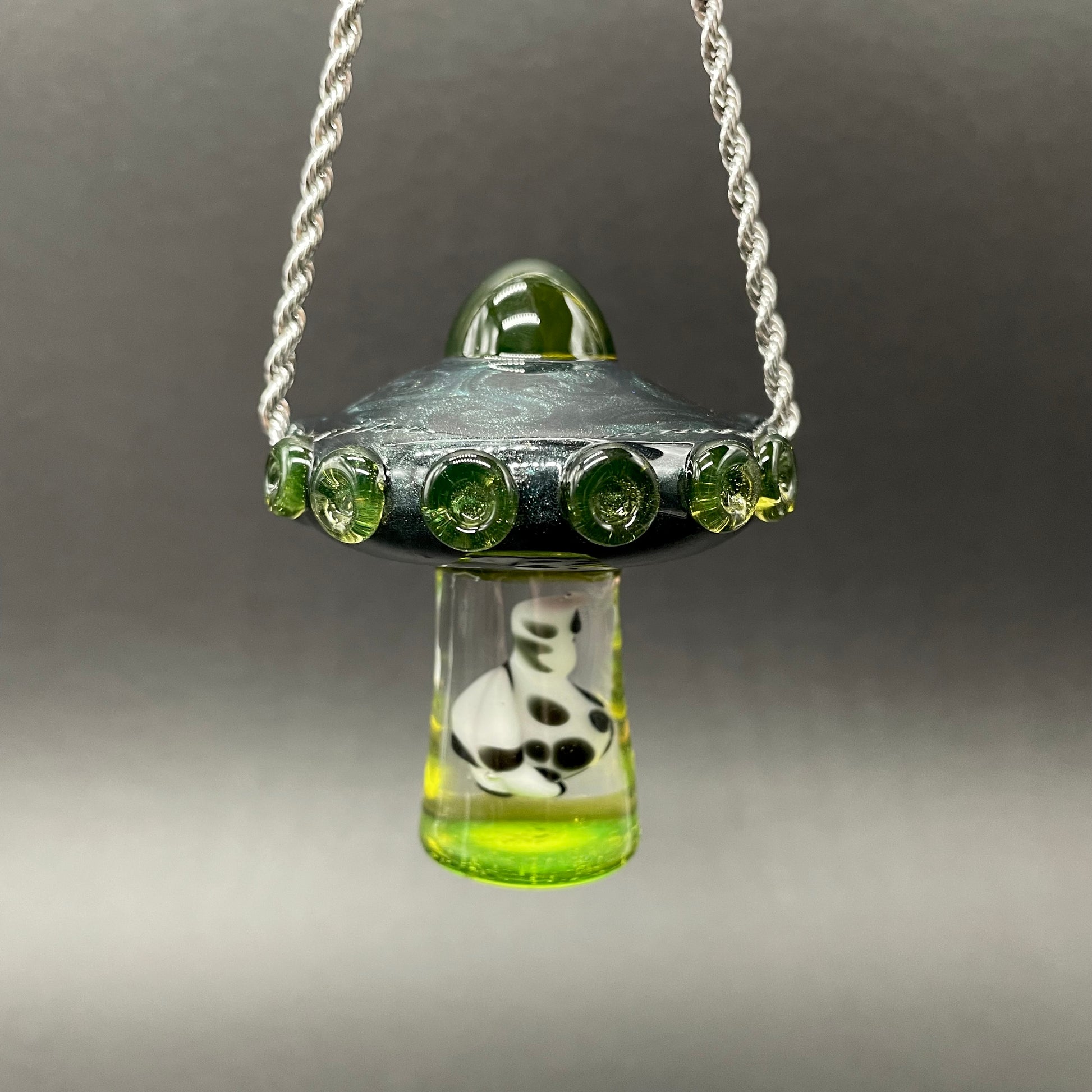 No wonder my hamburgers cost so much. This piece features a spacecraft beaming up an abducted cow. The glass pendant is made with a solid cow encased in glass. The hollow spaceship has openings on either side perfect for wearing on a cord.