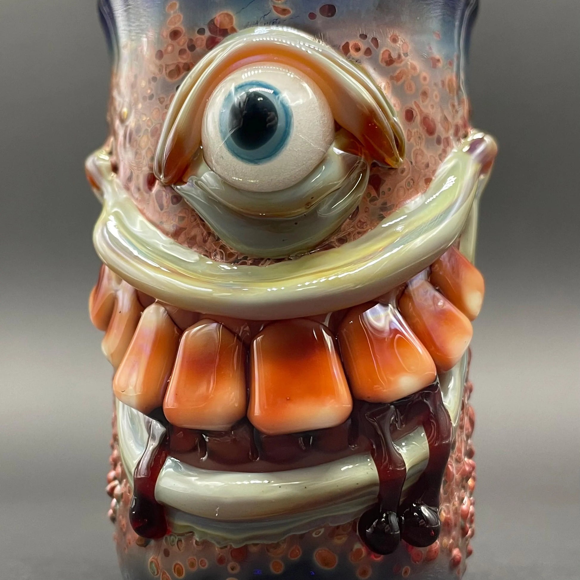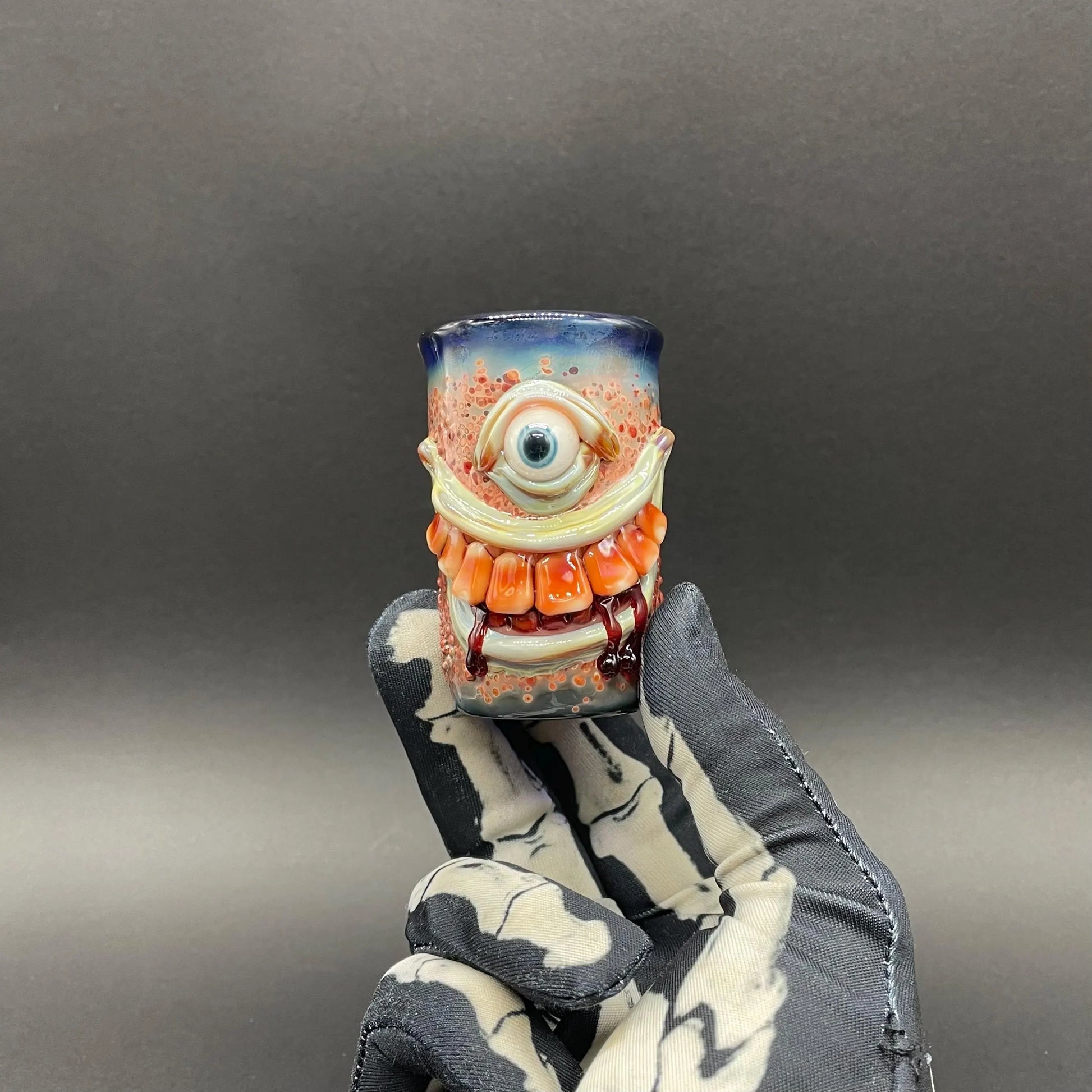 This haunting hand-blown shot glass is anything but ordinary. A single glow-in-the-dark eye peers out watching as you raise your drink. Twisted horns protrude from the glass, while jagged blood red teeth drip with sinister drool, creating a chillingly macabre effect.