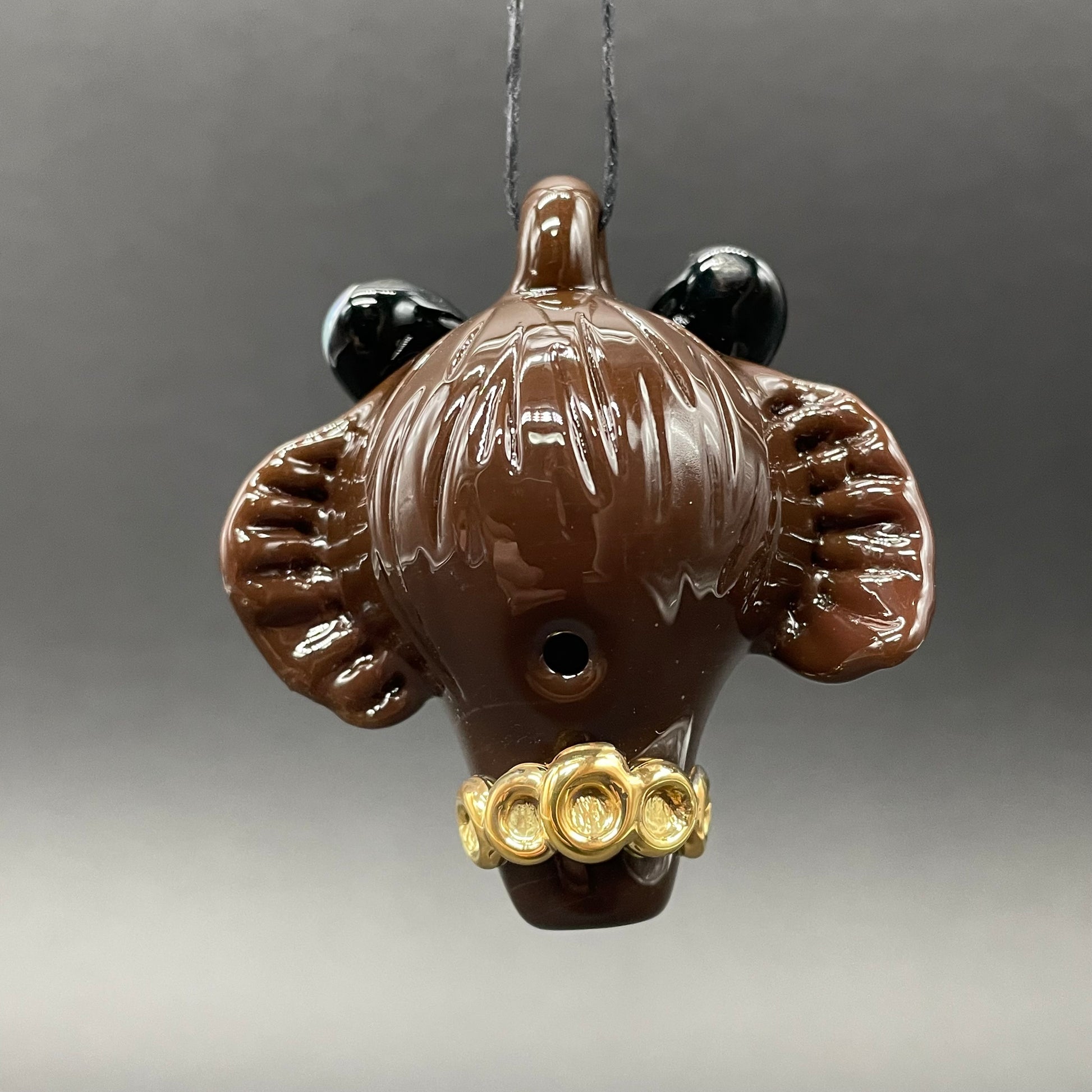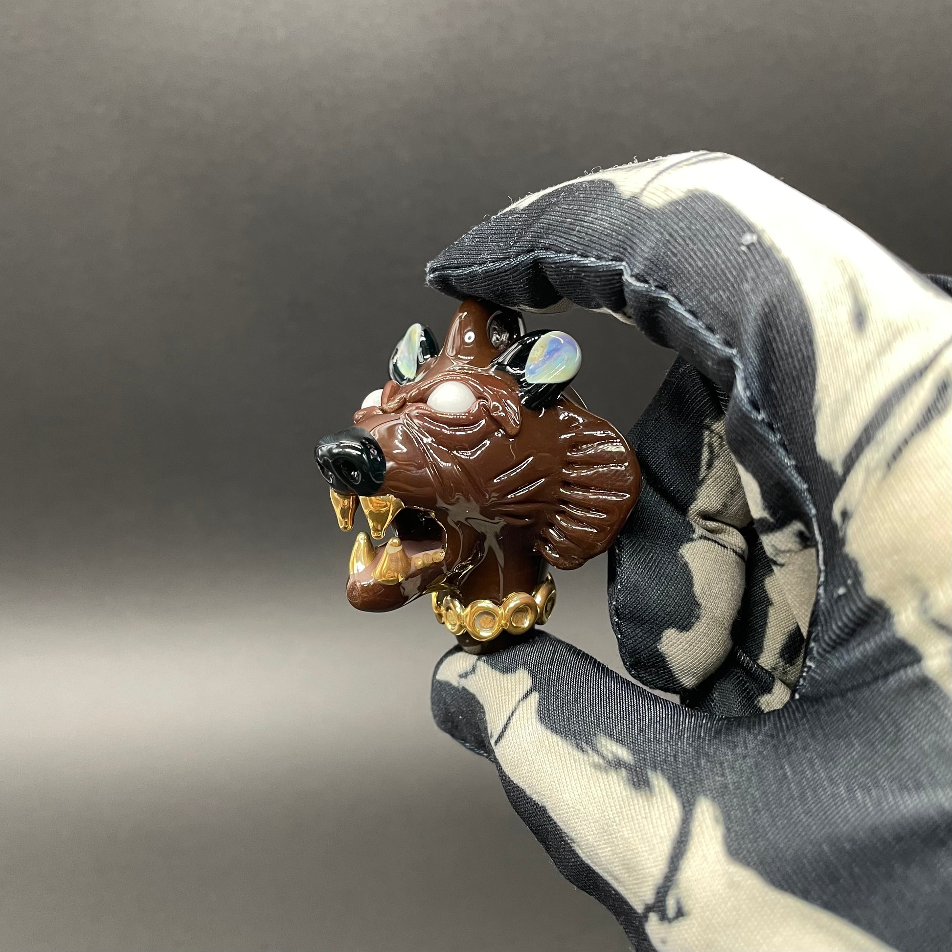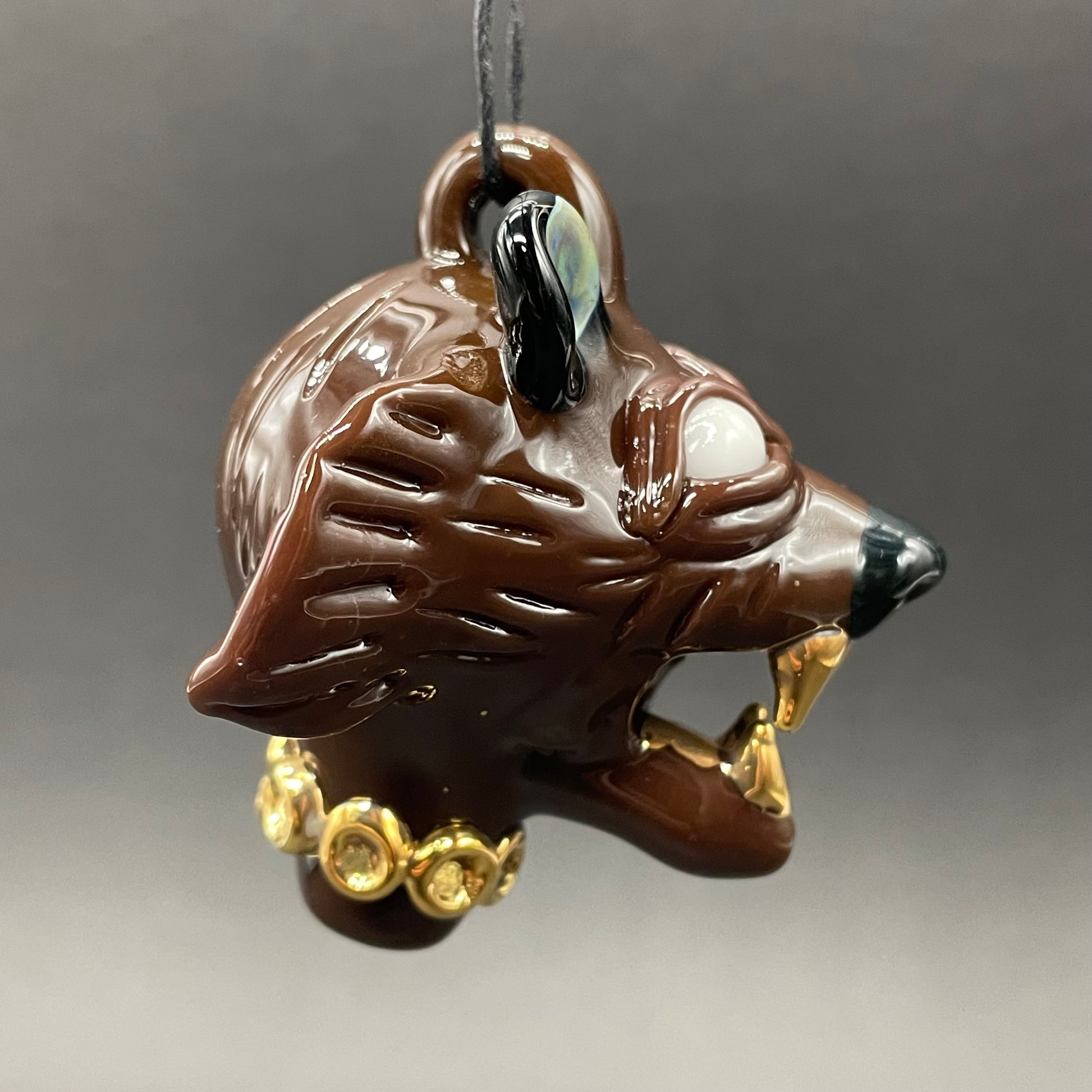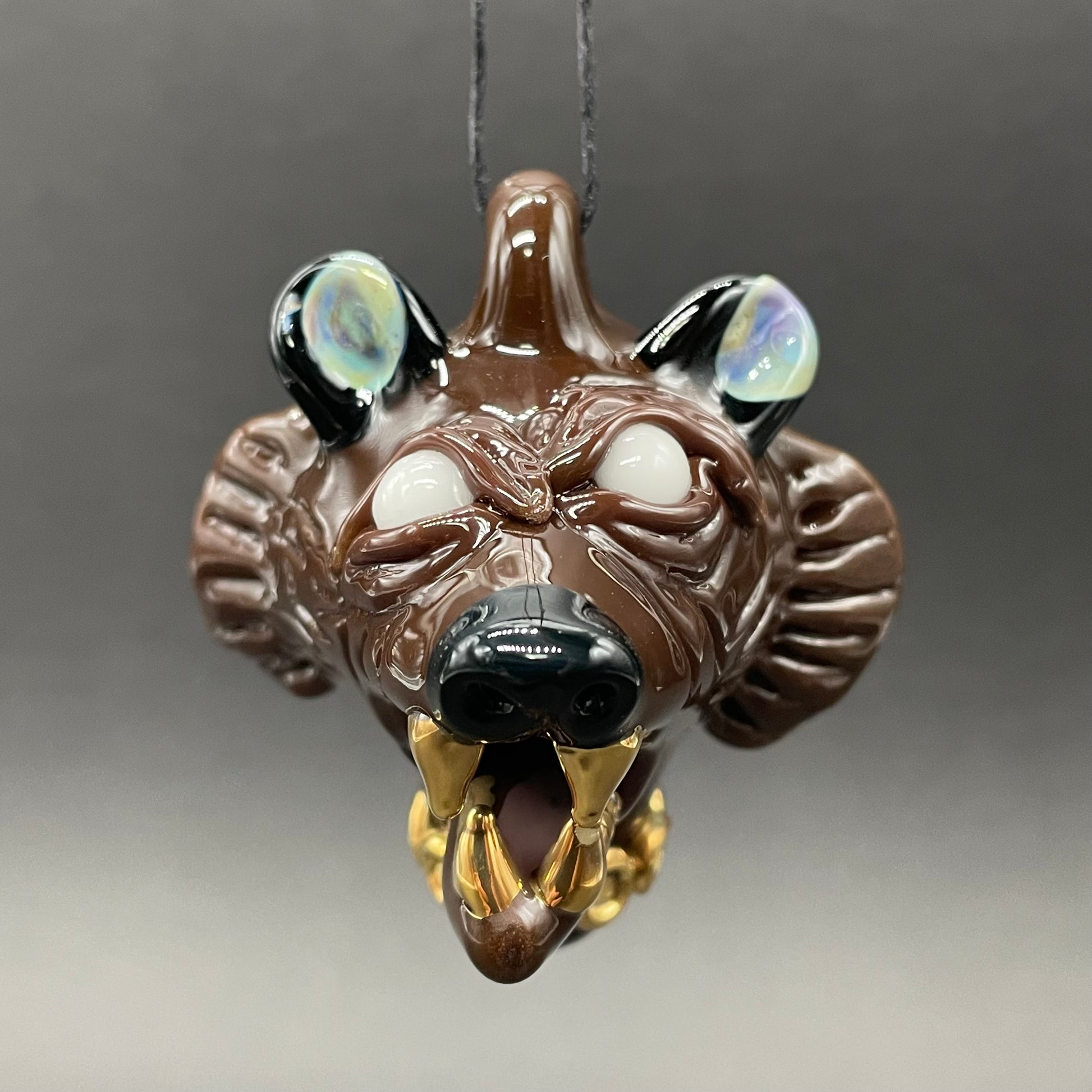 This blinged-out glass grizzly bear pendant features a gold enameled chain, sharp gold grill, and eerie glow in the dark eyes, this fierce little grizzly is ready to shine day or night. Despite its bold presence, the pendant is hollow, making it lighter and more comfortable to wear than solid glass pieces.