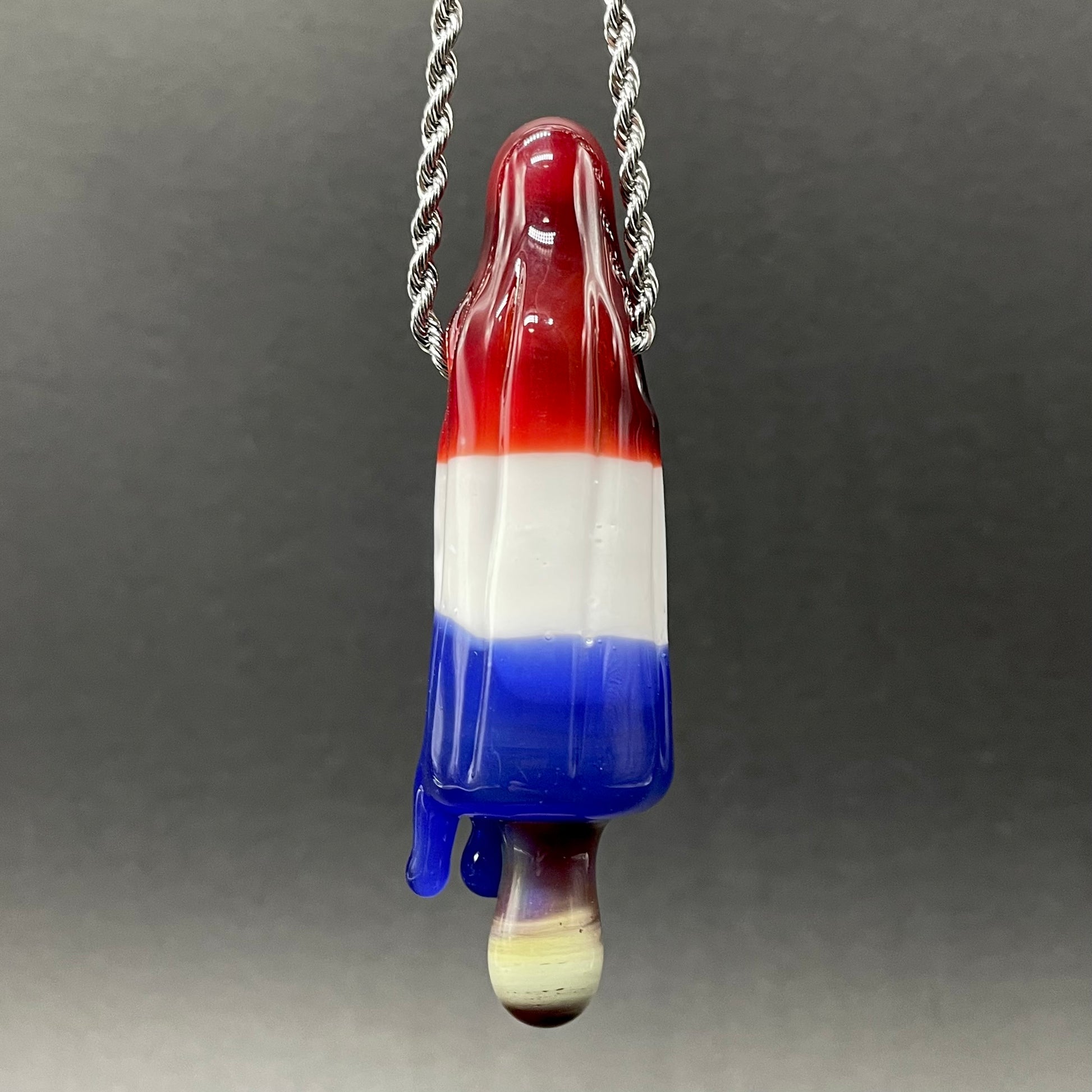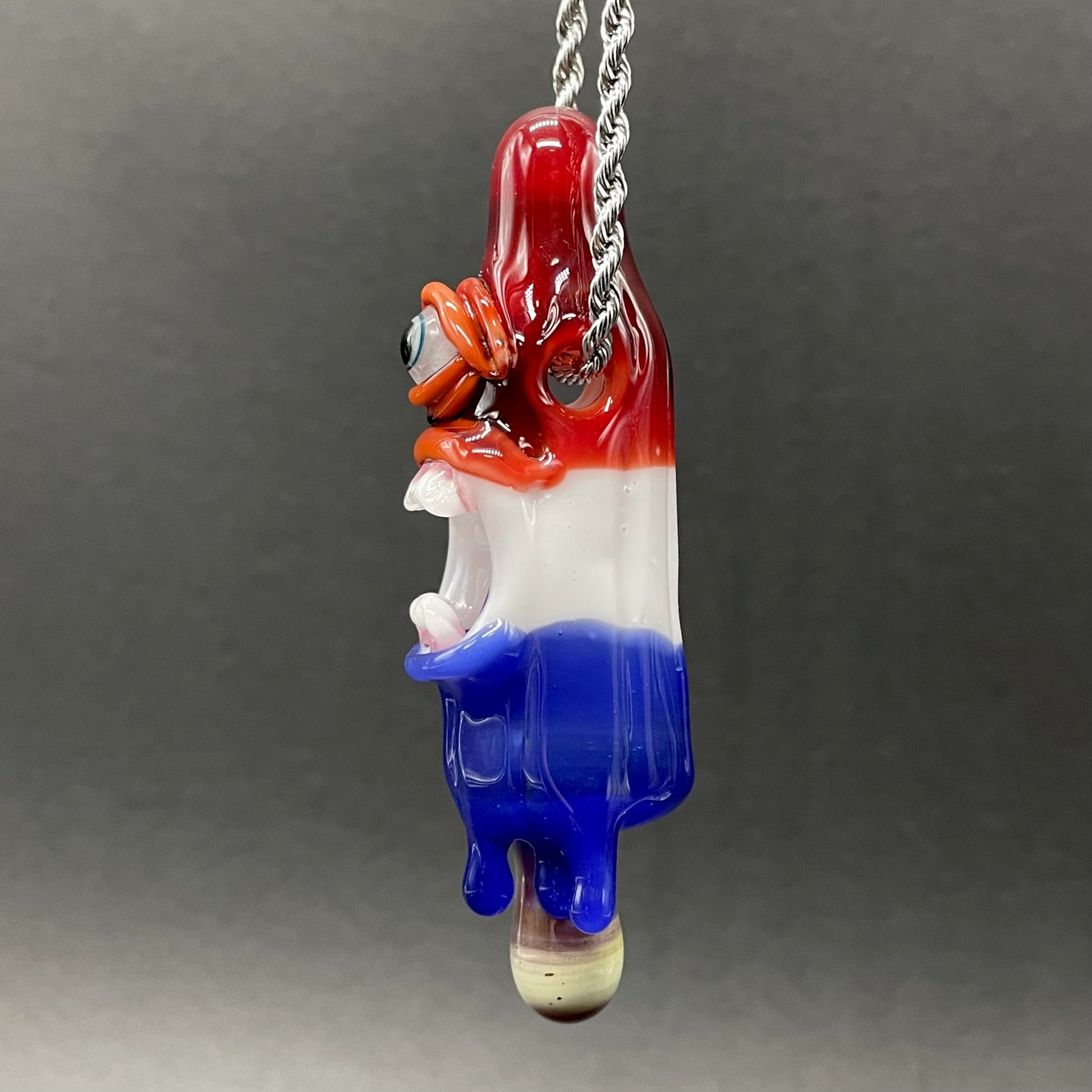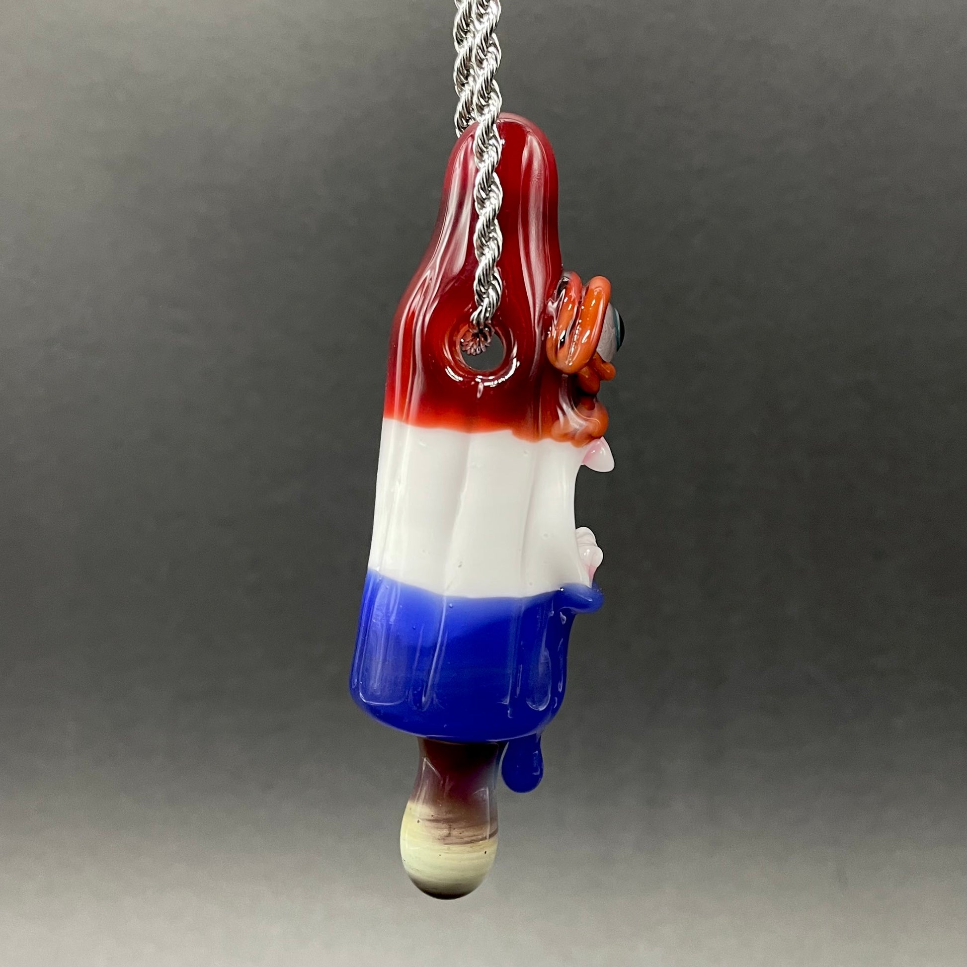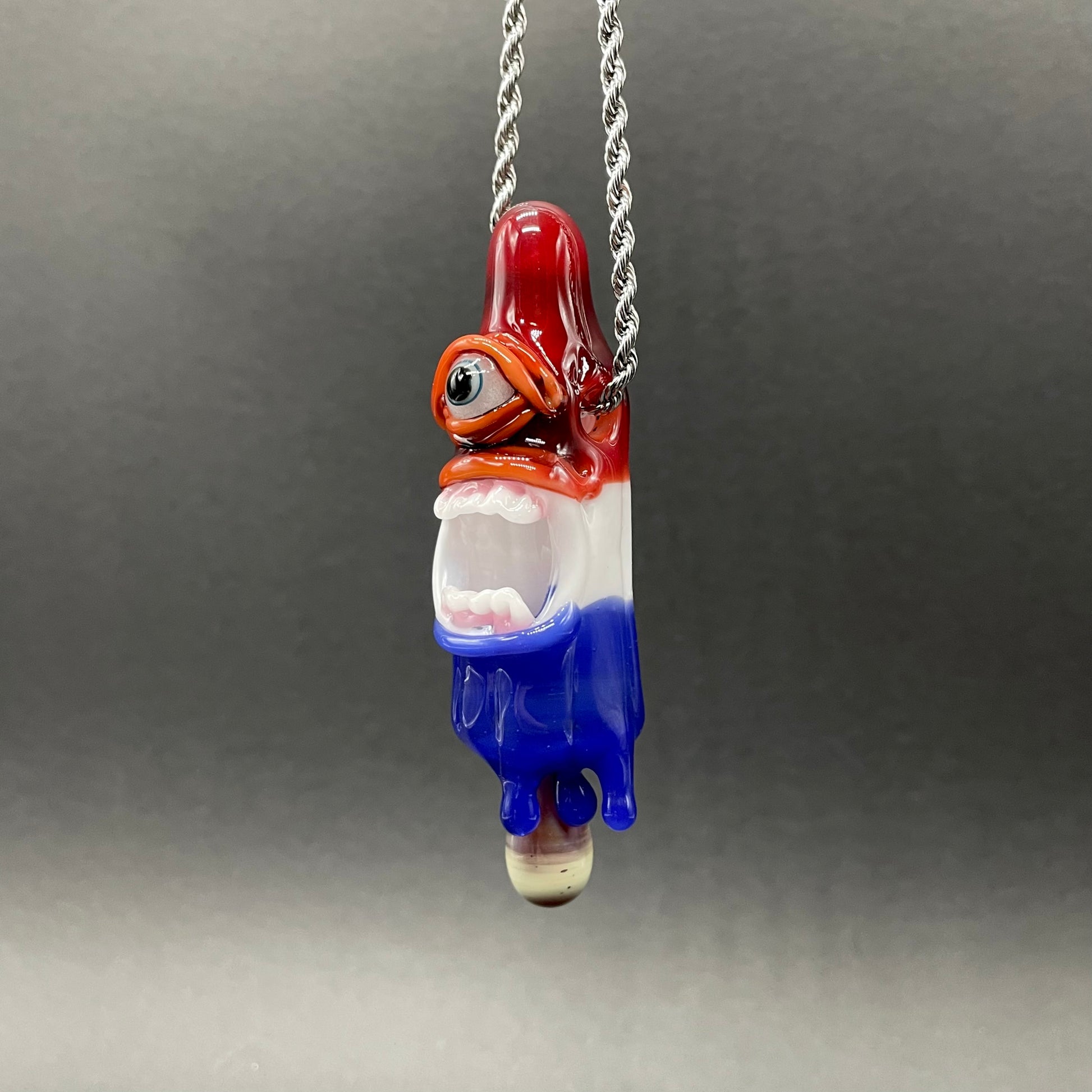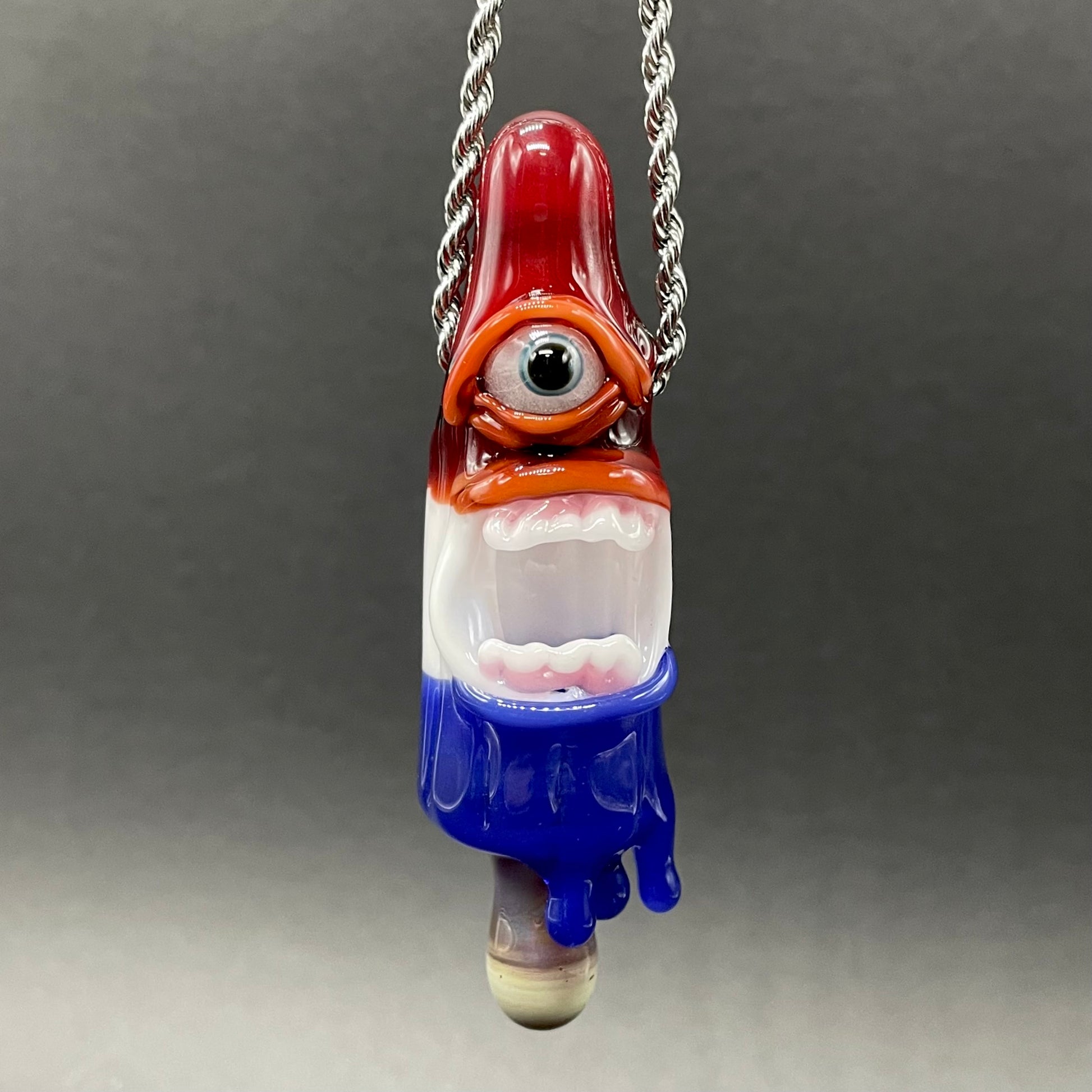 This popsicle pendant features a glow in the dark eye and screaming mouth adorned with a gold enamel tooth. Three flavored layers cherry, lemon, and blue. What flavor is blue anyway?