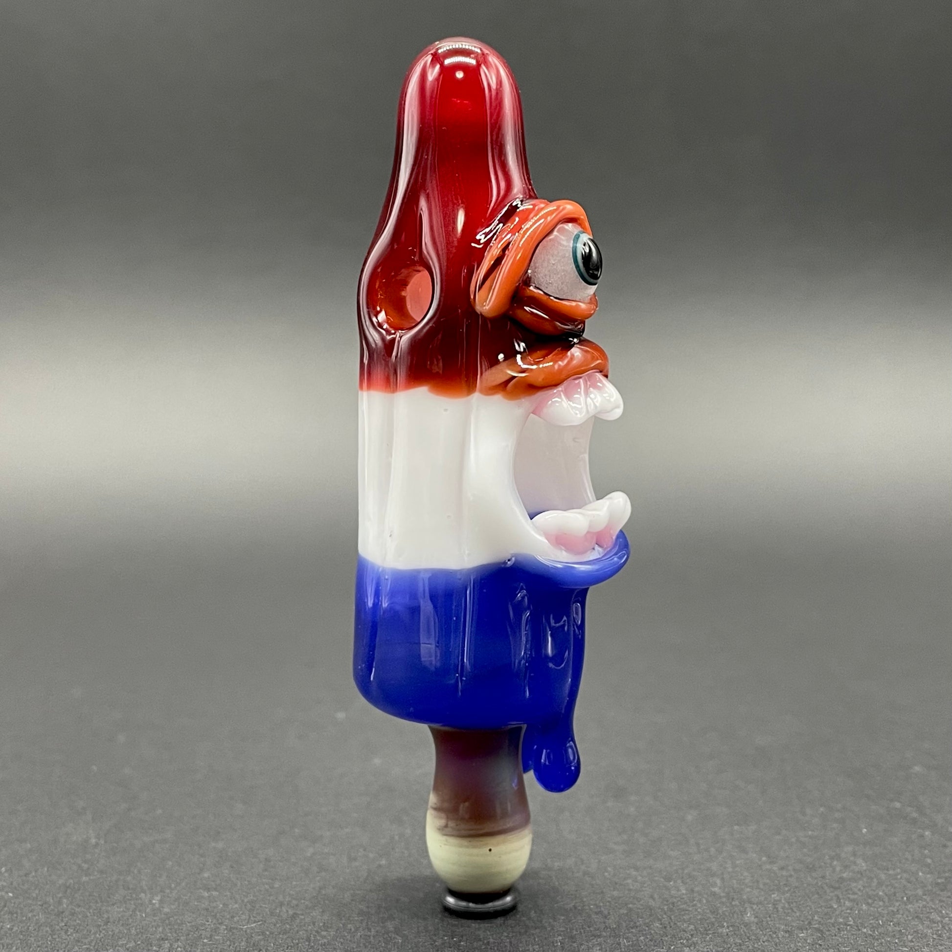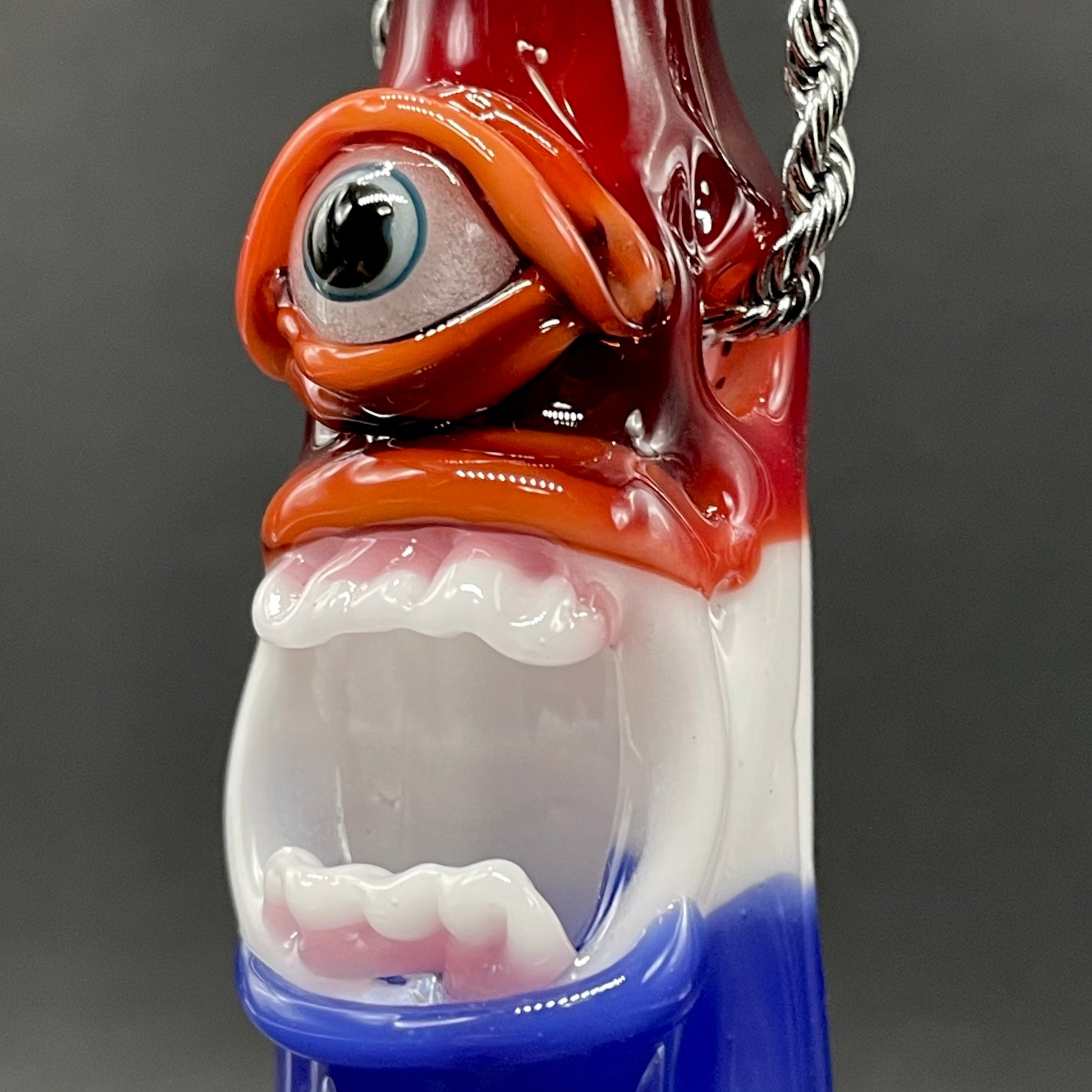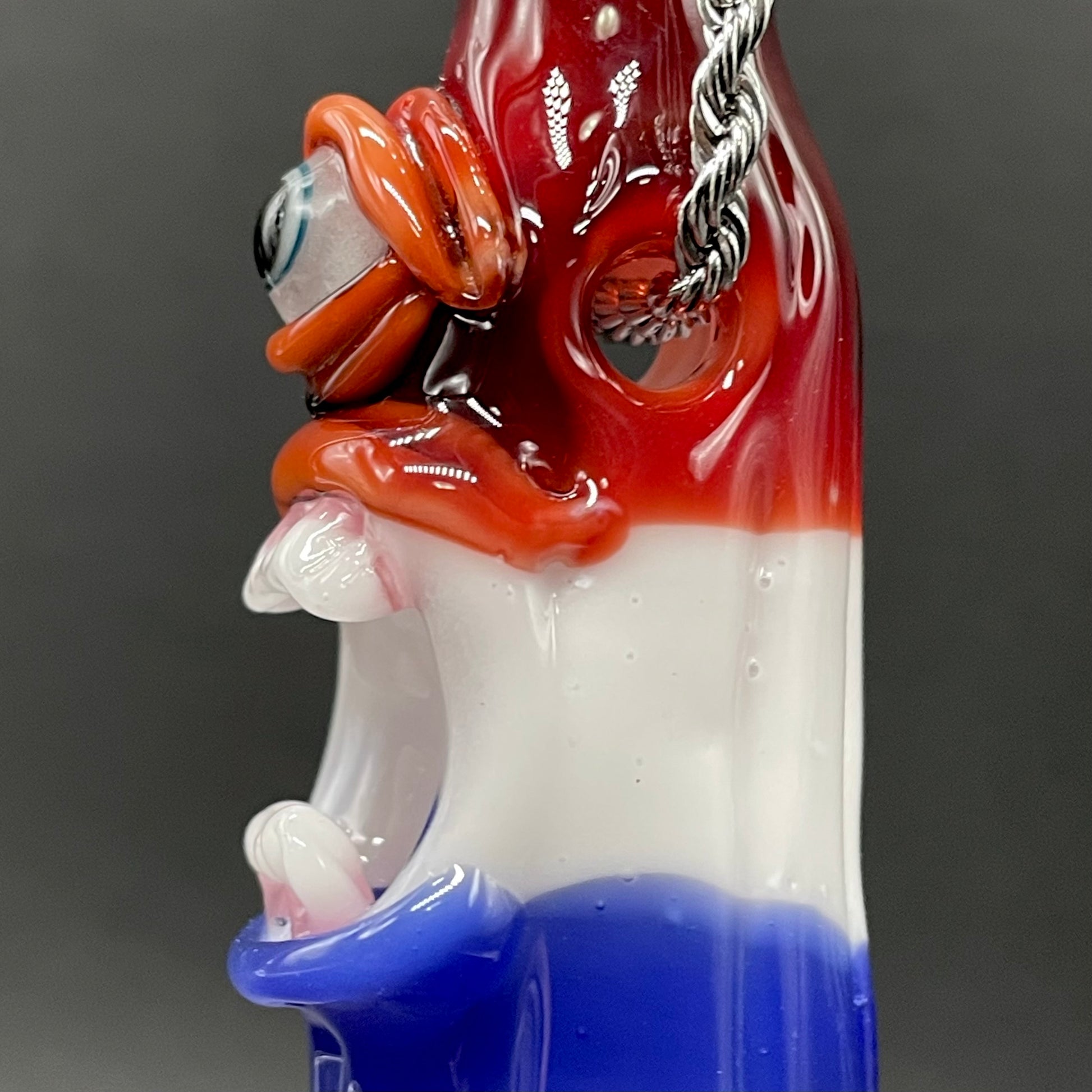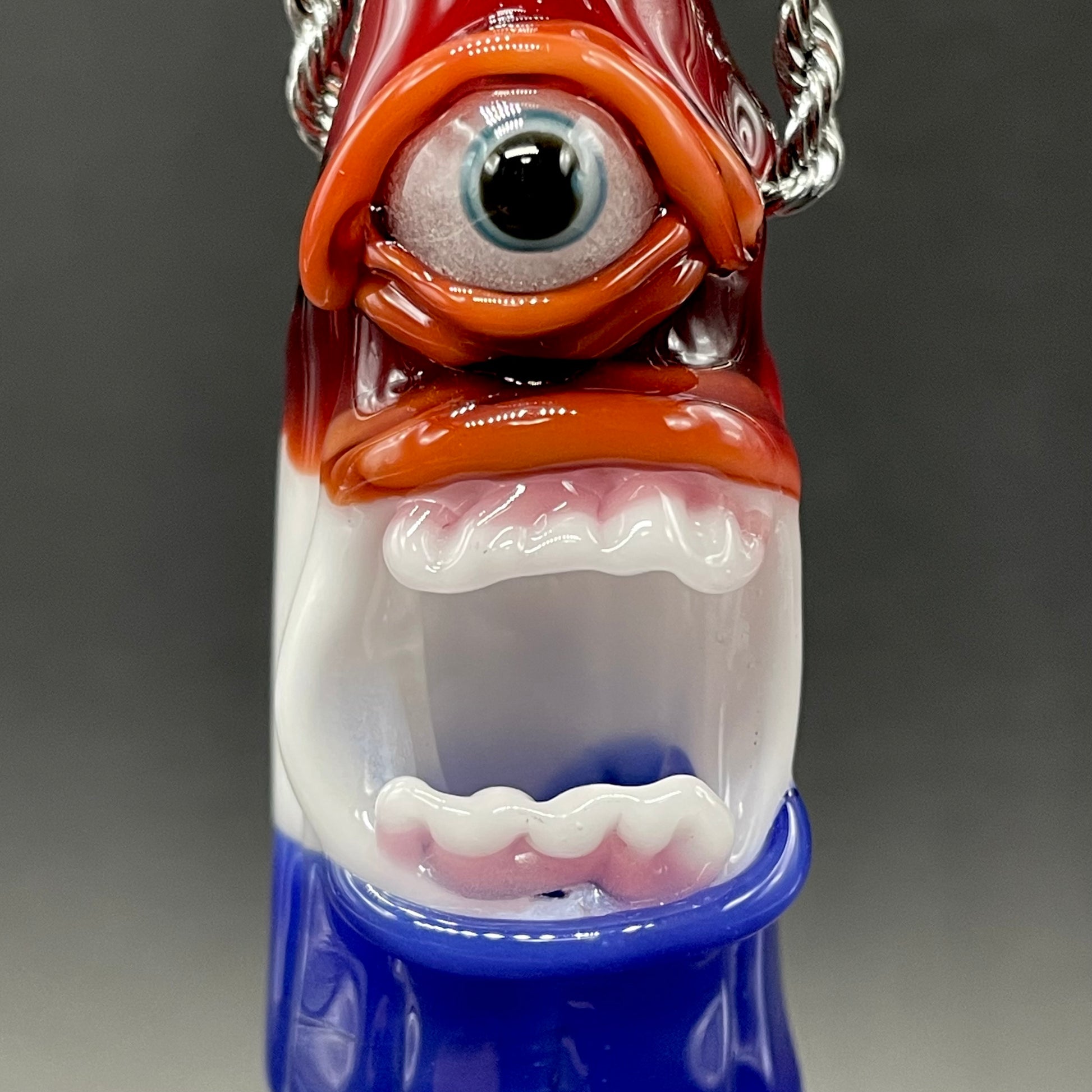 This popsicle pendant features a glow in the dark eye and screaming mouth adorned with a gold enamel tooth. Three flavored layers cherry, lemon, and blue. What flavor is blue anyway?
