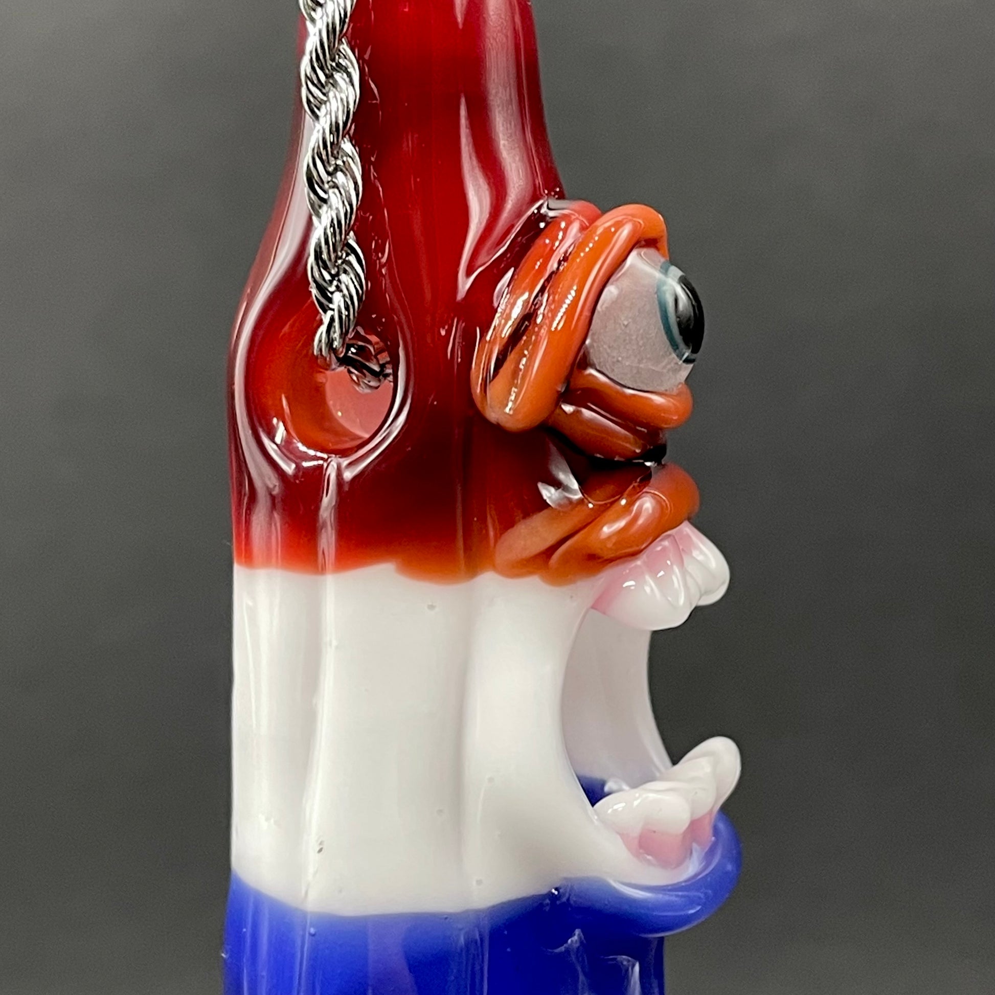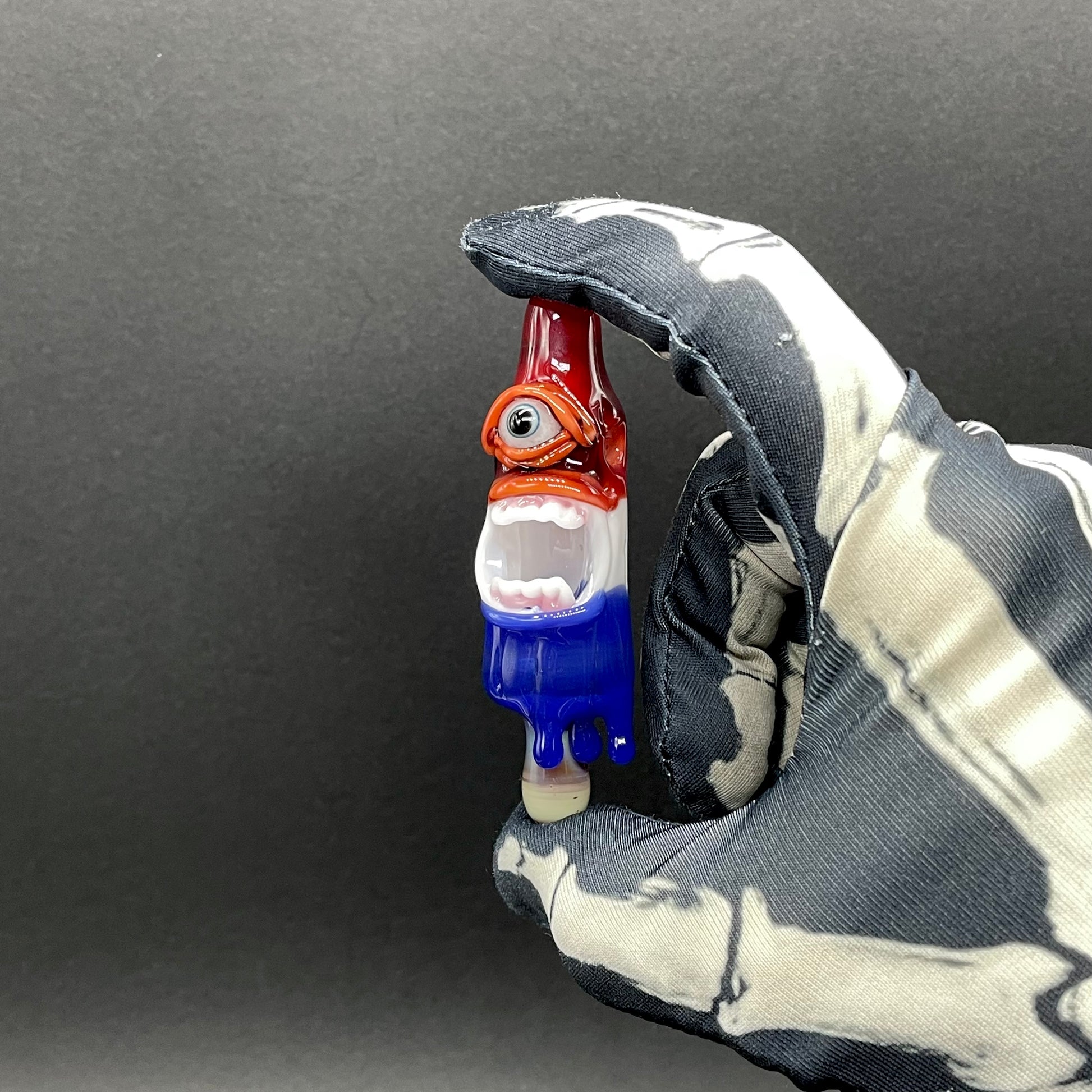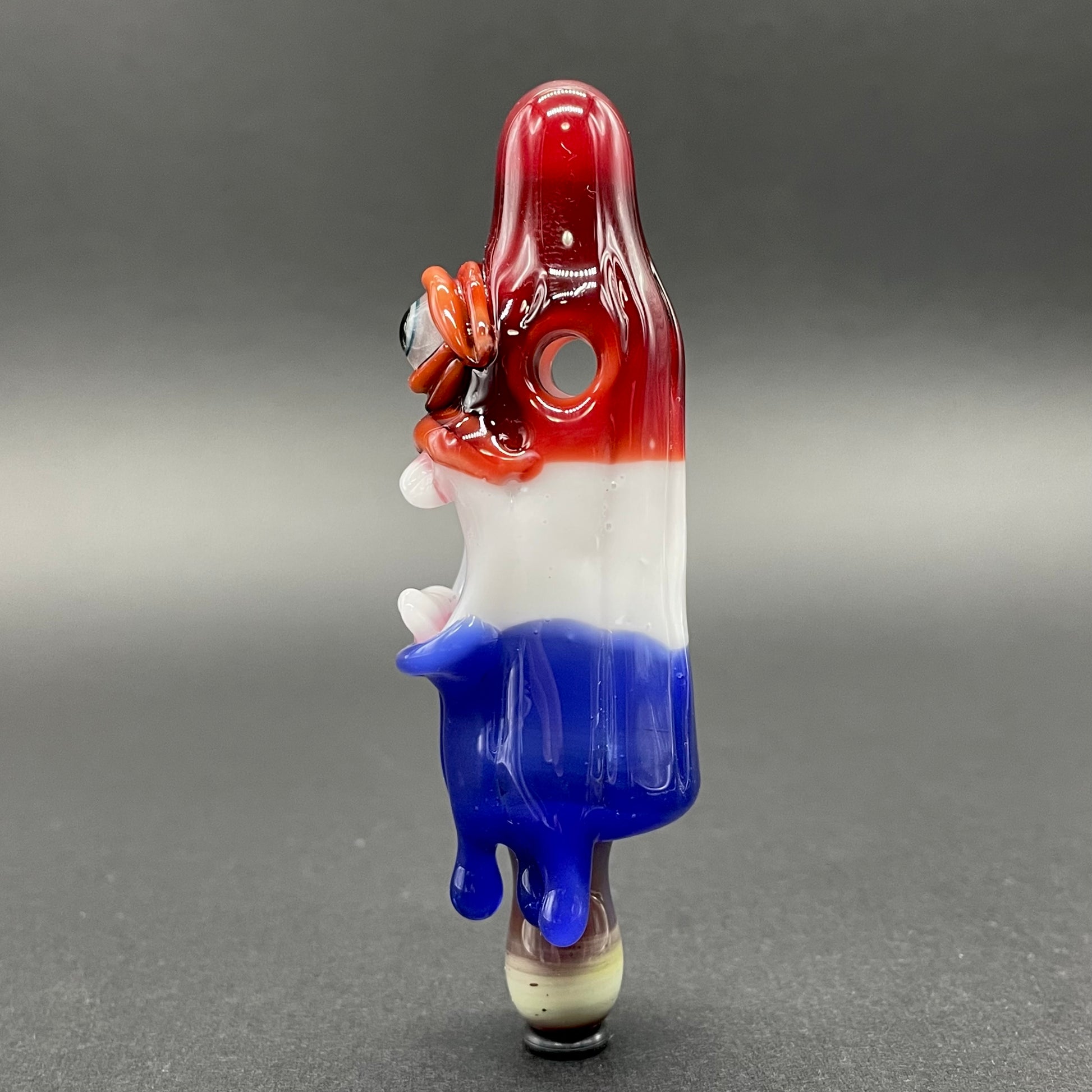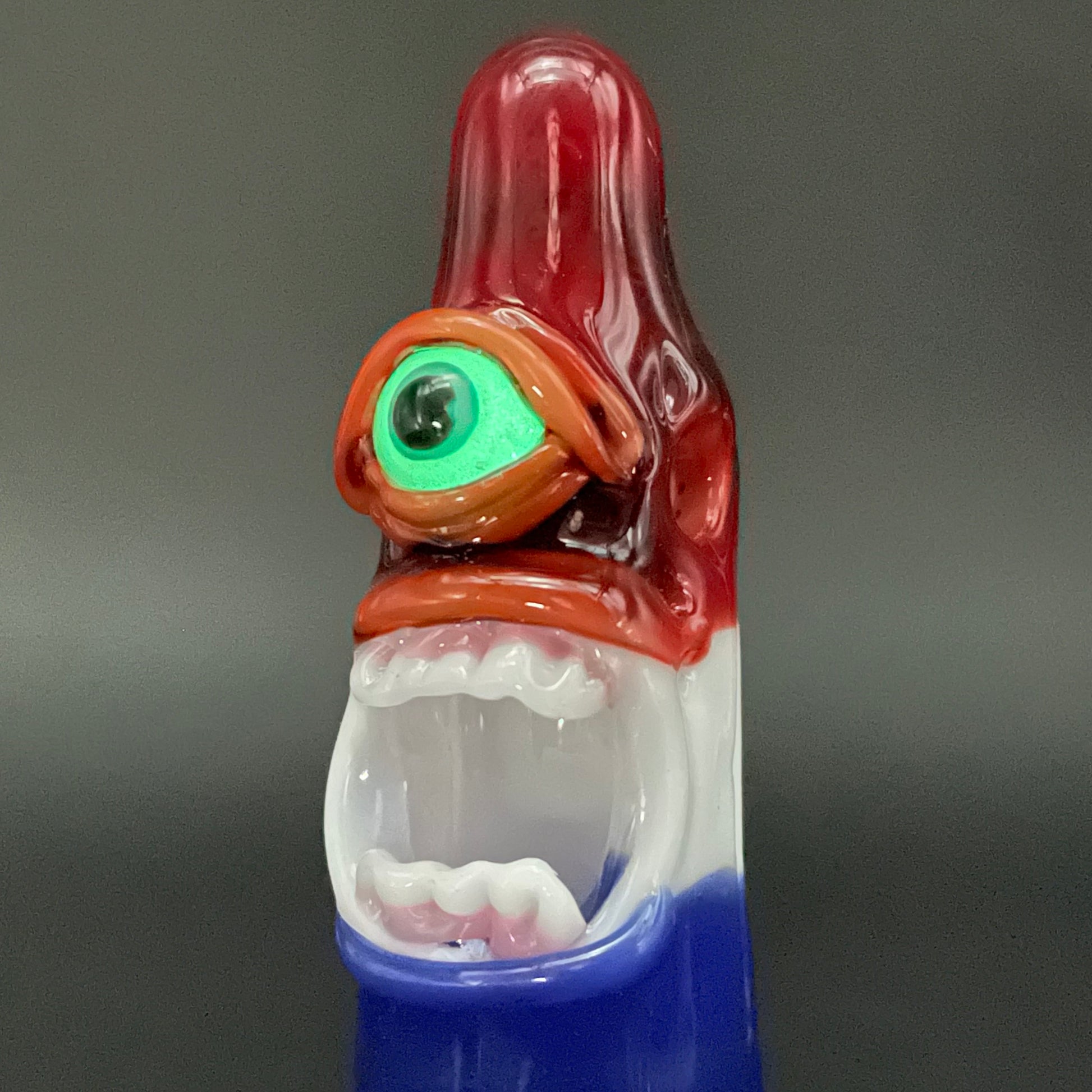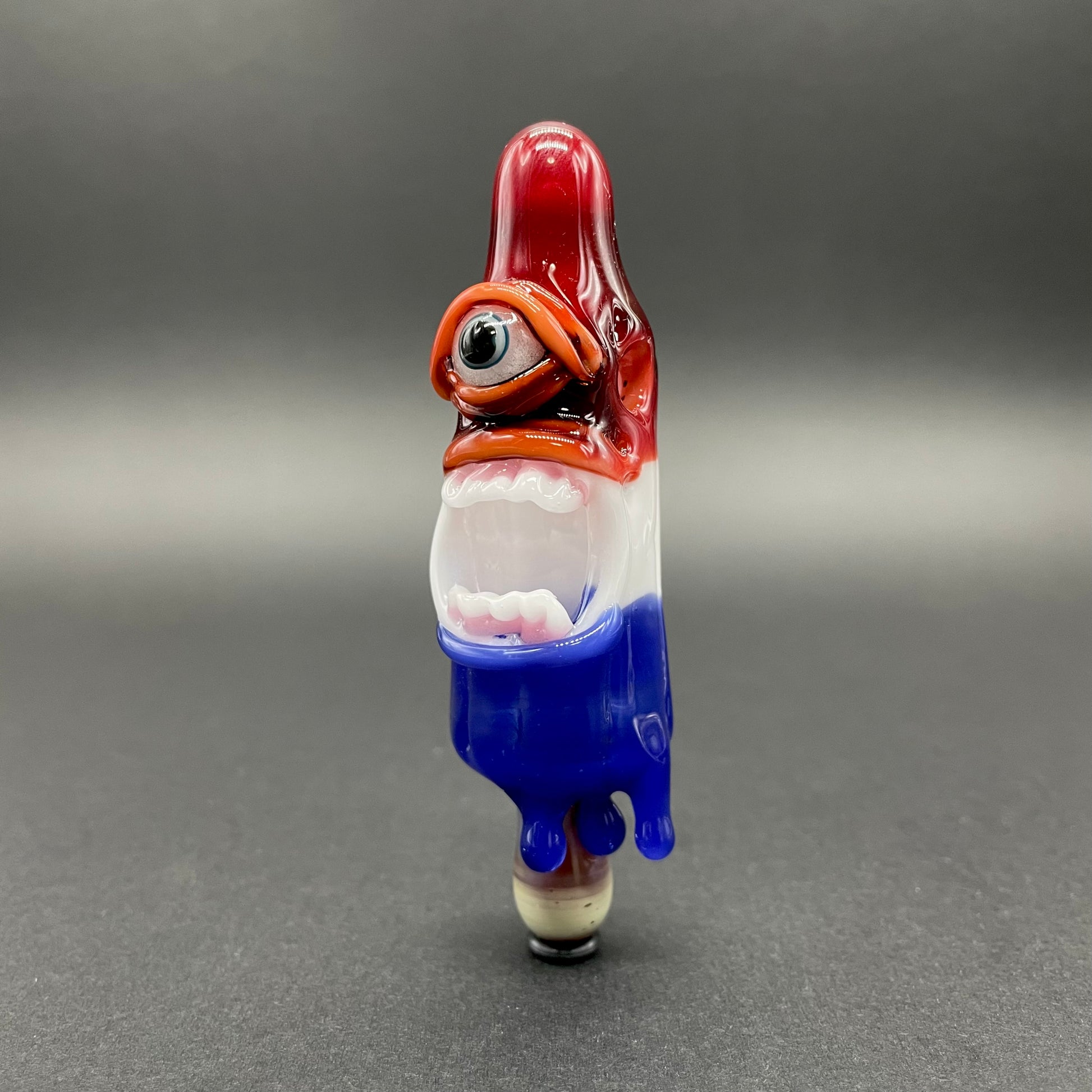 This popsicle pendant features a glow in the dark eye and screaming mouth adorned with a gold enamel tooth. Three flavored layers cherry, lemon, and blue. What flavor is blue anyway?