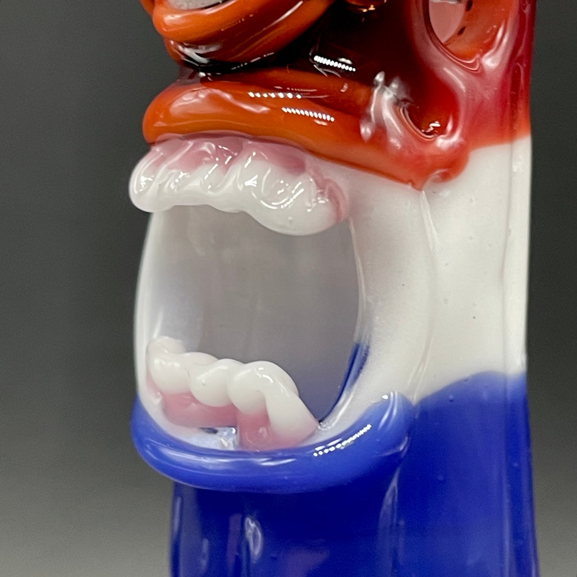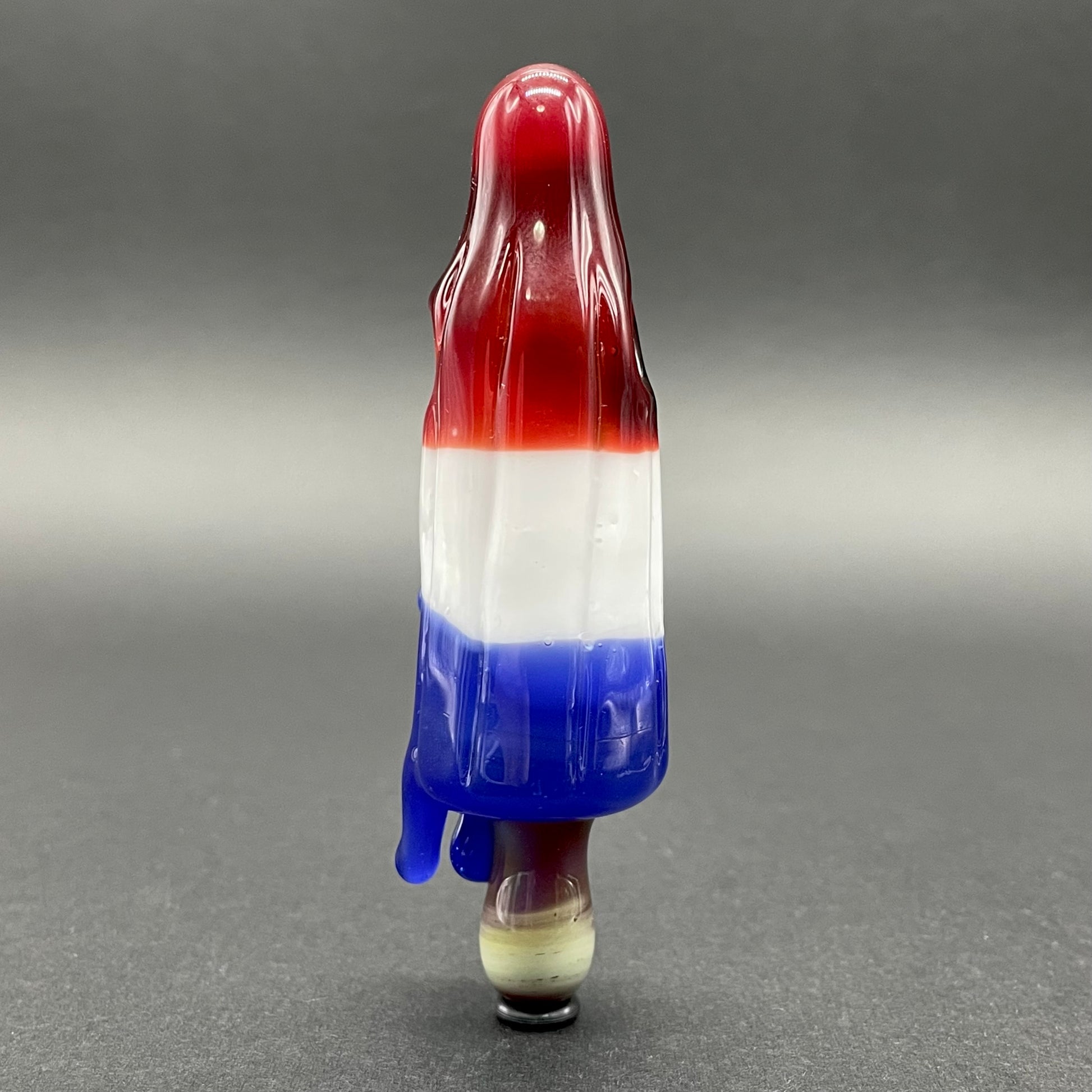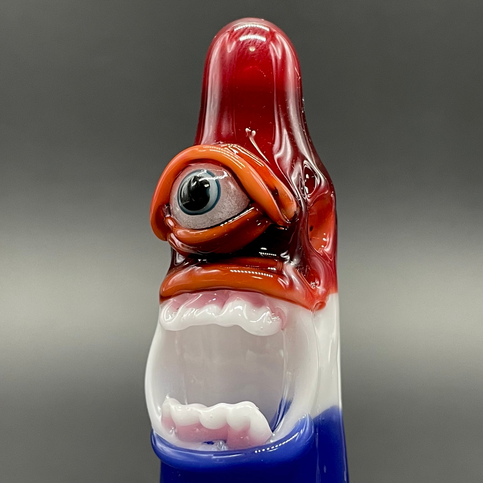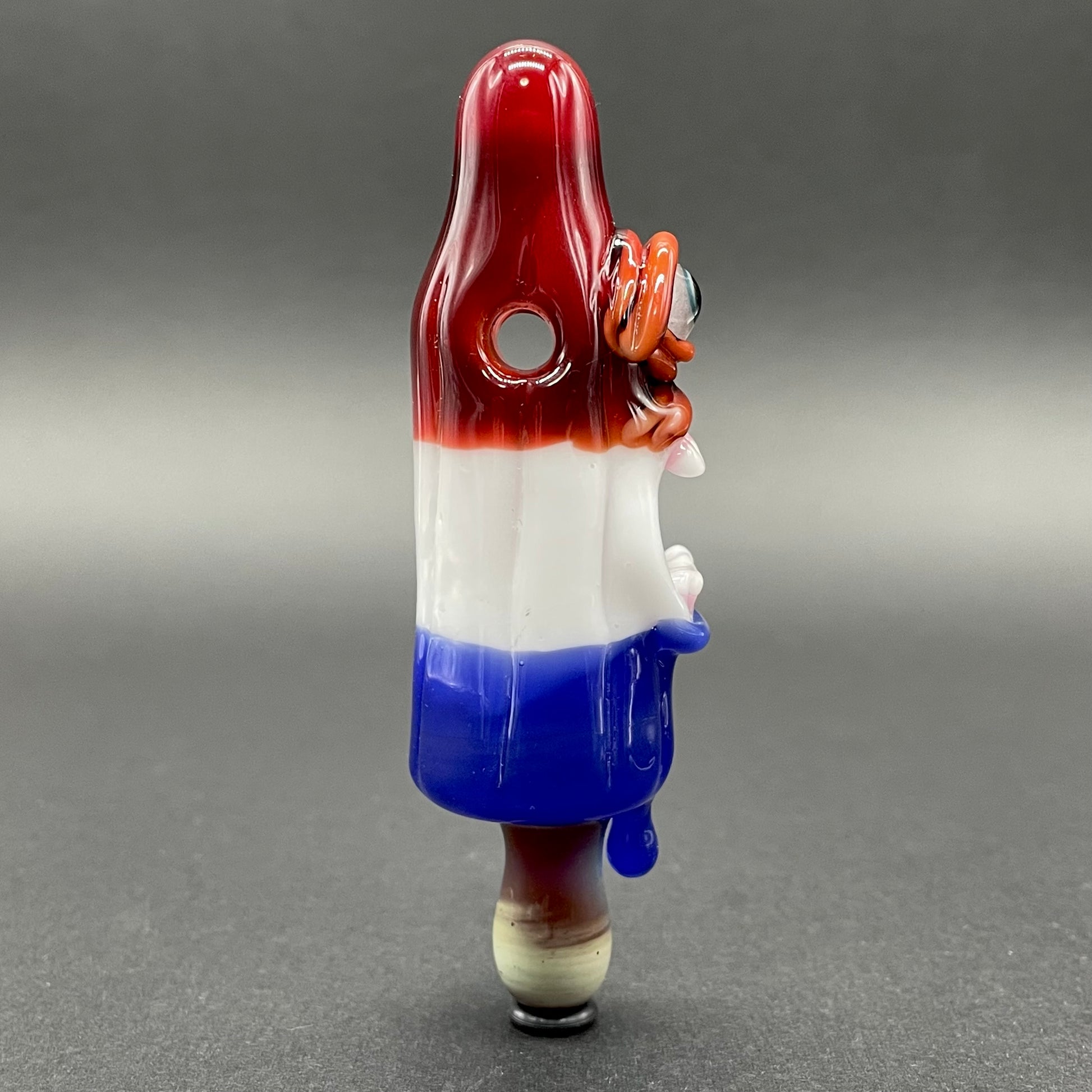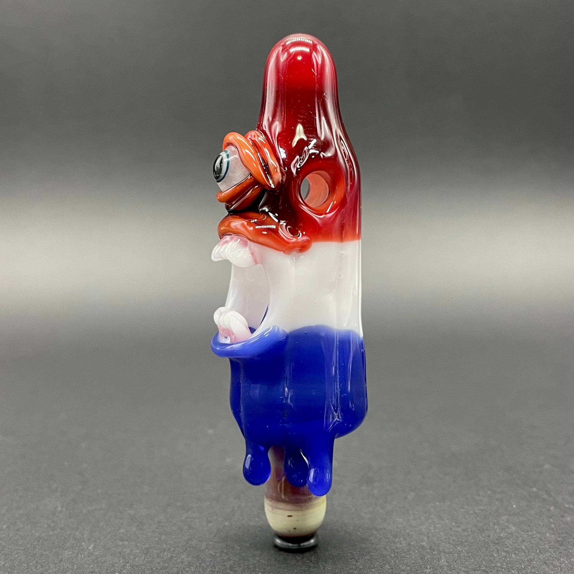 This popsicle pendant features a glow in the dark eye and screaming mouth adorned with a gold enamel tooth. Three flavored layers cherry, lemon, and blue. What flavor is blue anyway?