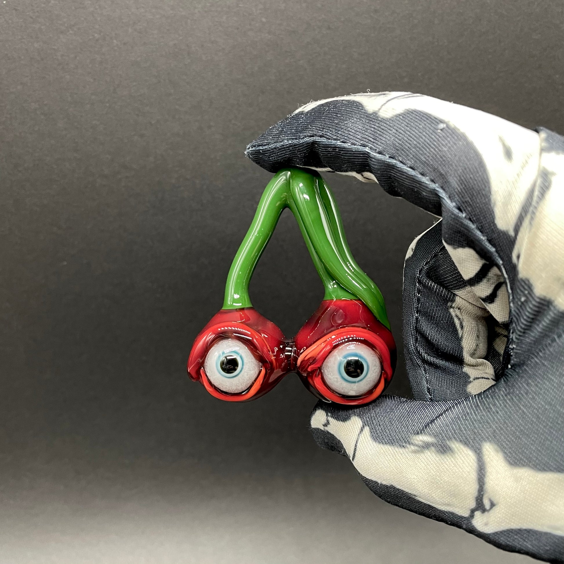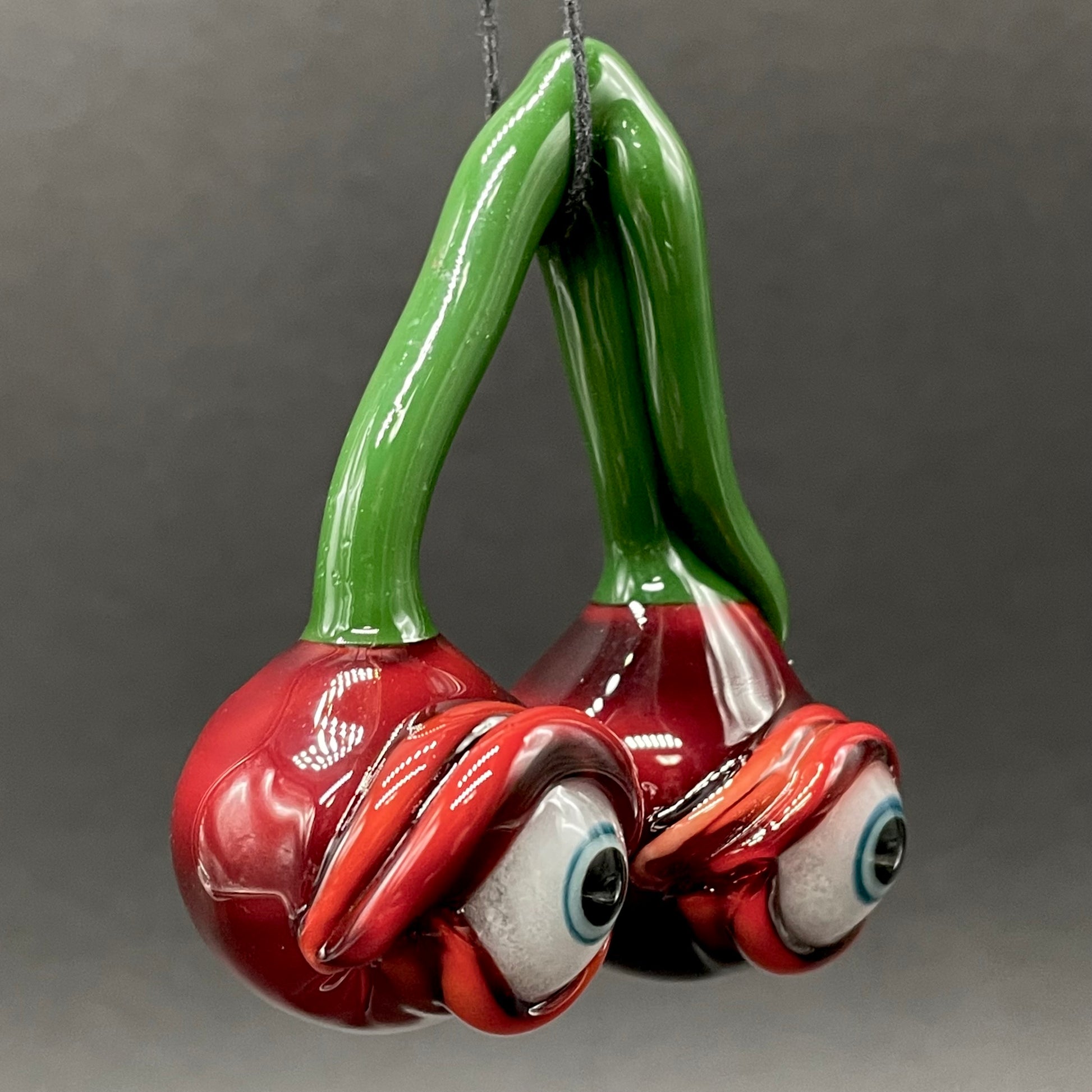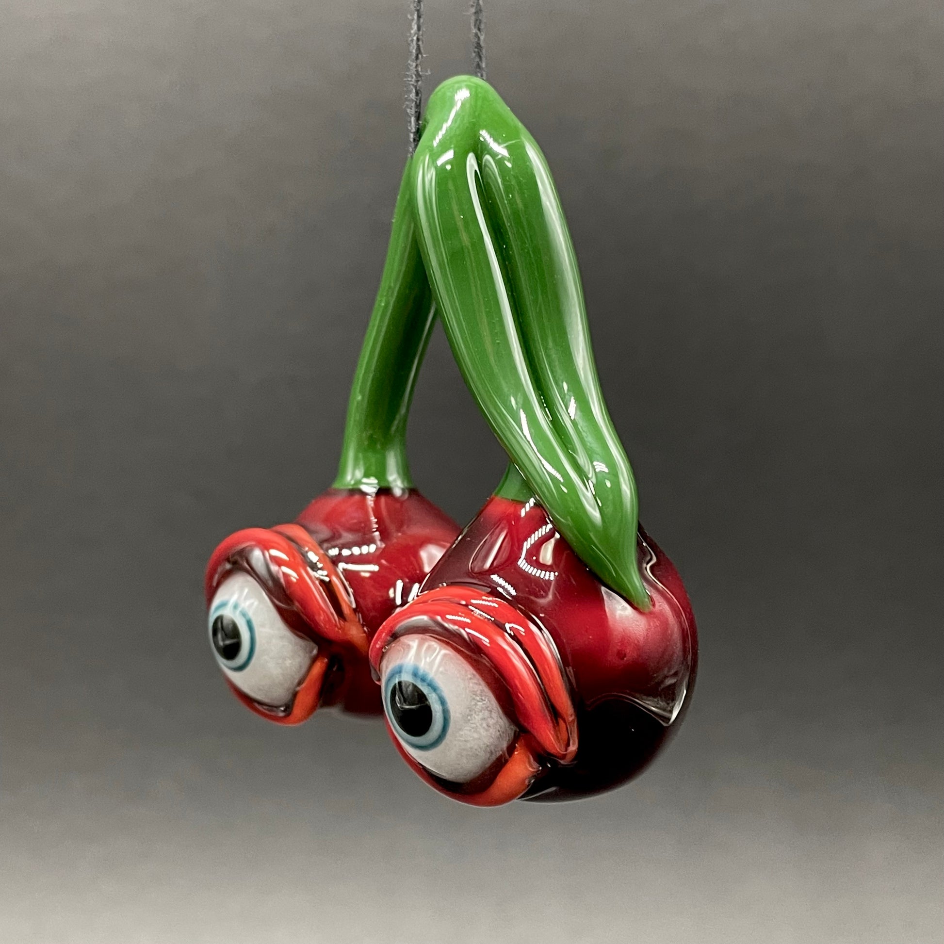 This unique glass pendant features two bright red cherries both with glow in the dark eyes
