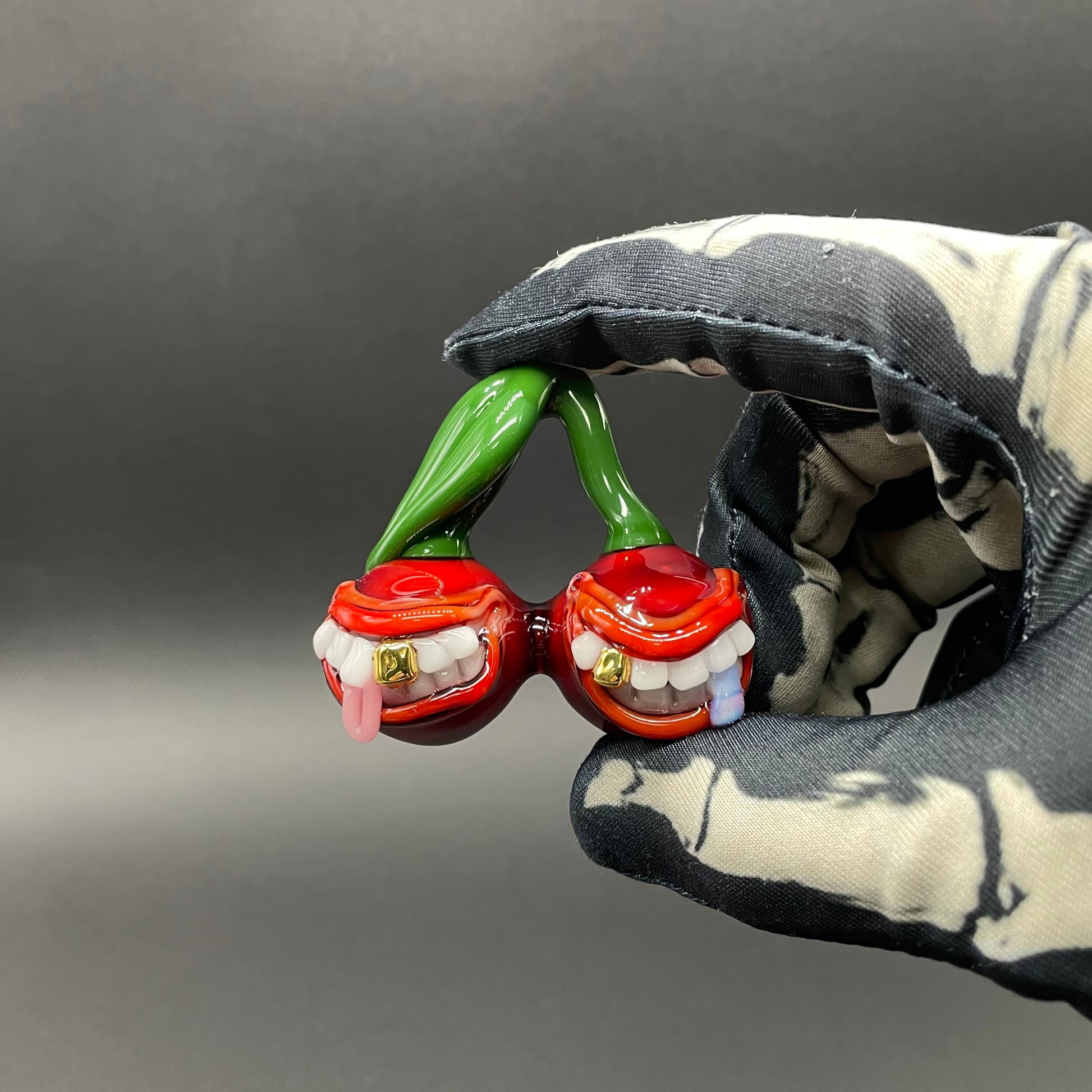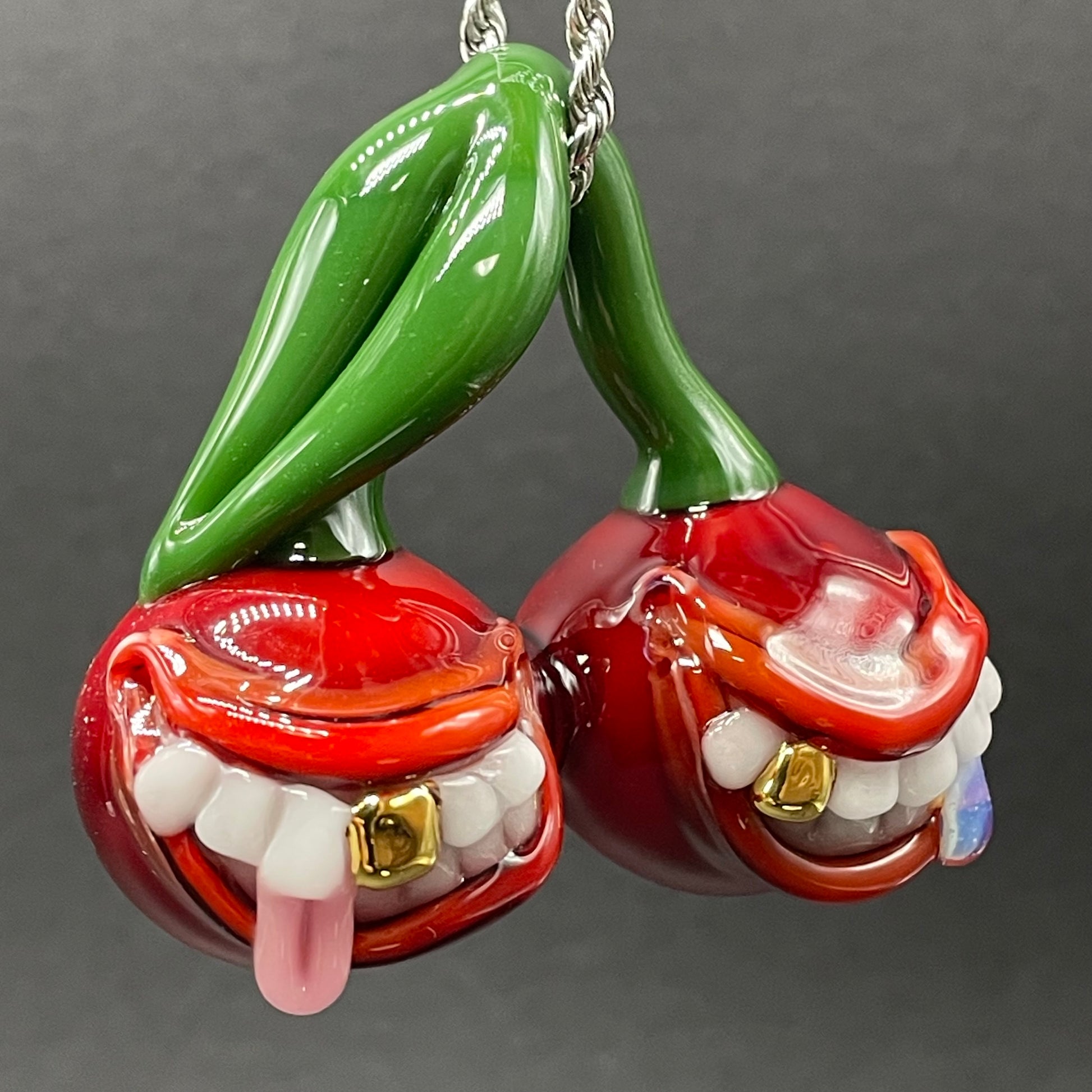 This hand blown glass pendant features two deep red cherries, only these aren’t the sweet kind. Each cherry is adorned with a toothy grin, complete with gleaming gold enamel teeth. Equal parts playful and unsettling, it’s a bold statement piece for anyone with a taste for the unusual.
