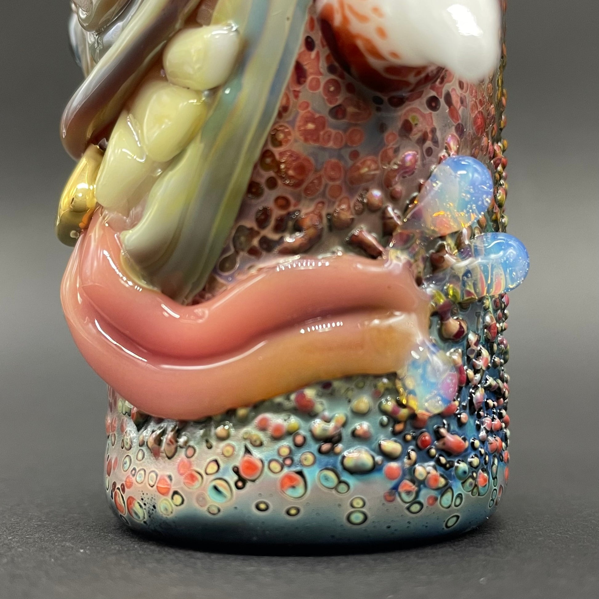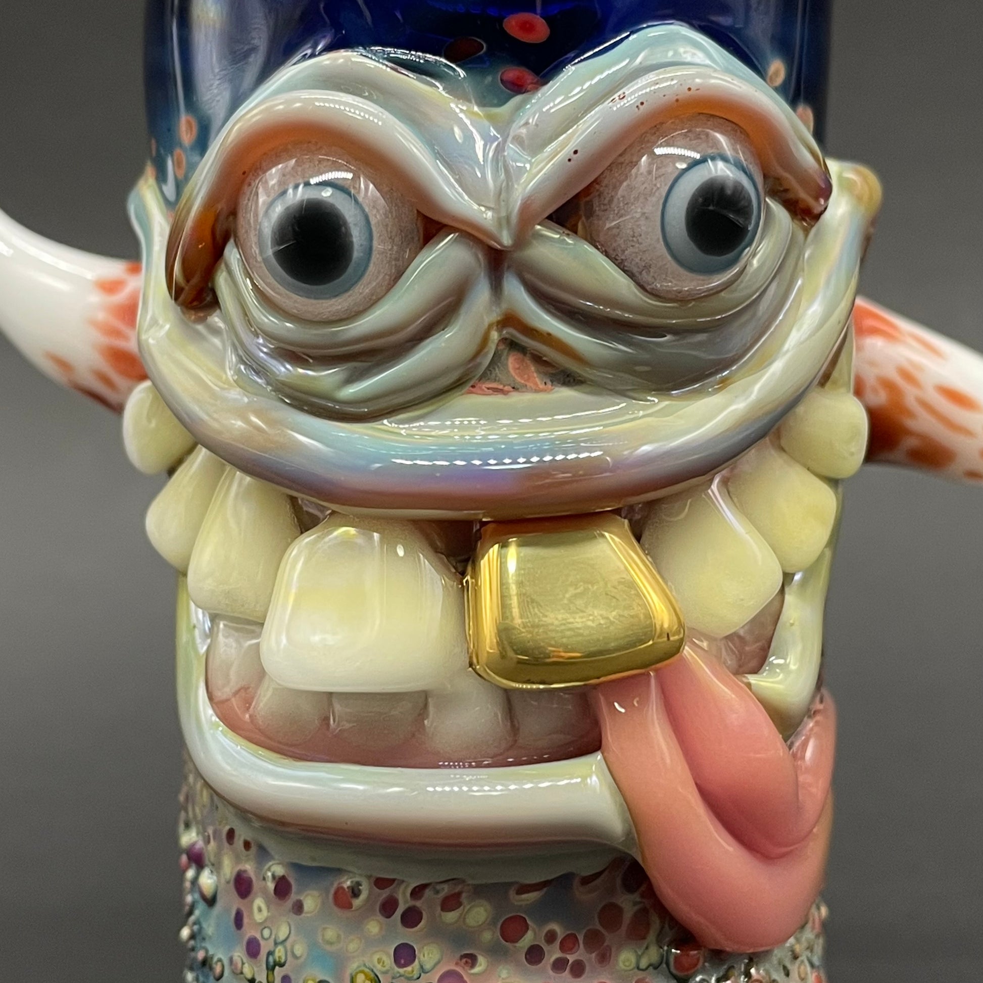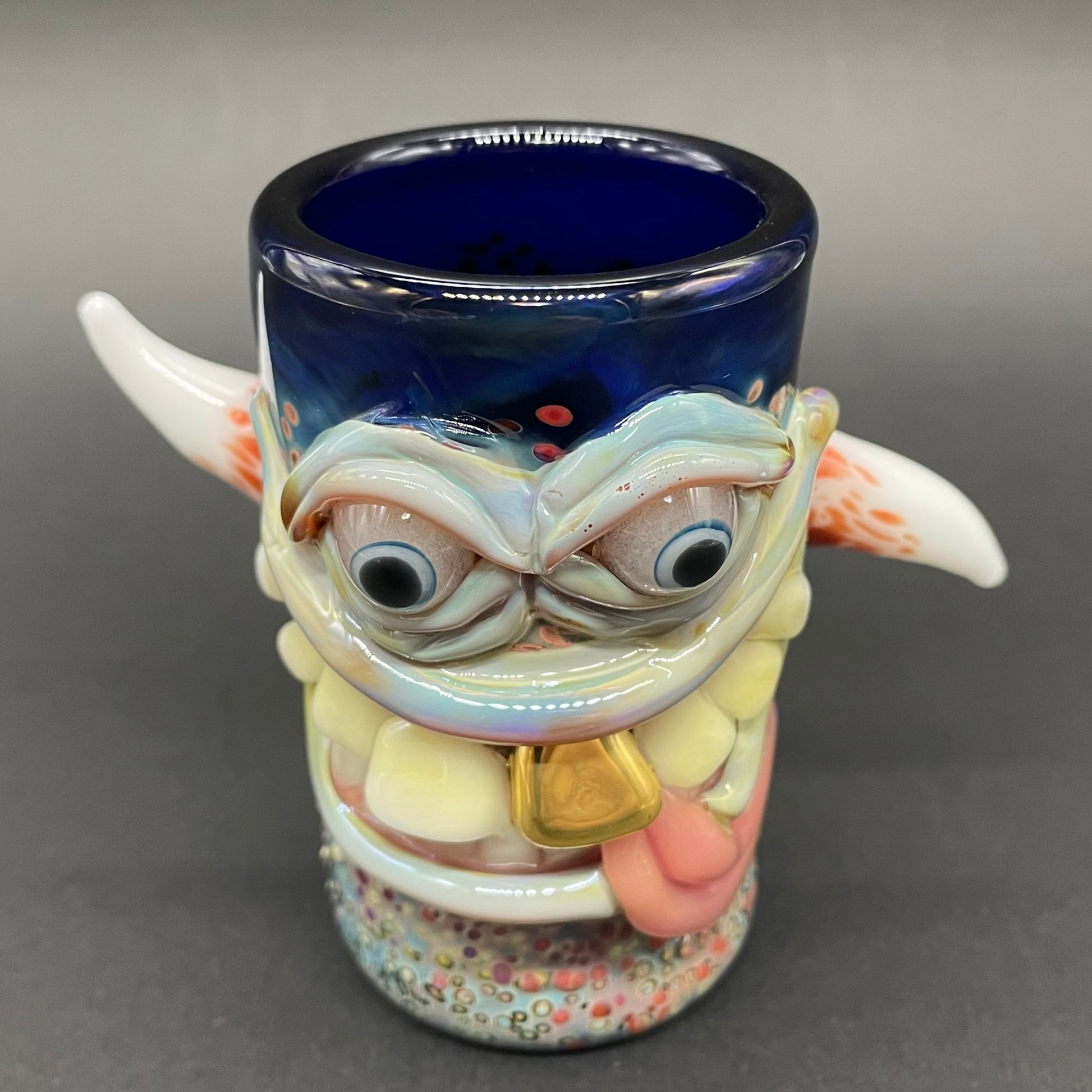 This cross eyed doofus shot glass sports a goofy grin with a gleaming gold tooth and two crossed glow in the dark eyes. Quirky, weird, and full of character, it’s a one of a kind piece of glass that’s sure to get a laugh.