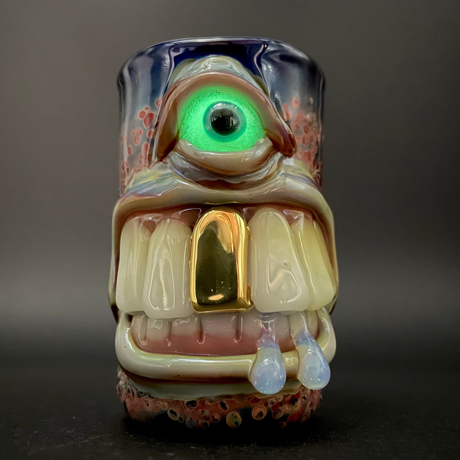 Big ole chompers on this one! This hand-blown cyclops shot glass features a huge gold enamel tooth grinning wide and a single glow in the dark eye that stares right back at you. Both creepy and playful, it’s a true conversation starter.