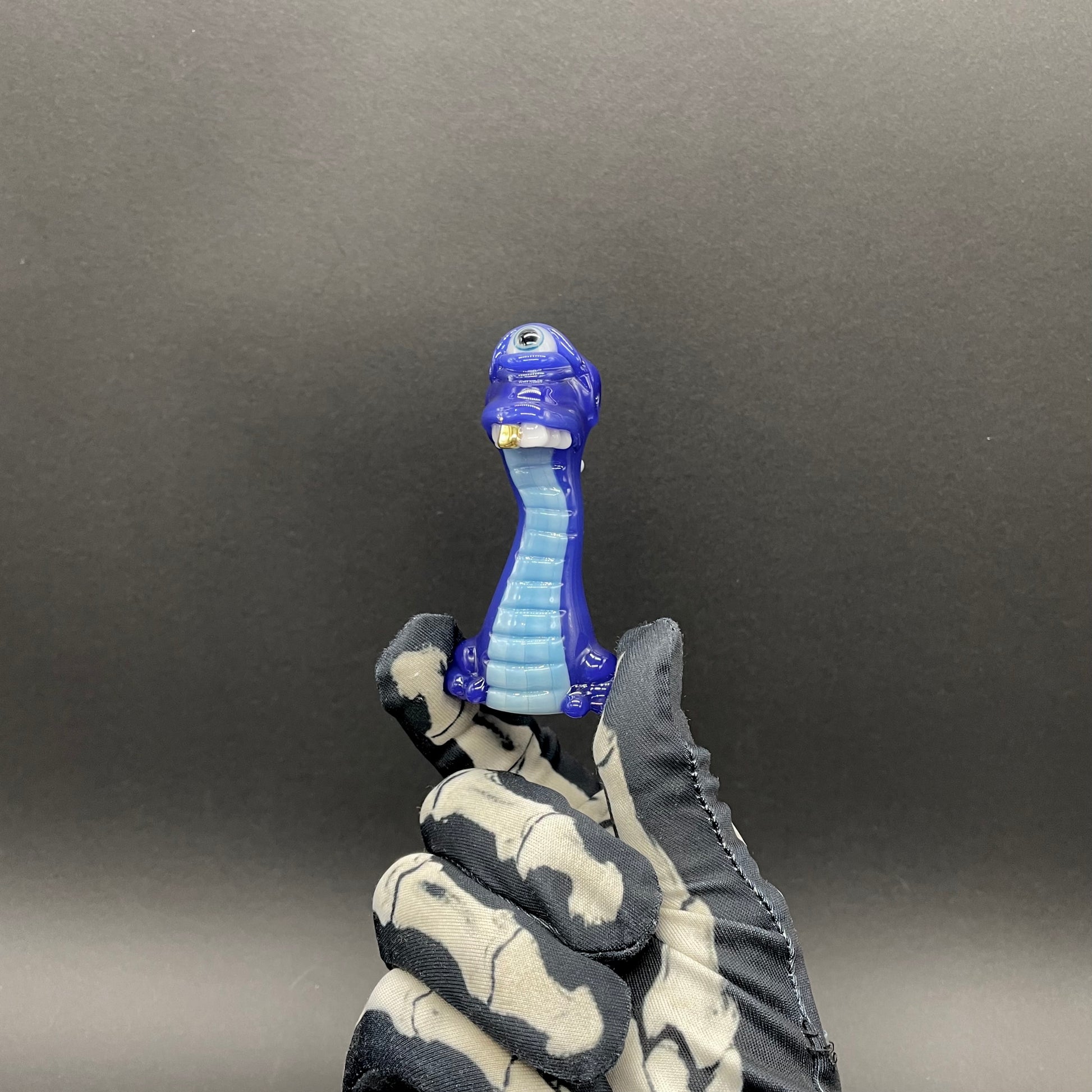 This hand-blown blue glass pendant features a dinosaur-like monster with a gleaming gold tooth in its exaggerated overbite. A single glow-in the dark eye stares knowingly into the beyond.