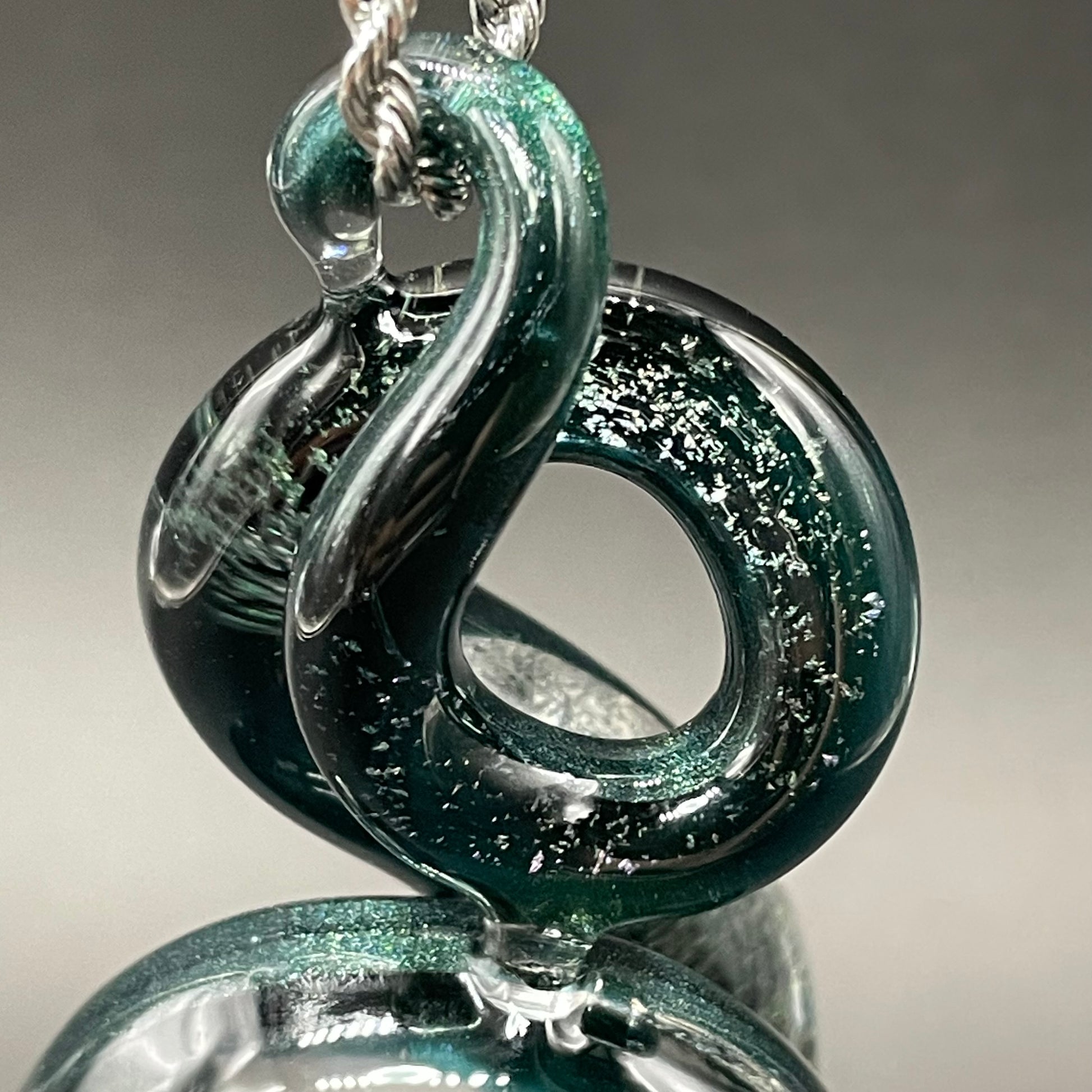 This hand blown pendant features a flowing, twisty form crafted from dichroic glass, a material that shimmers with incredible sparkle and shifting colors. No photo can truly capture the way it reflects and dances with light in person. I’ve done my best with the camera, but its magic is something you really need to see with your own eyes.