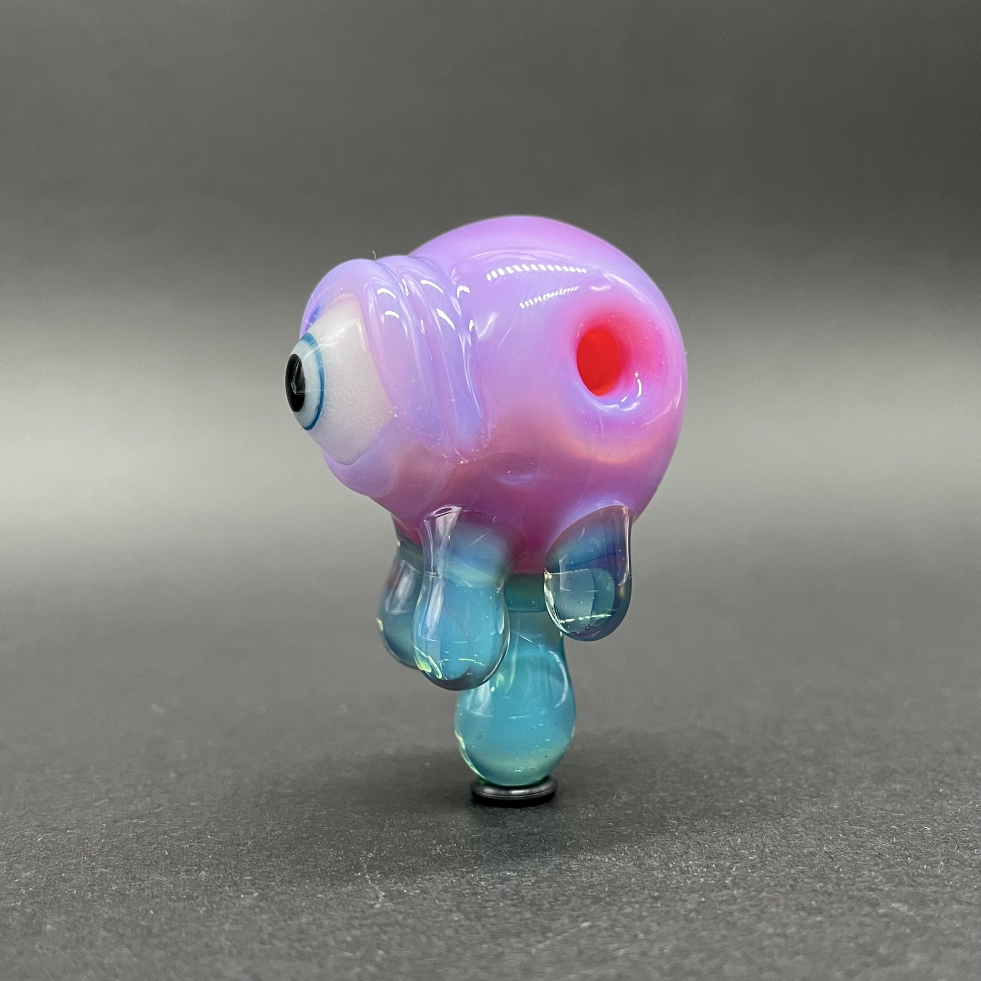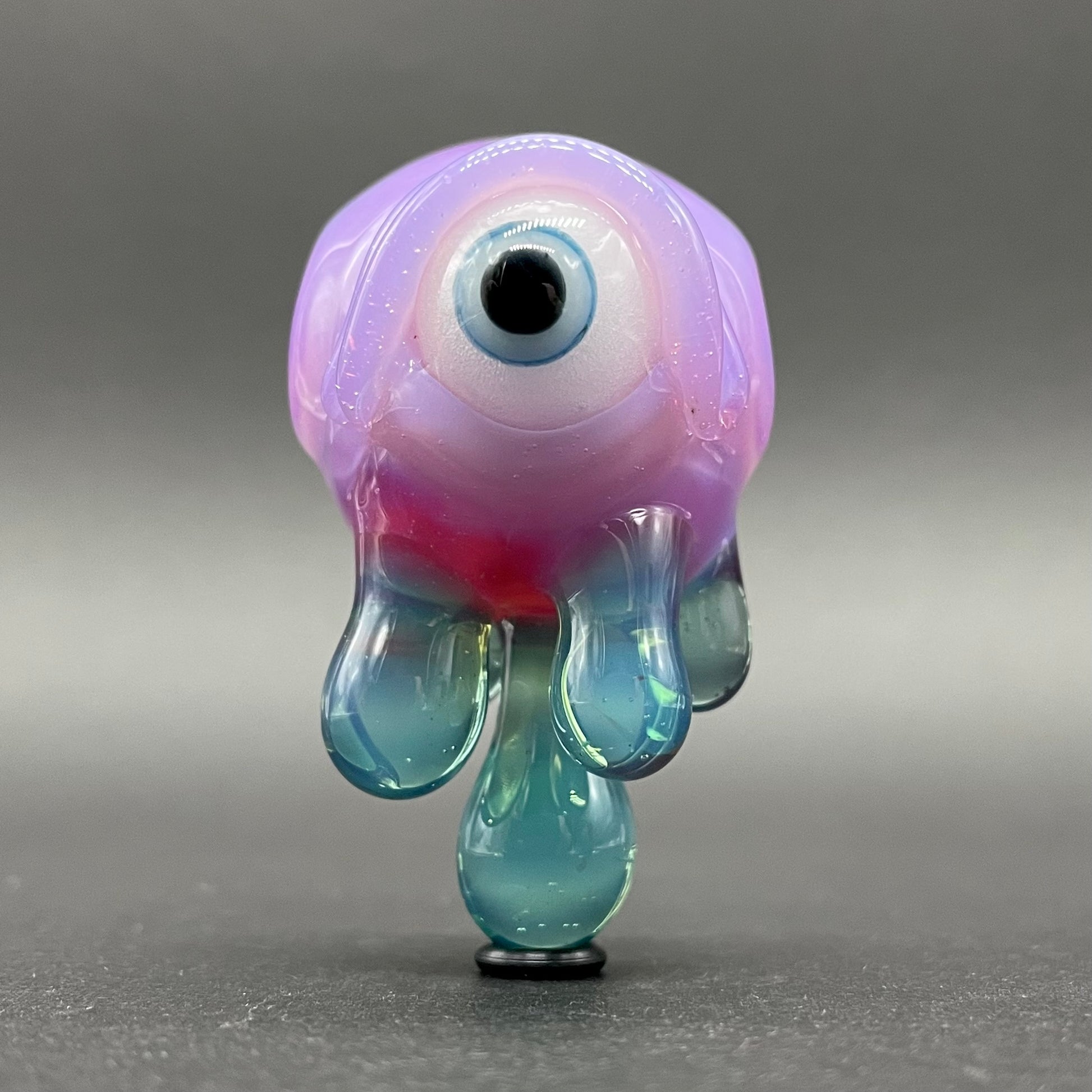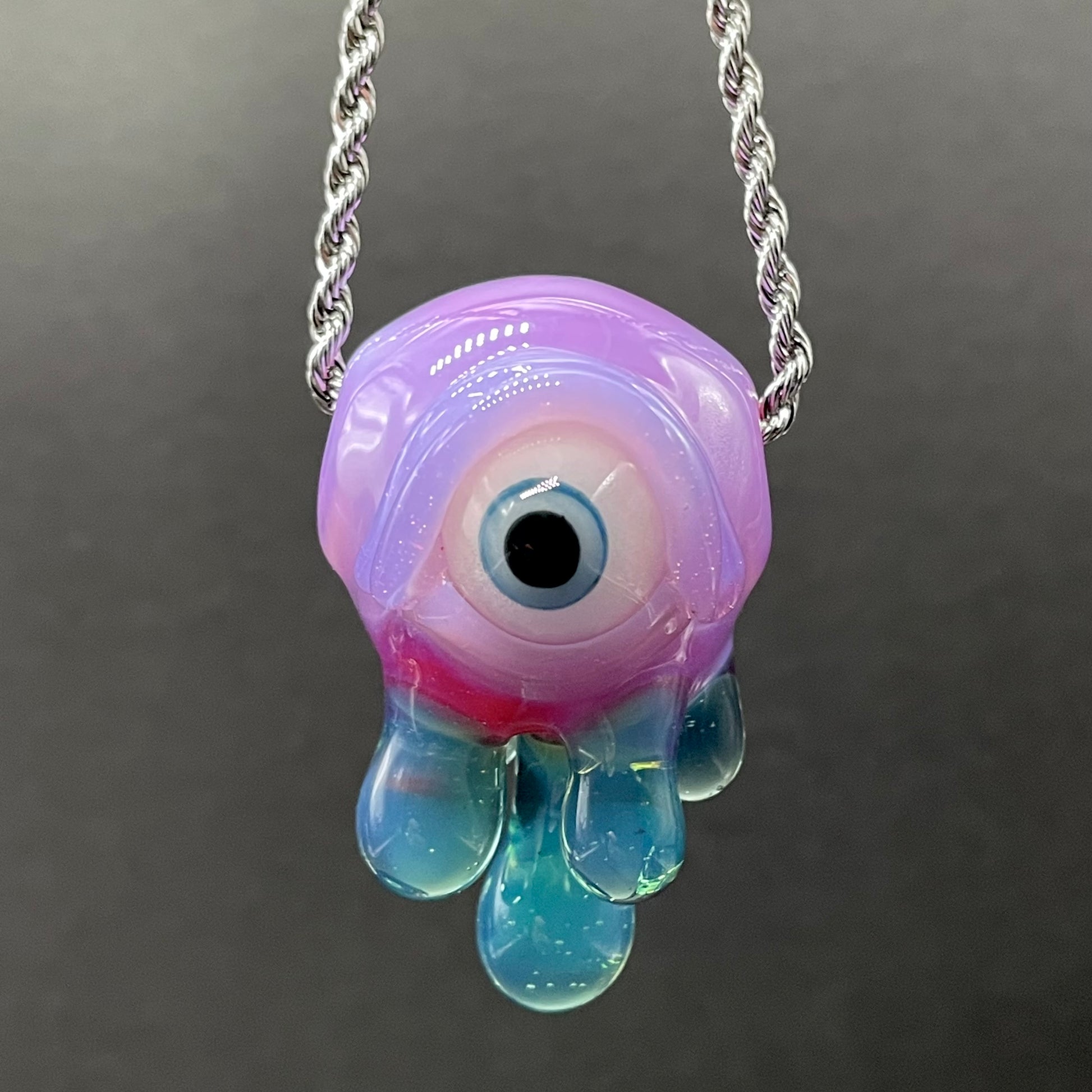 This eerie hand-blown glass pendant features a striking red sphere with a single glowing eye that comes alive in the dark. Dripping with vivid blue glass droplets, this piece captures a surreal, otherworldly vibe. Equal parts haunting and beautiful. Perfect for collectors of unique glass art or anyone who loves statement jewelry that stands out day or night