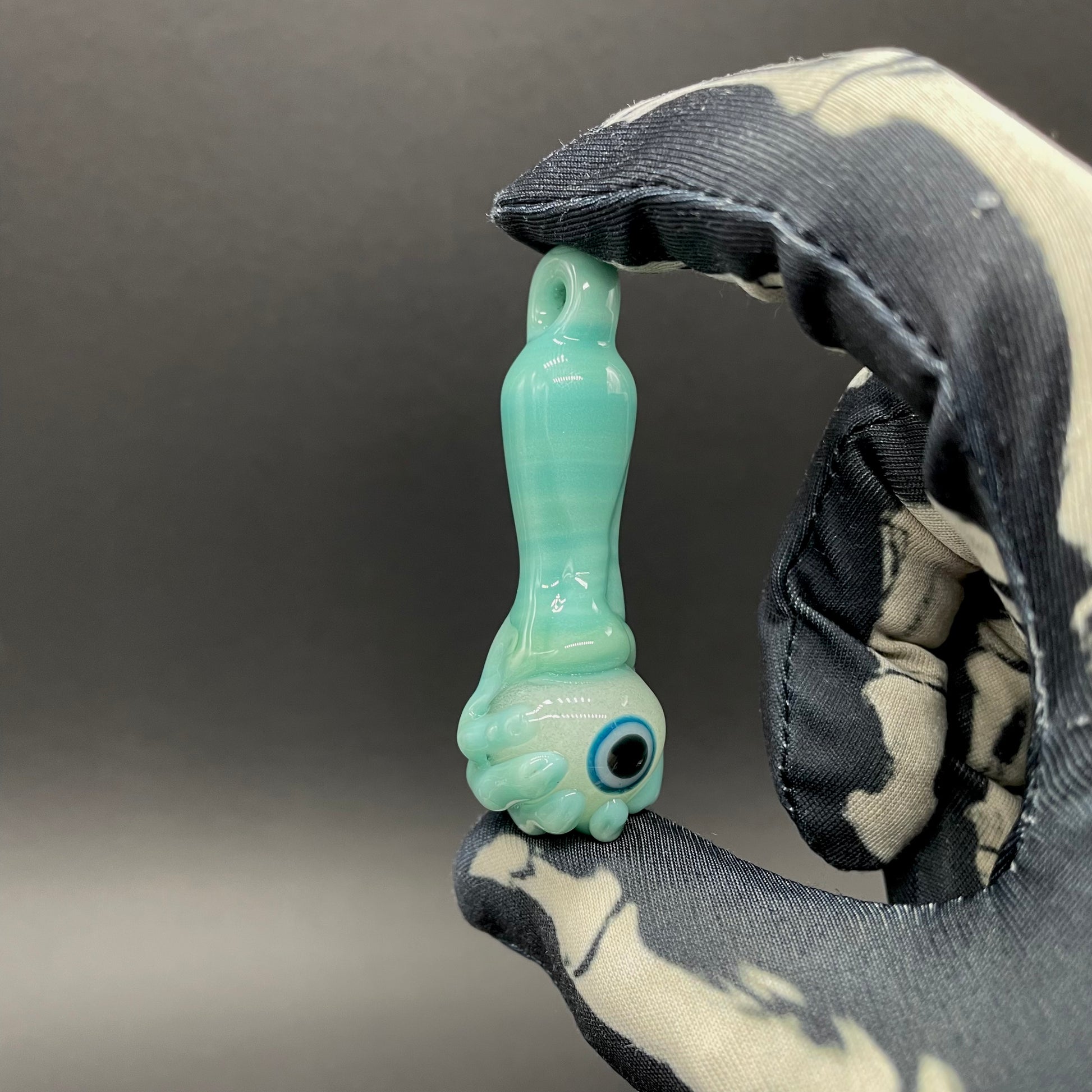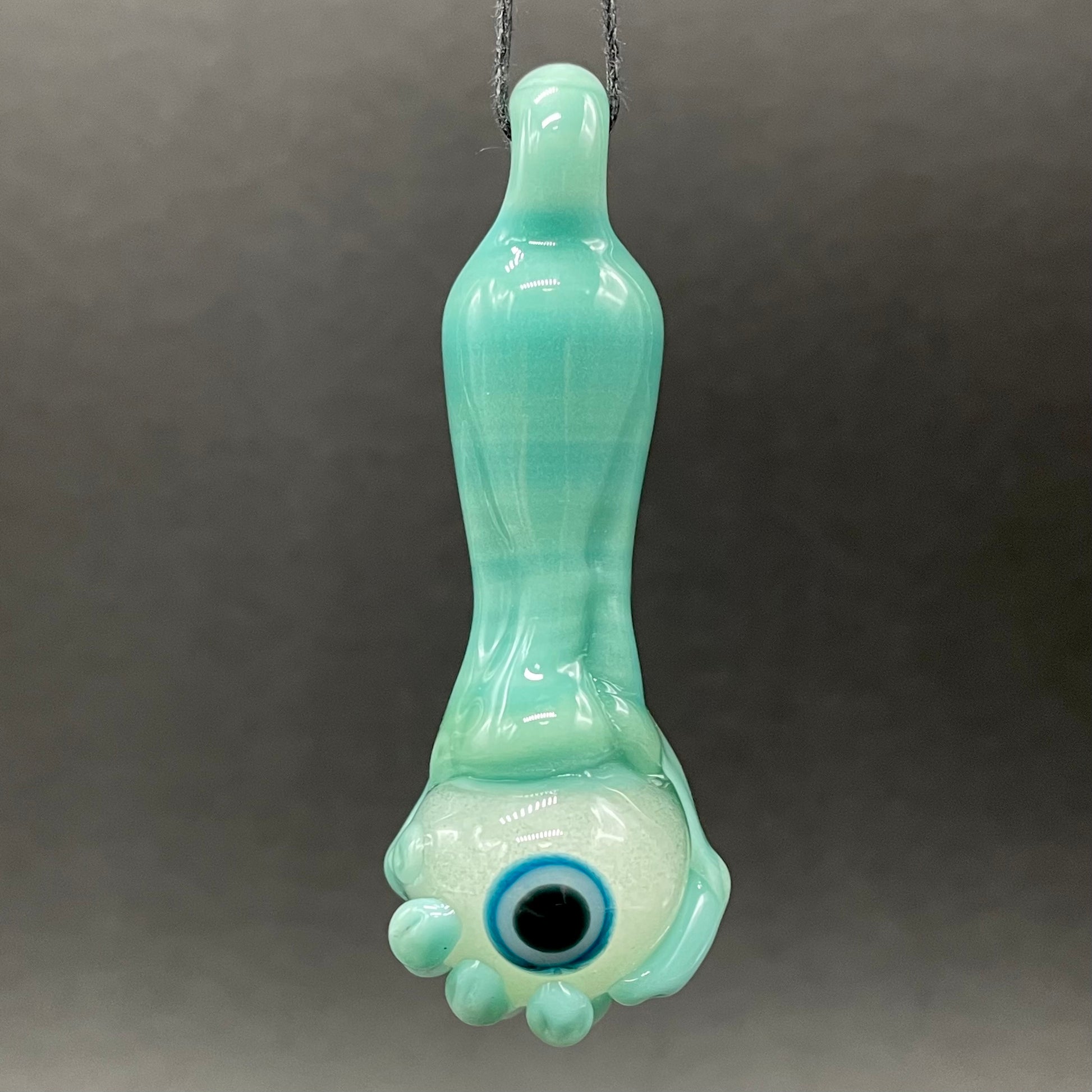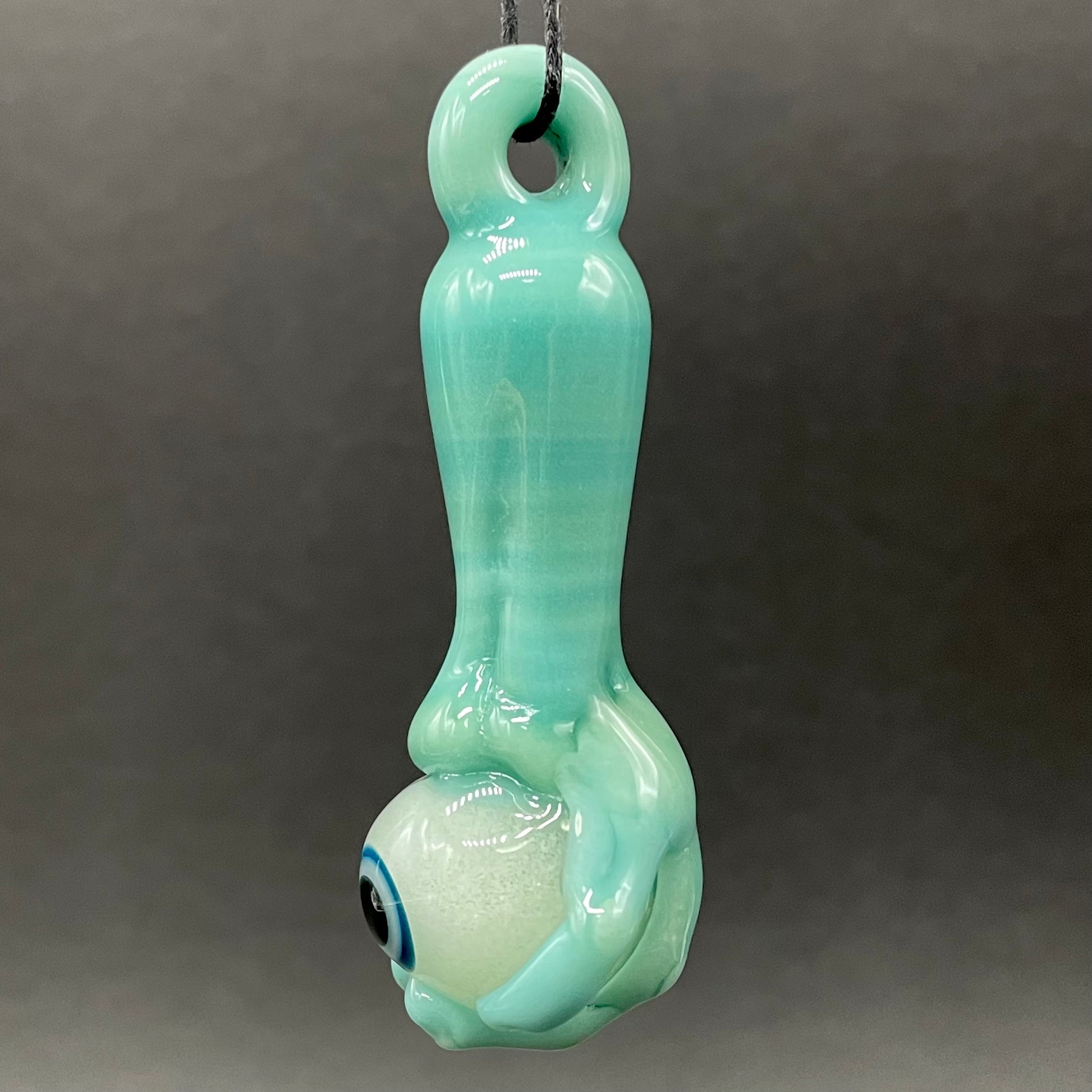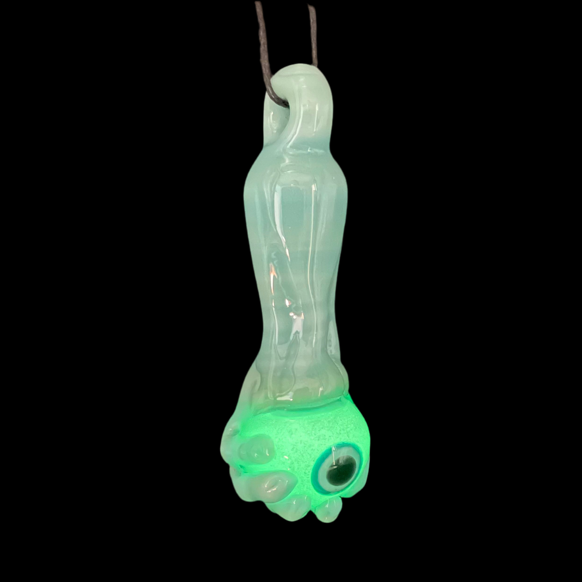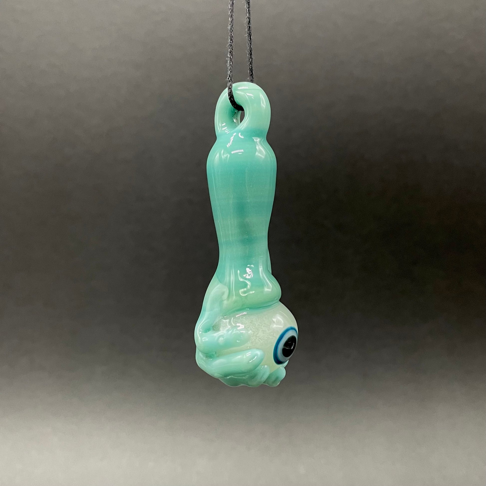 I guess this is what putting contact lenses in feels like. This glass pendant features a blue hand holding a glow in the dark eye.