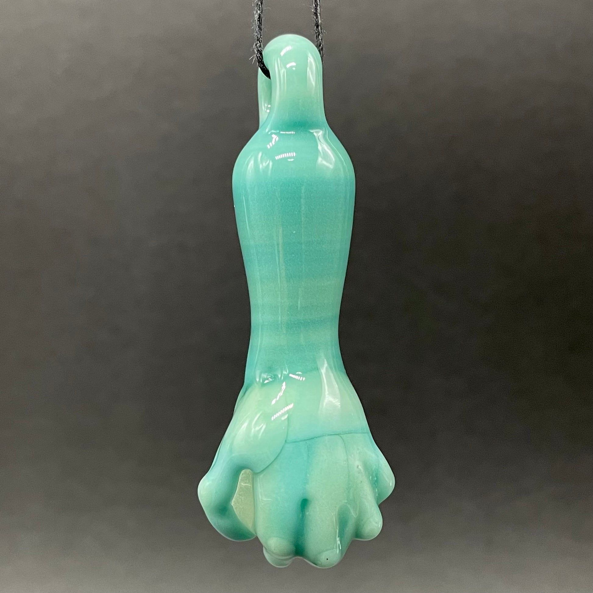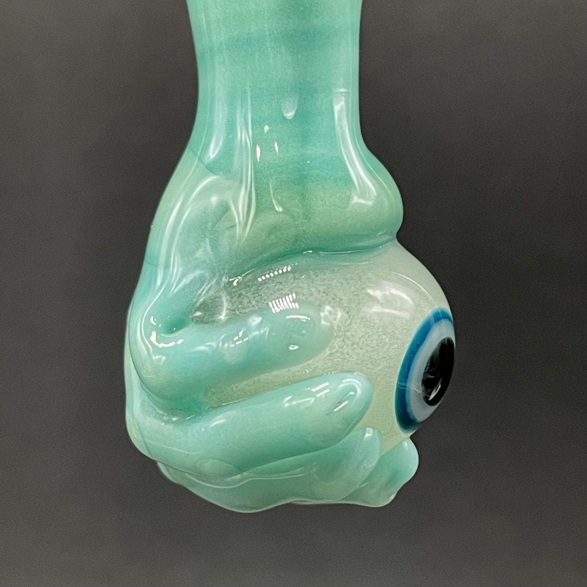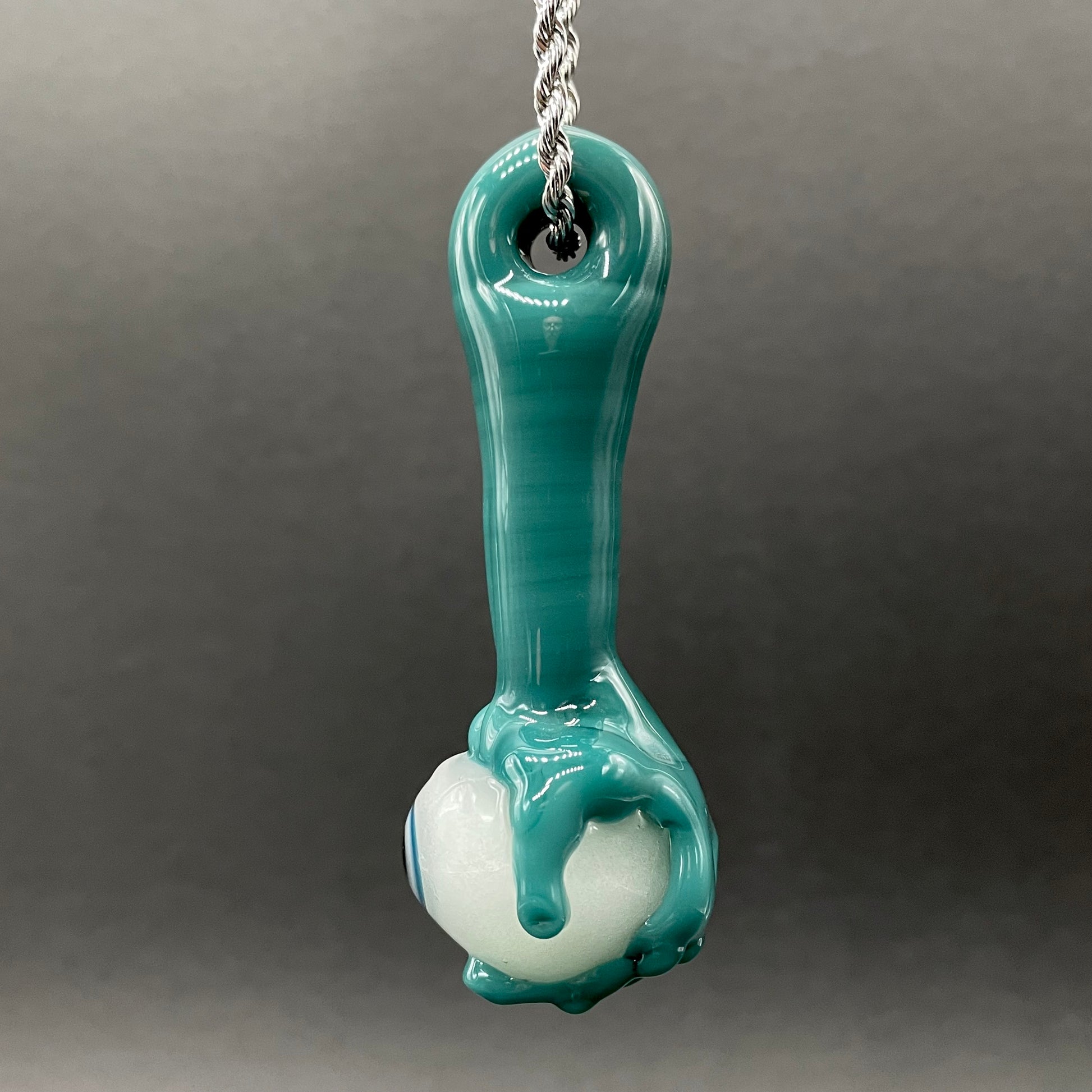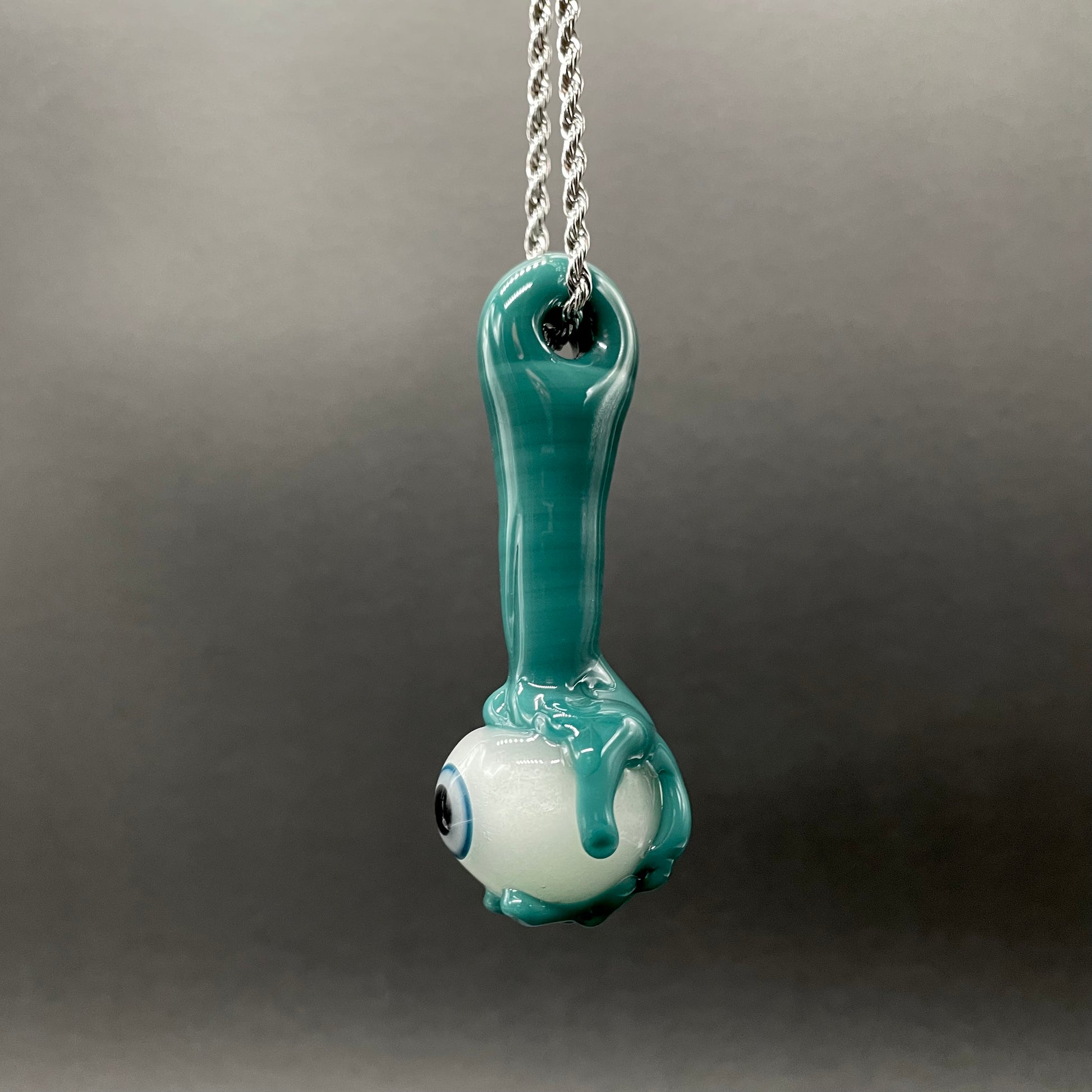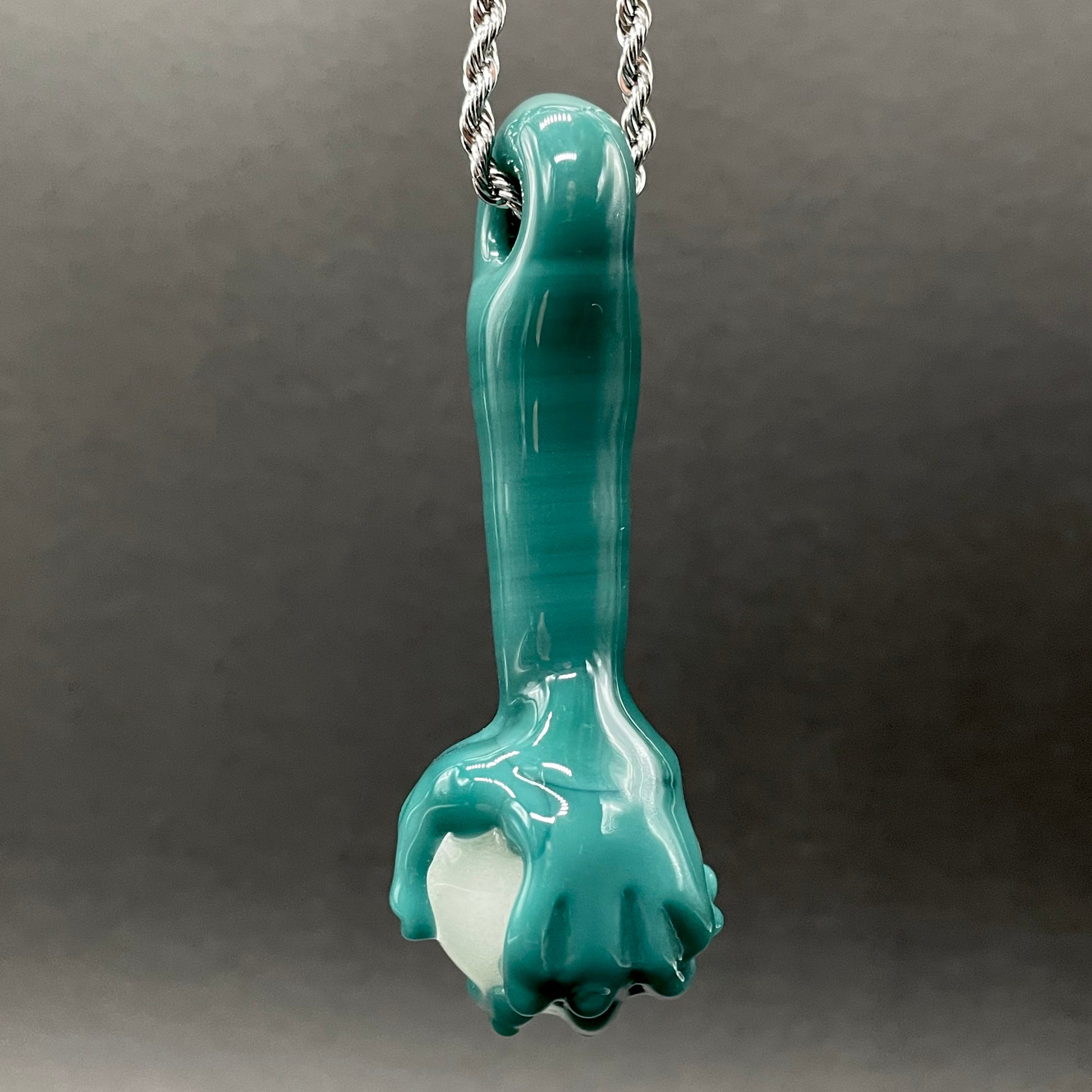 I guess this is what putting contact lenses in feels like. This glass pendant features a blue hand holding a glow in the dark eye.