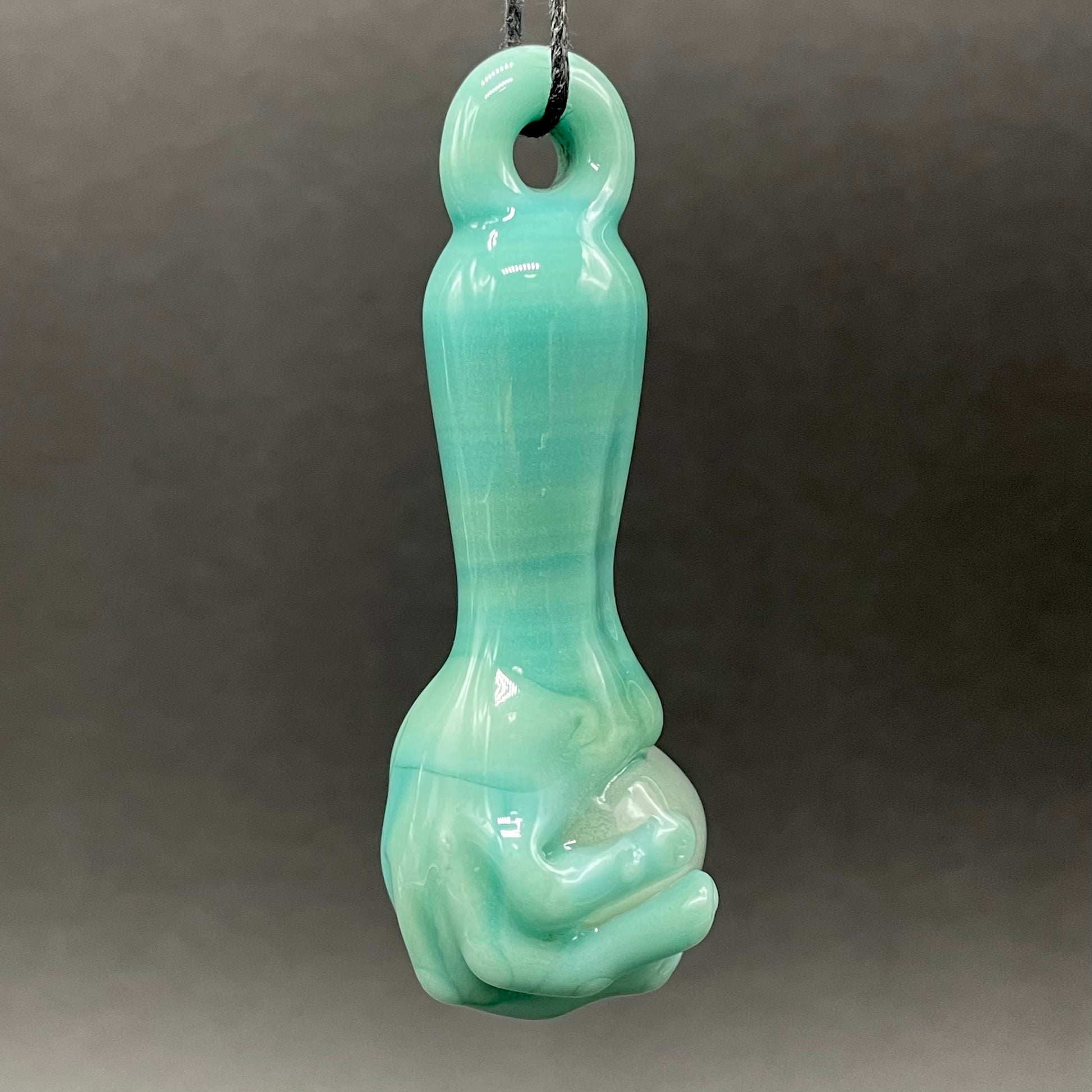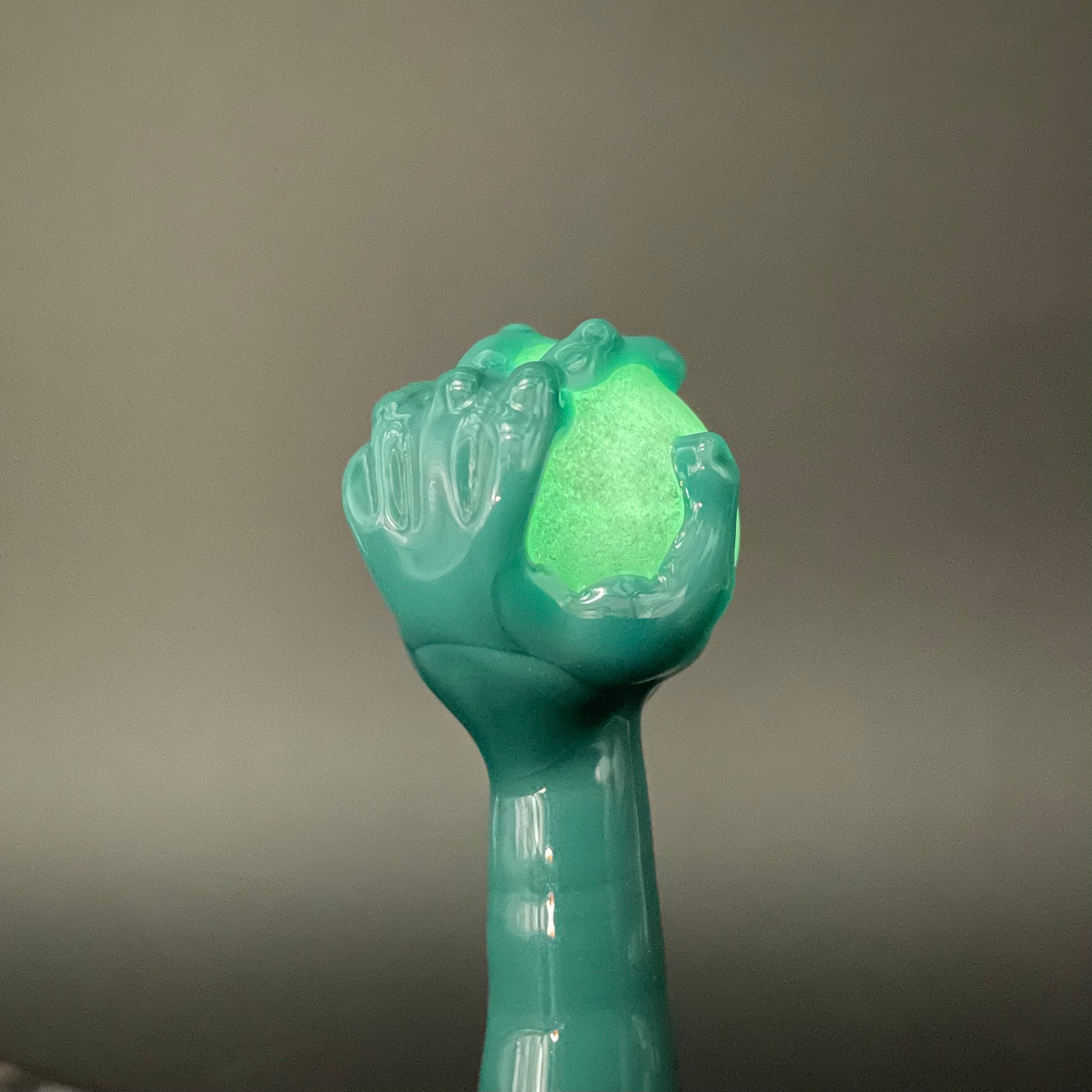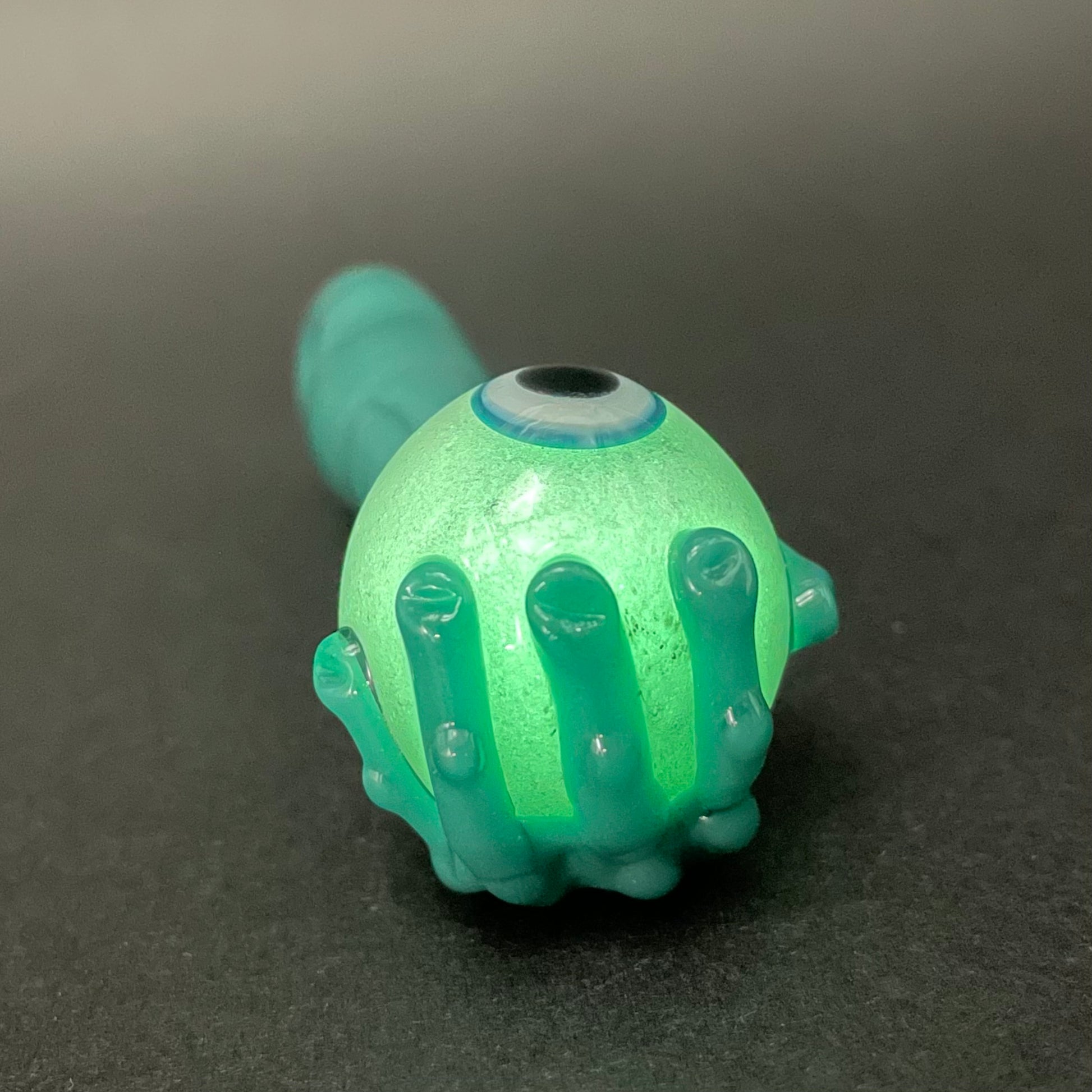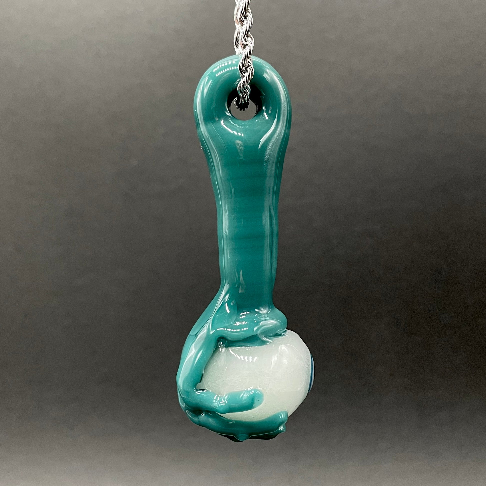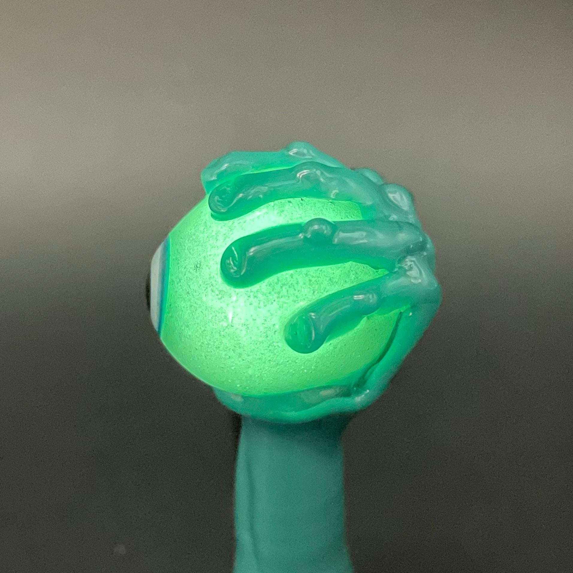 I guess this is what putting contact lenses in feels like. This glass pendant features a blue hand holding a glow in the dark eye.