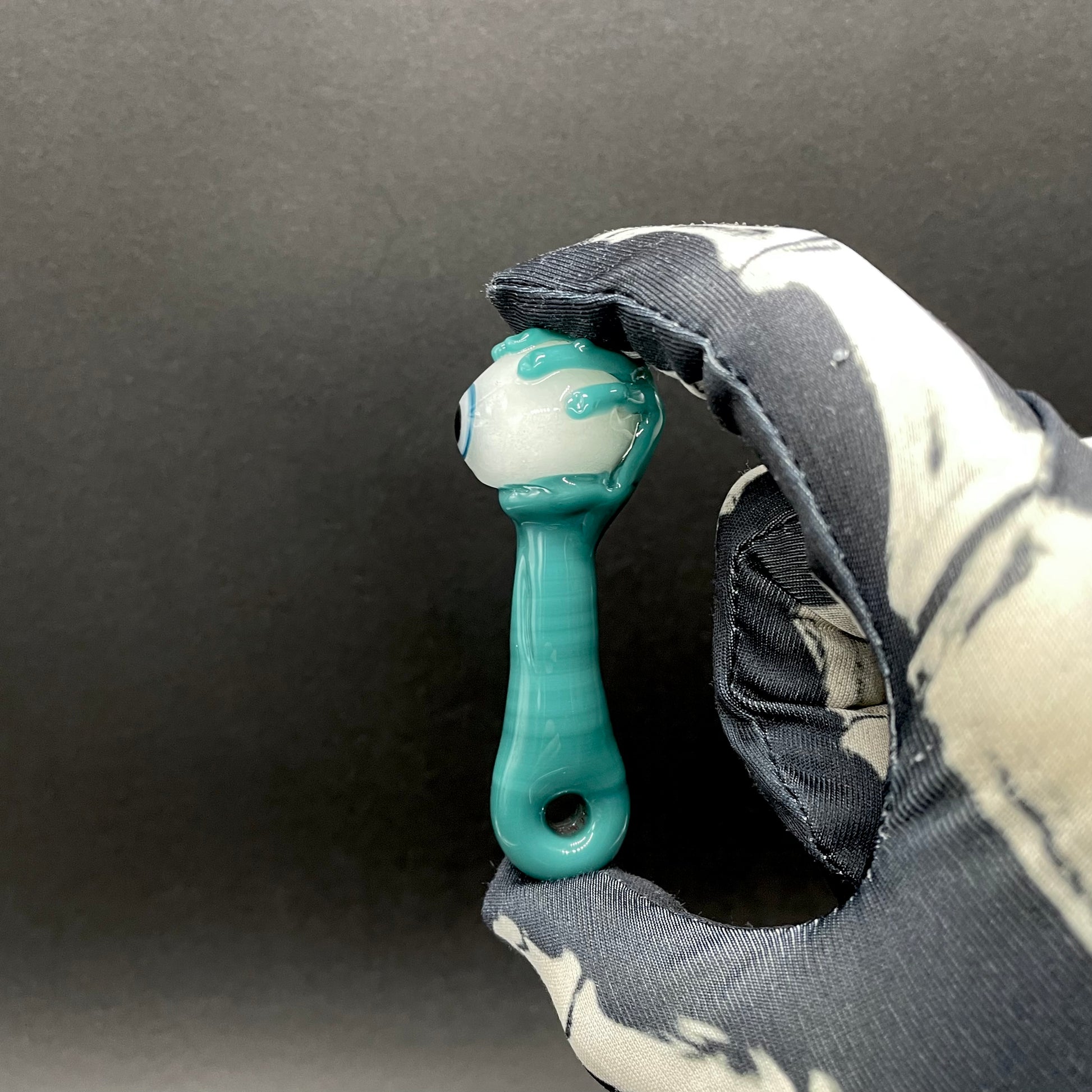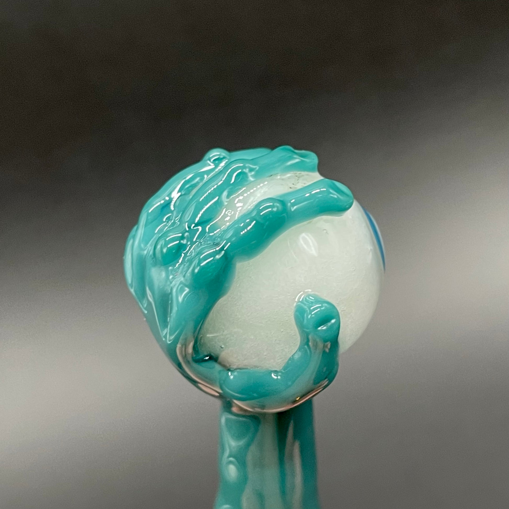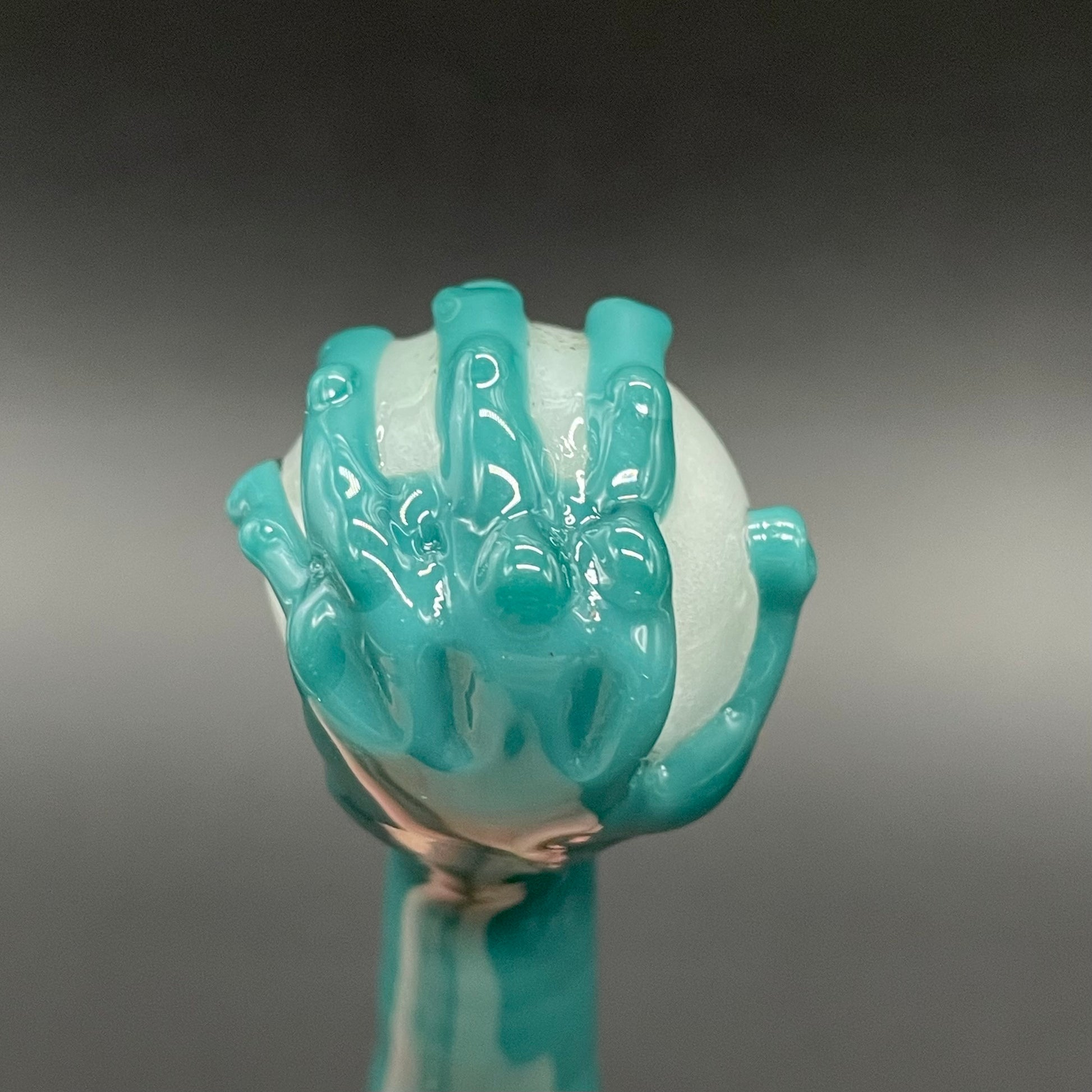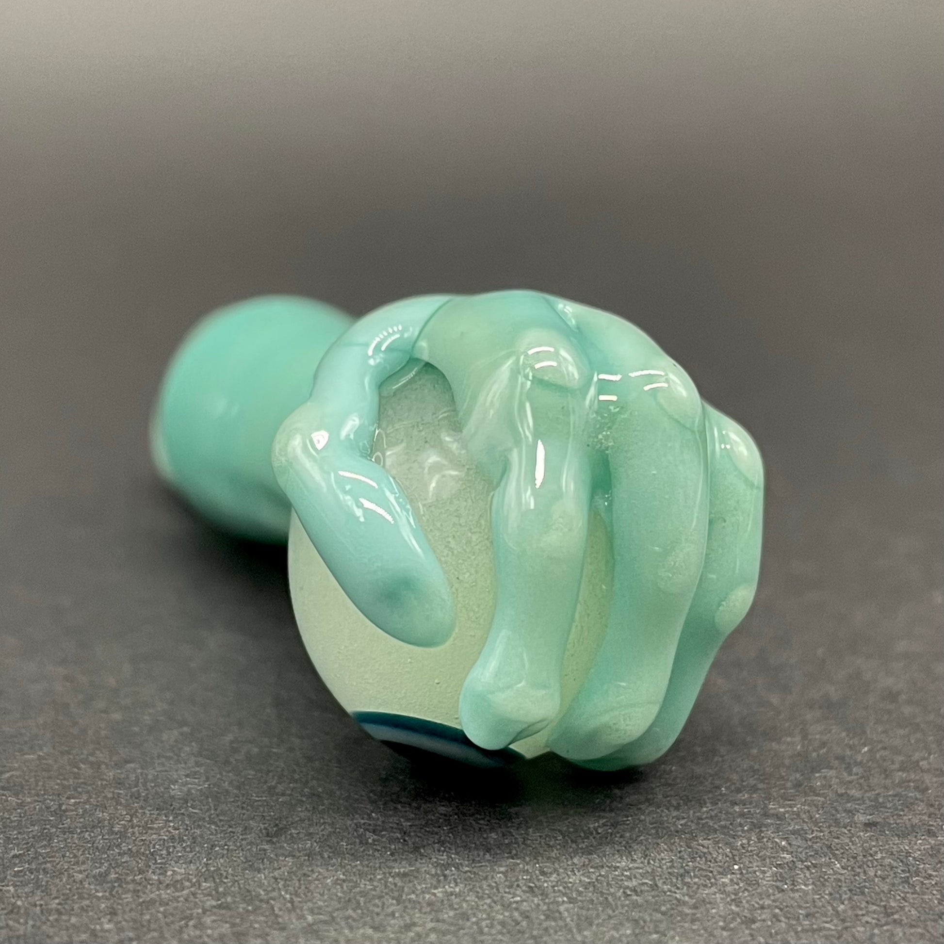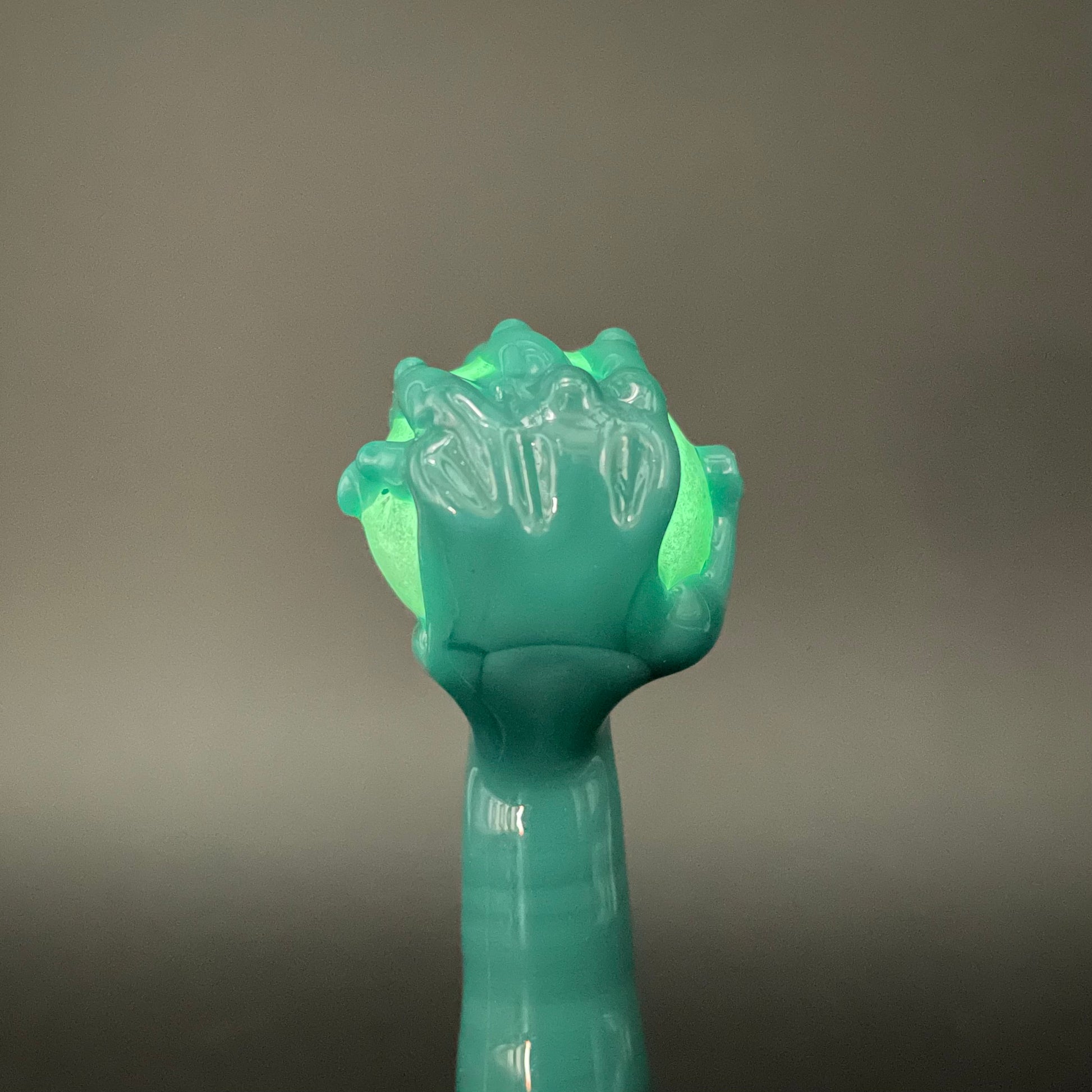 I guess this is what putting contact lenses in feels like. This glass pendant features a blue hand holding a glow in the dark eye.