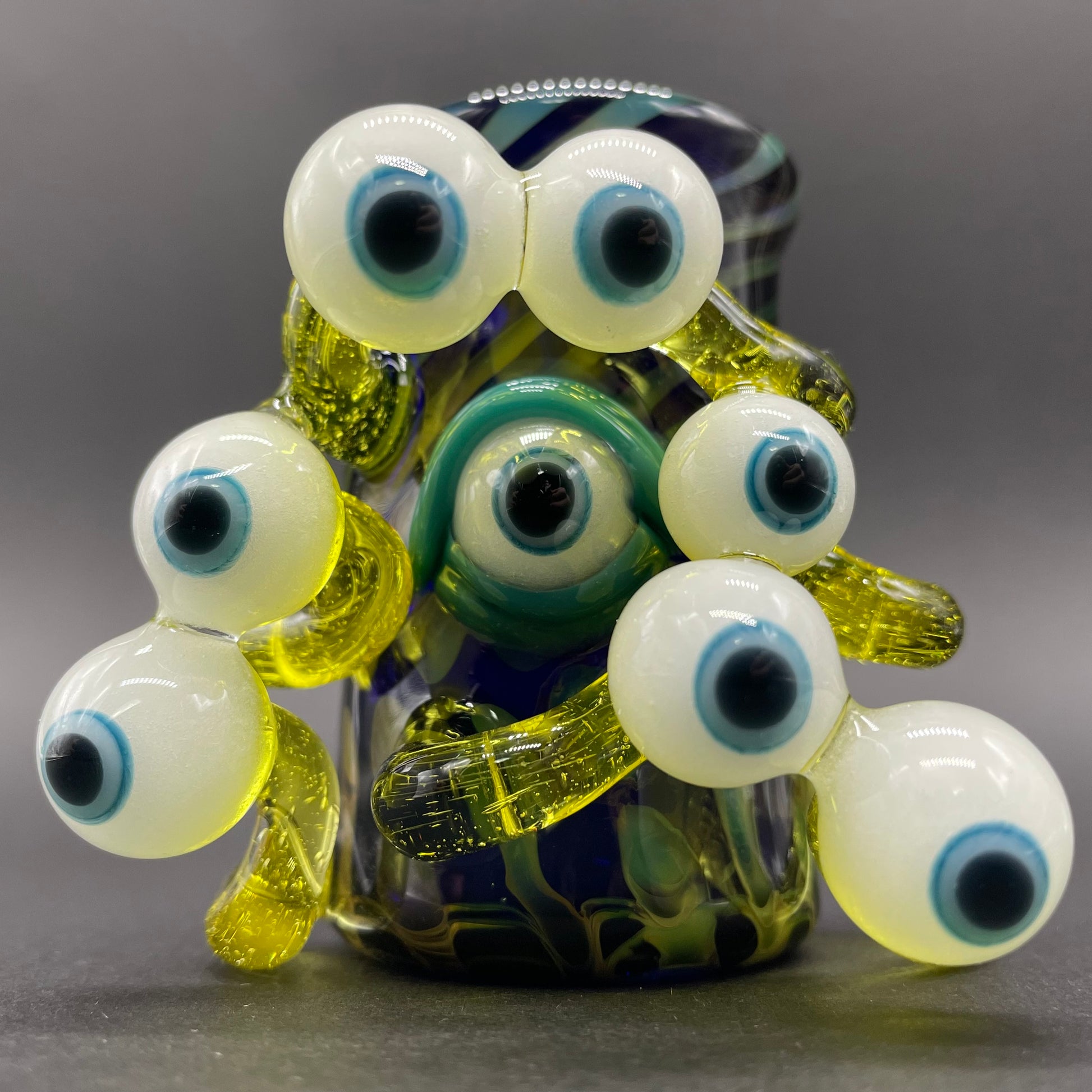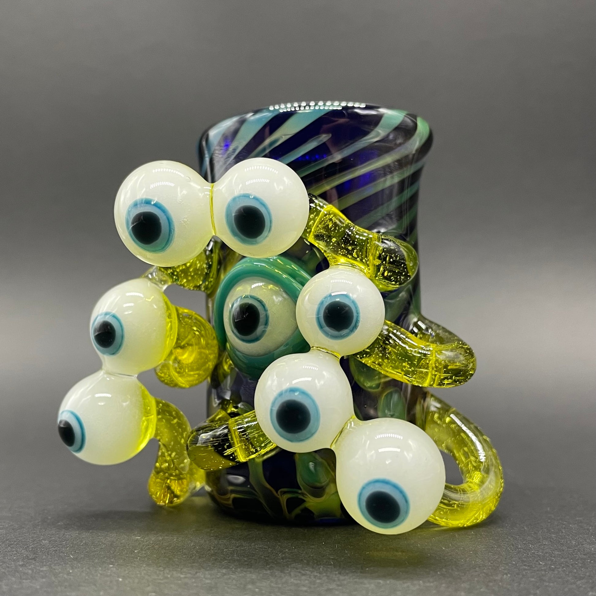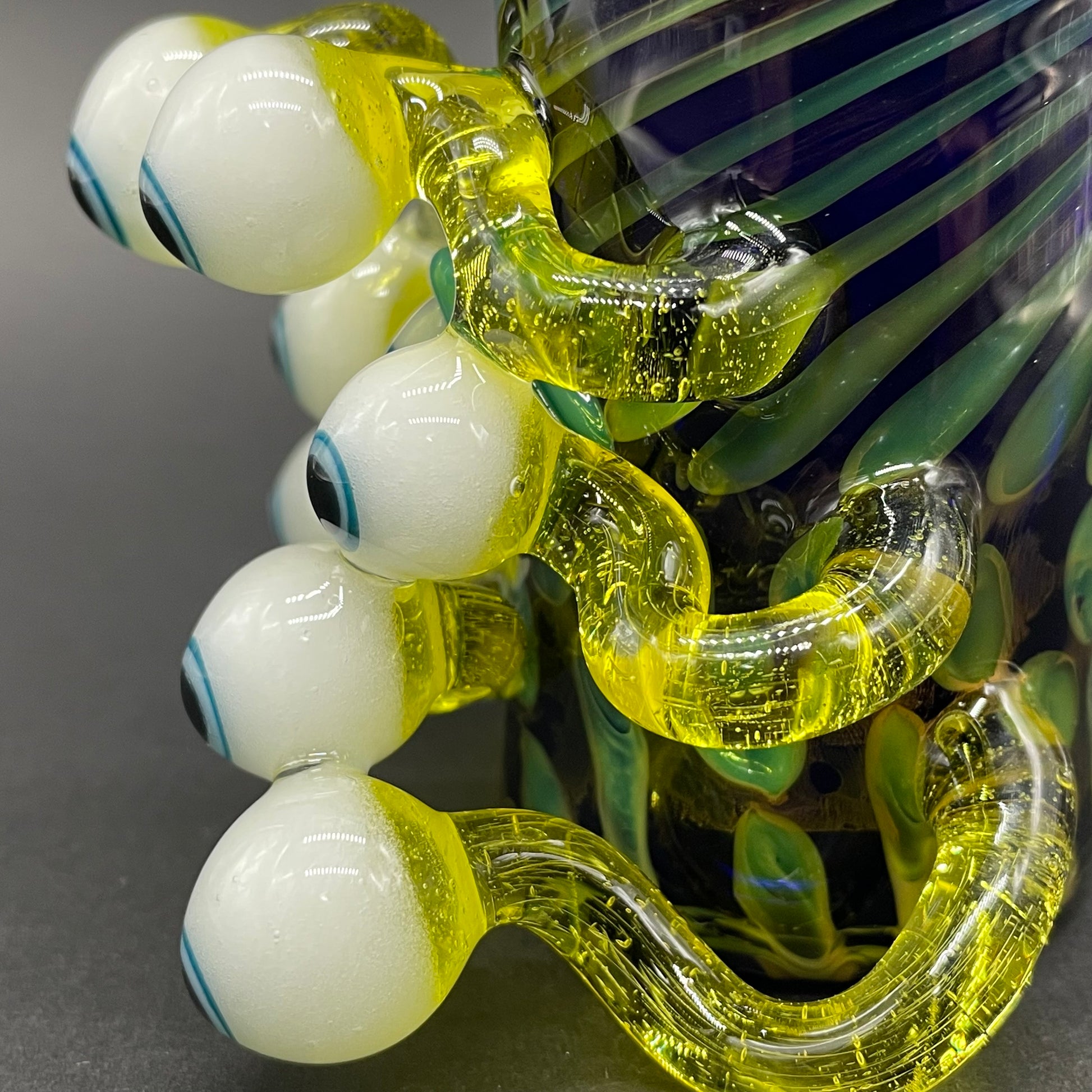 This fully worked shot glass is crafted with a gold and silver fume technique, creating an otherworldly depth in the cup itself. Sprouting from its base are writhing eyestalks, each tipped with a glow in the dark eye that comes alive in the dark. Equal parts eerie and mesmerizing, this is more than just a glass — it’s a ritual vessel for those brave enough to meet its gaze.