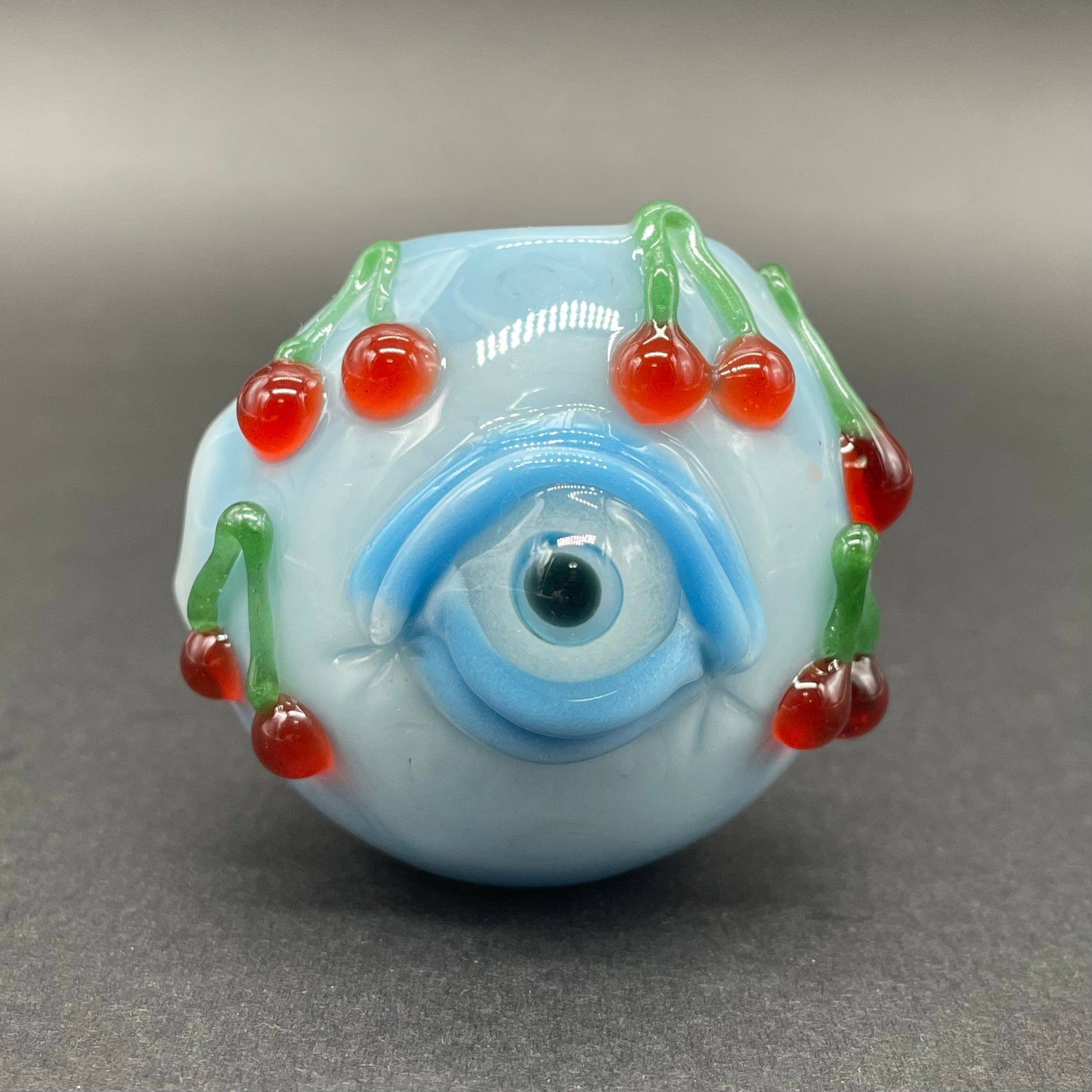 this unique piece features a Siberia blue pipe adorned with petite red cherries and a single glow in the dark eye.