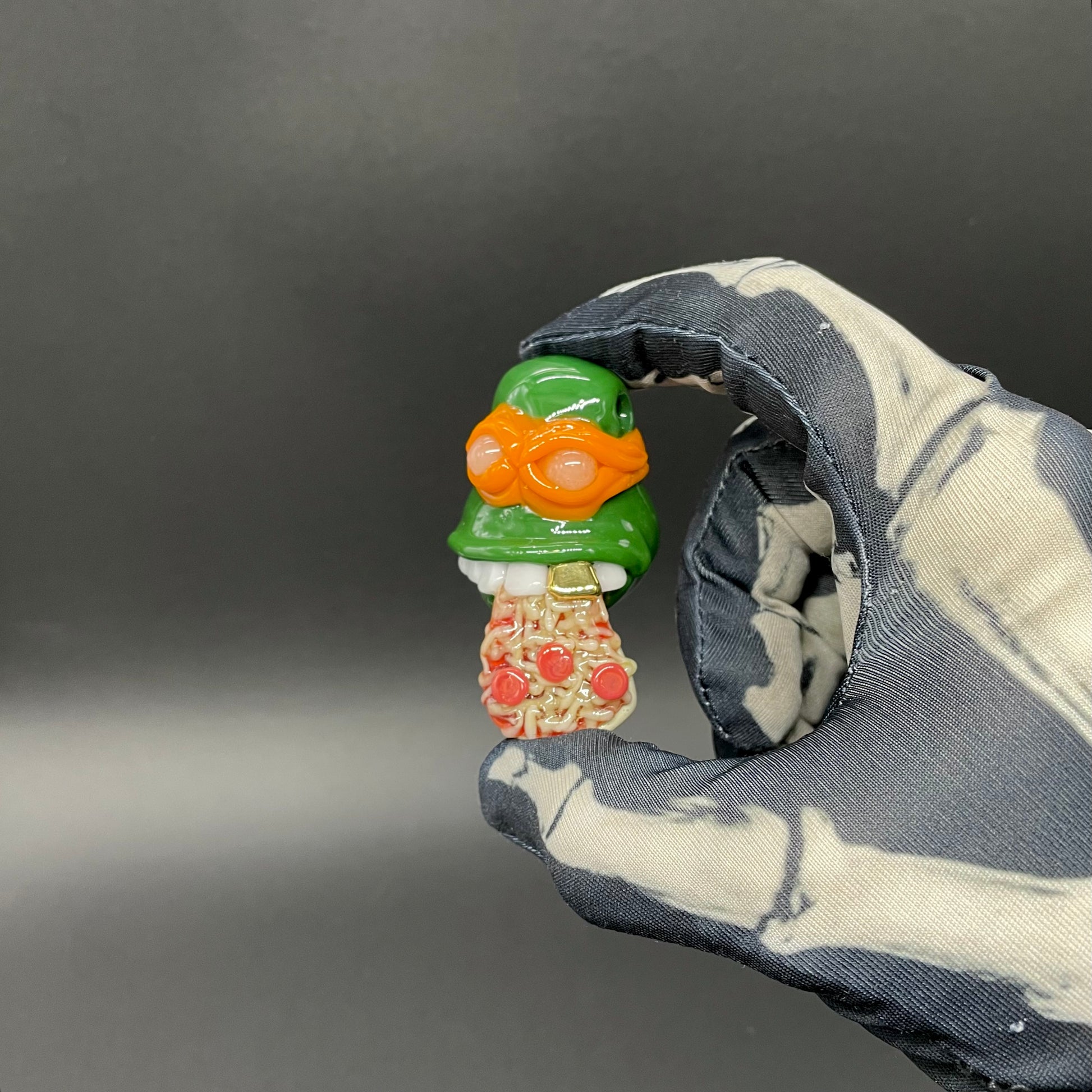 This one of a kind glass pendant features Michelangelo, the fun-loving, pizza-obsessed Ninja Turtle, rocking his signature orange bandanna. In true turtle fashion, he’s caught mid-bite enjoying a gooey slice of pepperoni pizza. A fun, nostalgic piece of wearable art, perfect for TMNT fans, collectors of unique glass creations, or anyone who appreciates humor in their jewelry.