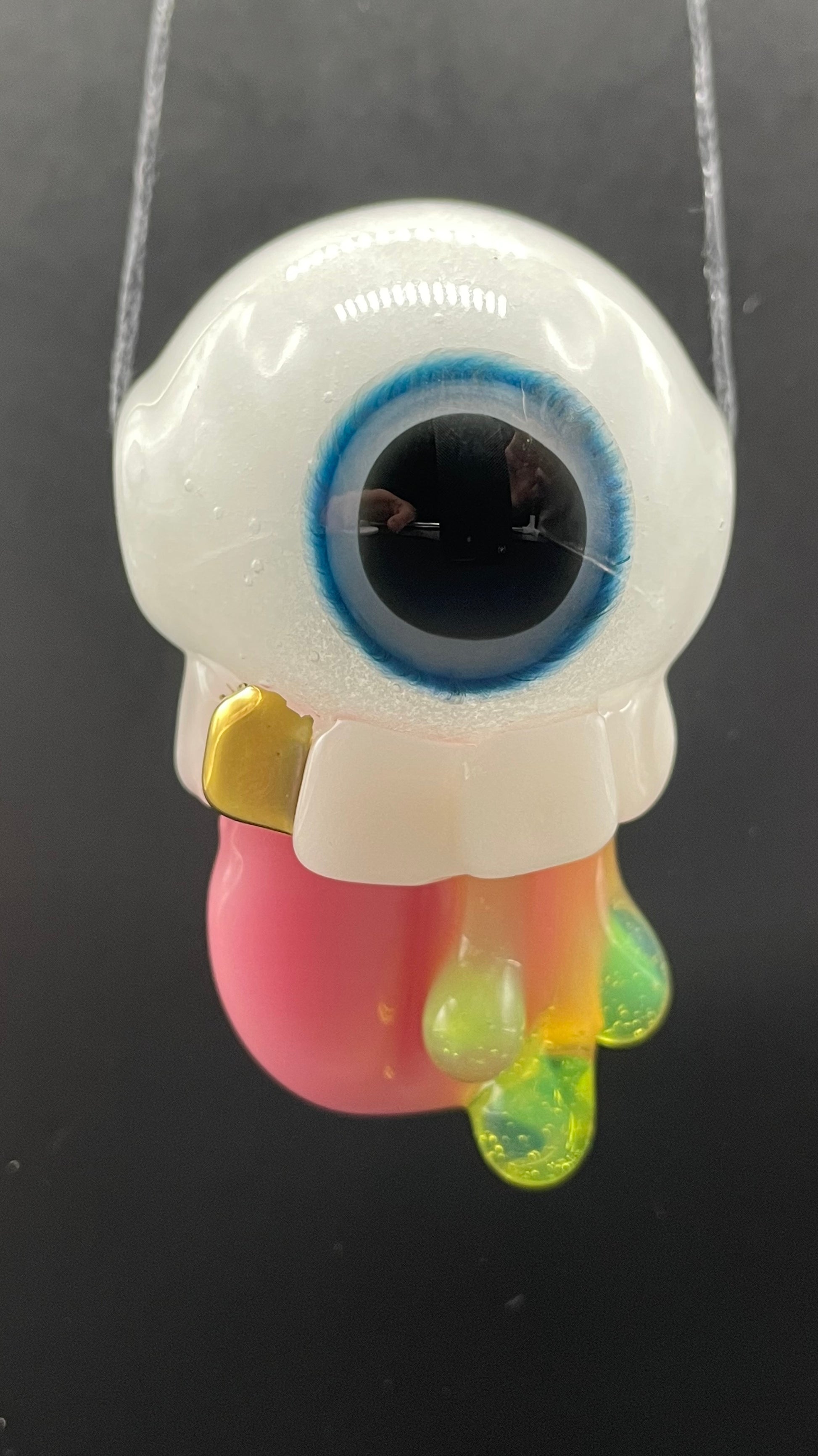 A hauntingly vivid glow-in-the-dark glass pendant showcasing a large glowing eye, a drooling tongue that drips with eerie detail, and a striking gold enamel tooth.