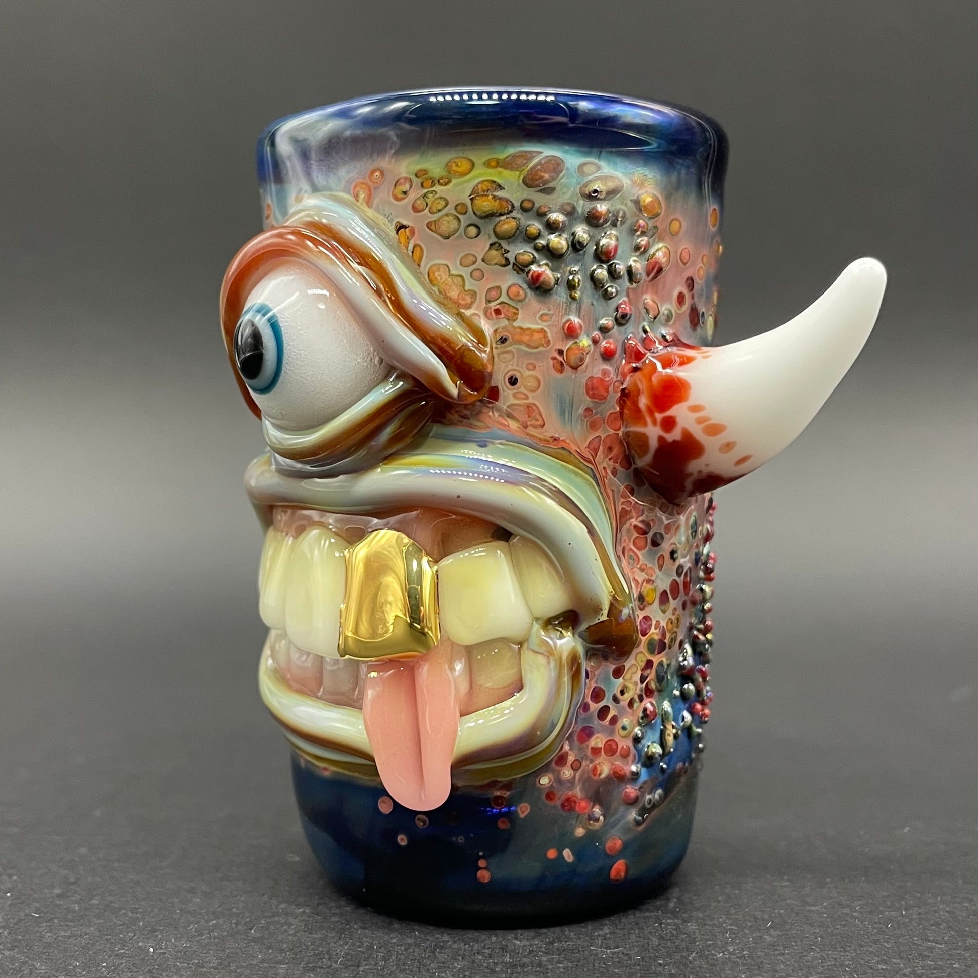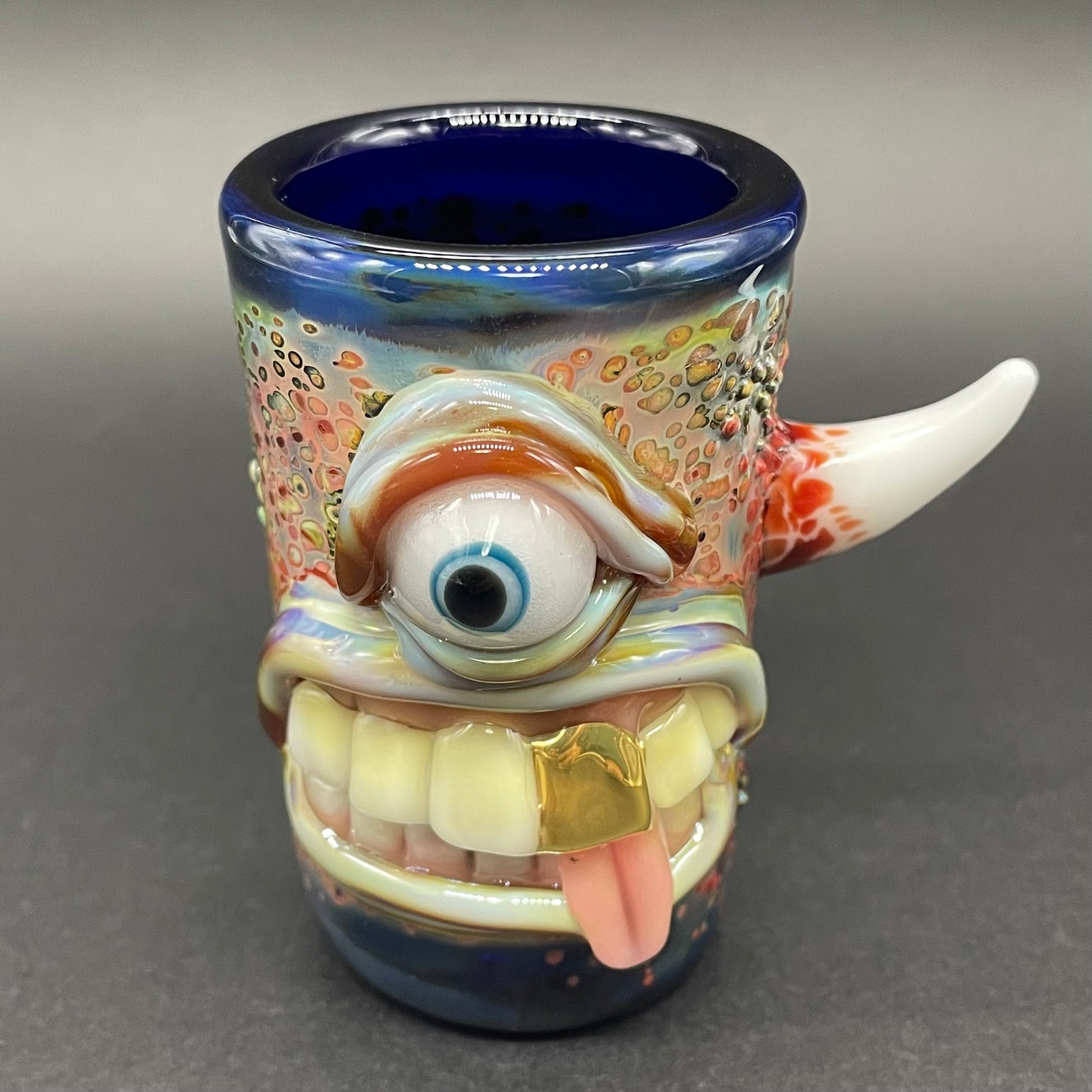 Bring some mythic mischief to your barware collection with this one-of-a-kind hand-blown Cyclops shot glass. Featuring a single glowing eye that comes alive in the dark and a gleaming gold enamel tooth, this piece blends eerie charm with fine craftsmanship.