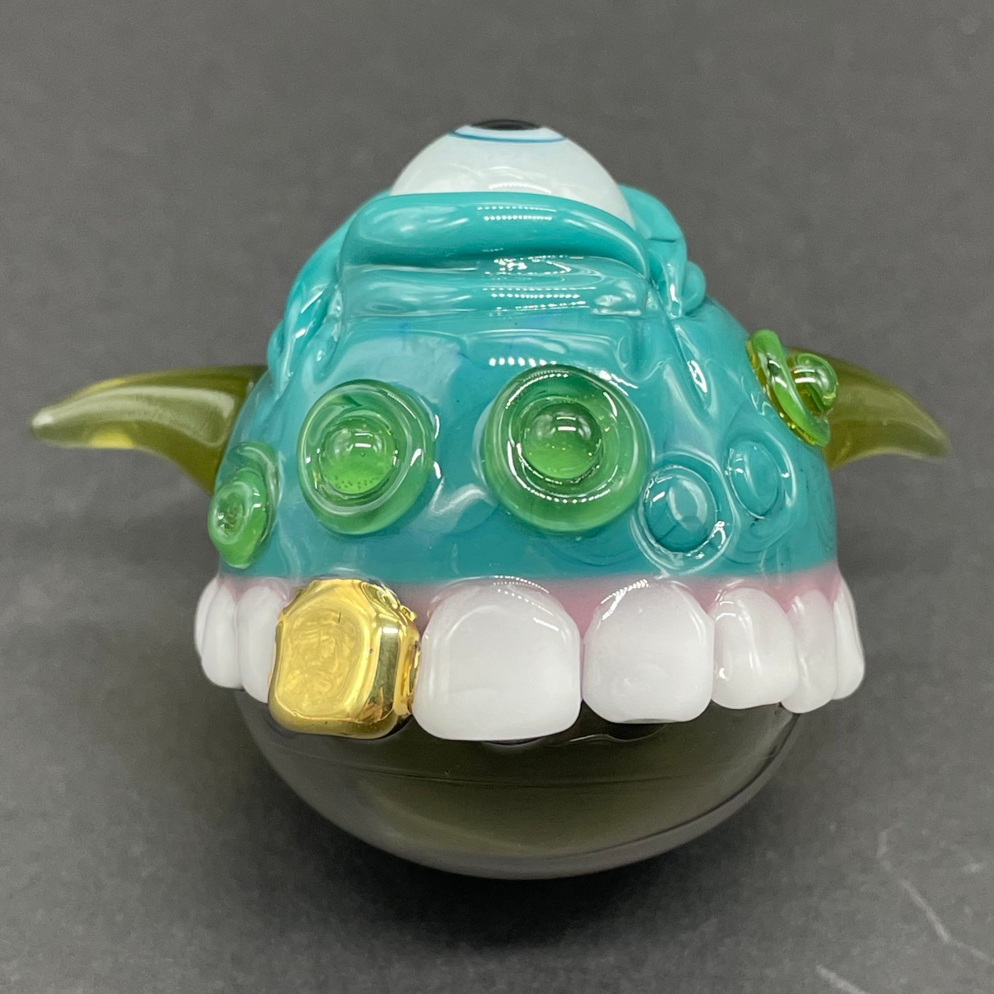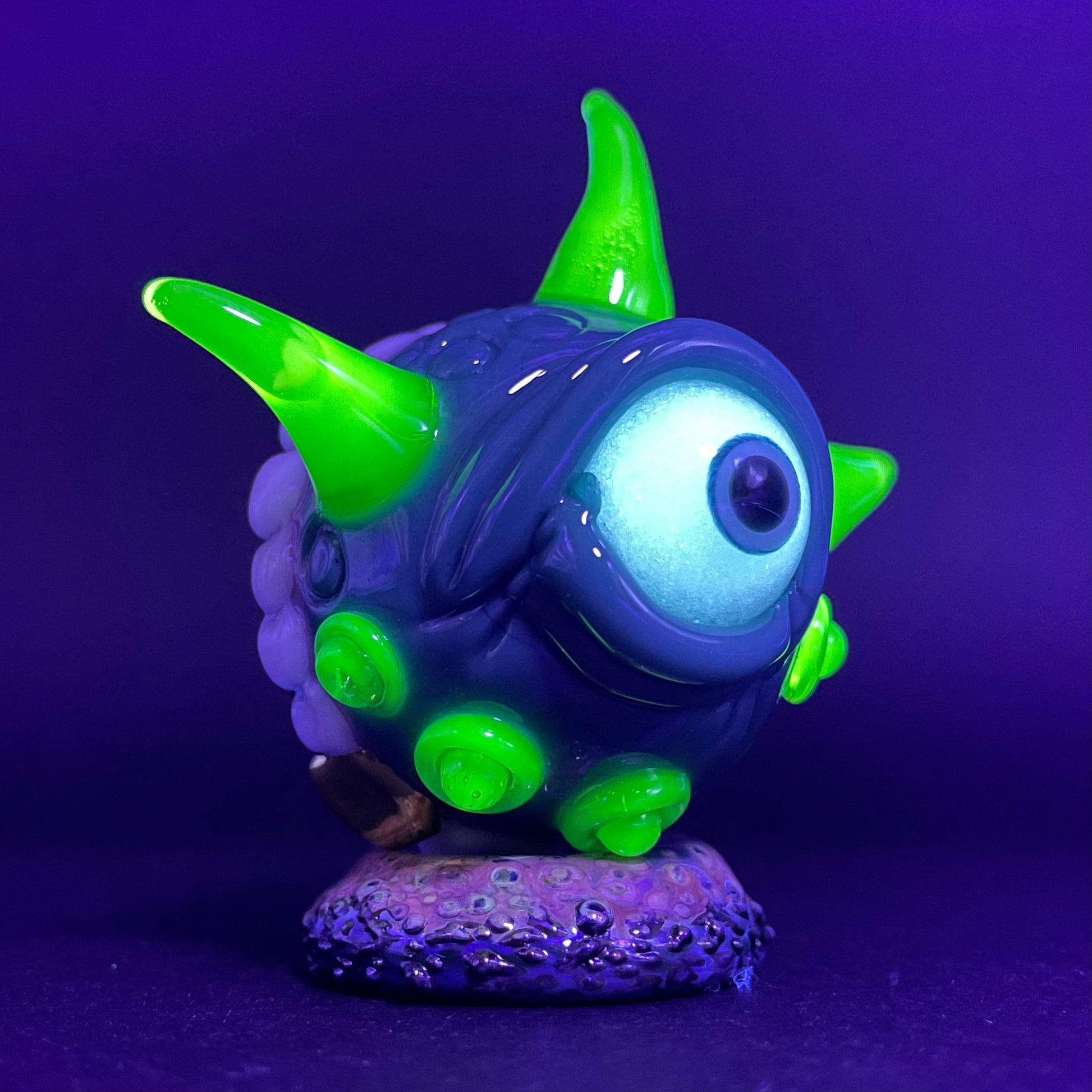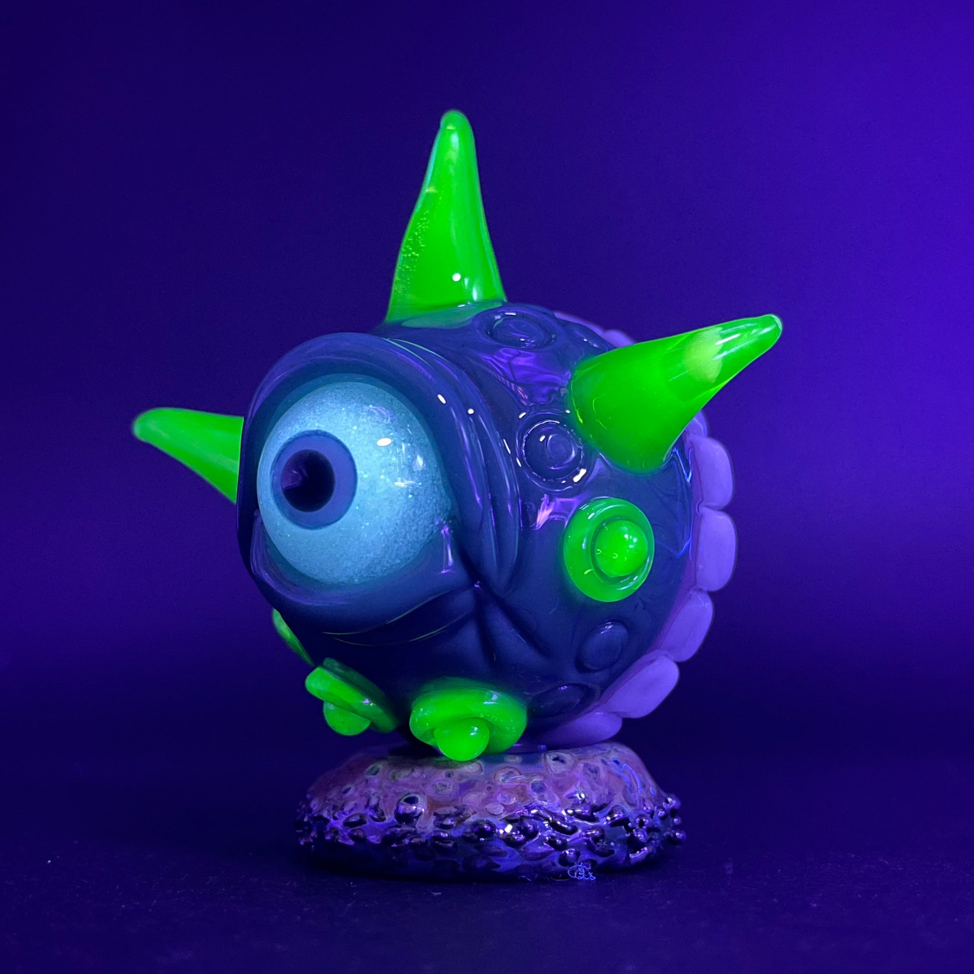 This highly detailed glass marble features a sparkling dicroic core accentuated by a sculpted face. Adorned with blacklight reactive horns a glow in the dark eye and hungry teeth. This piece will surely be the focal point of any collection.