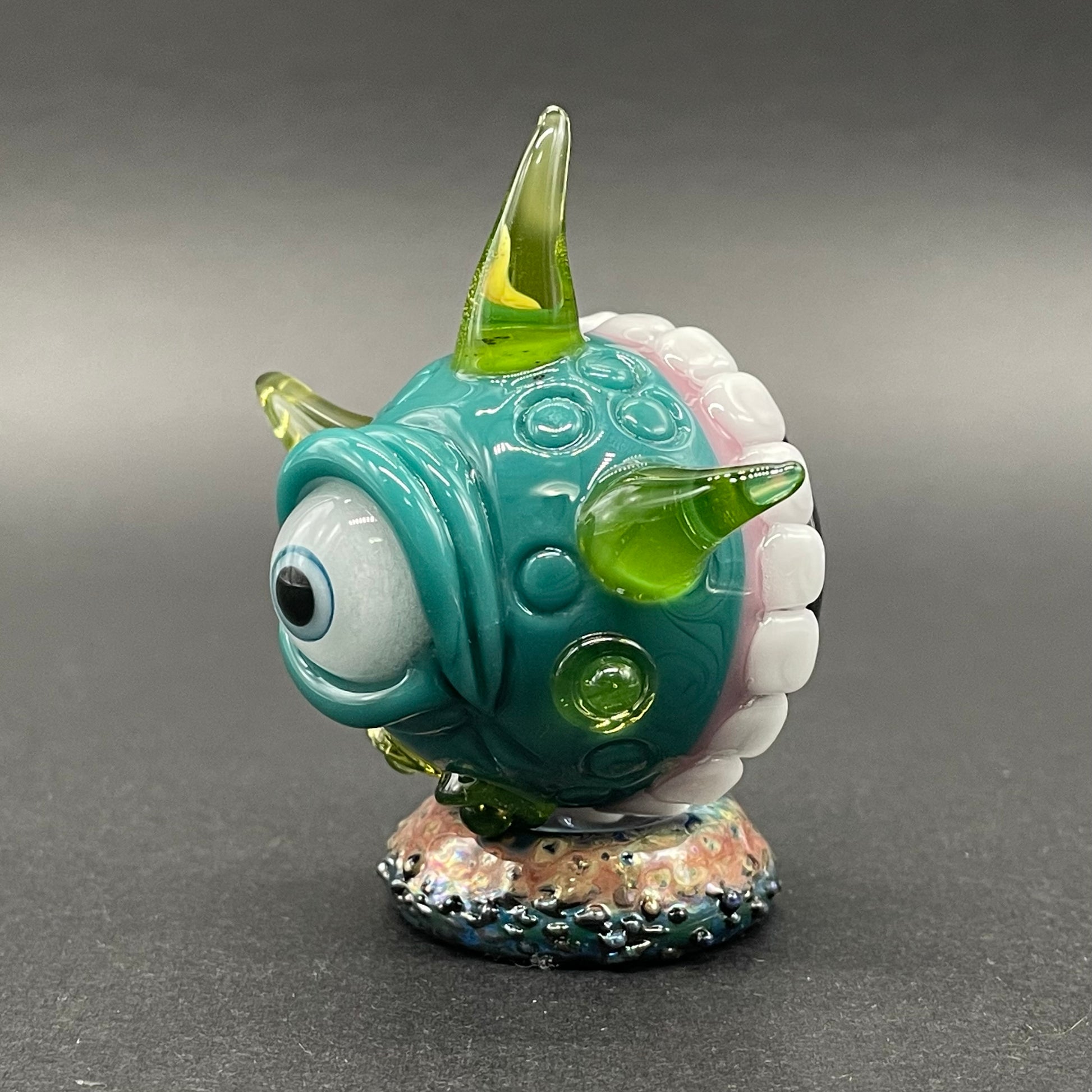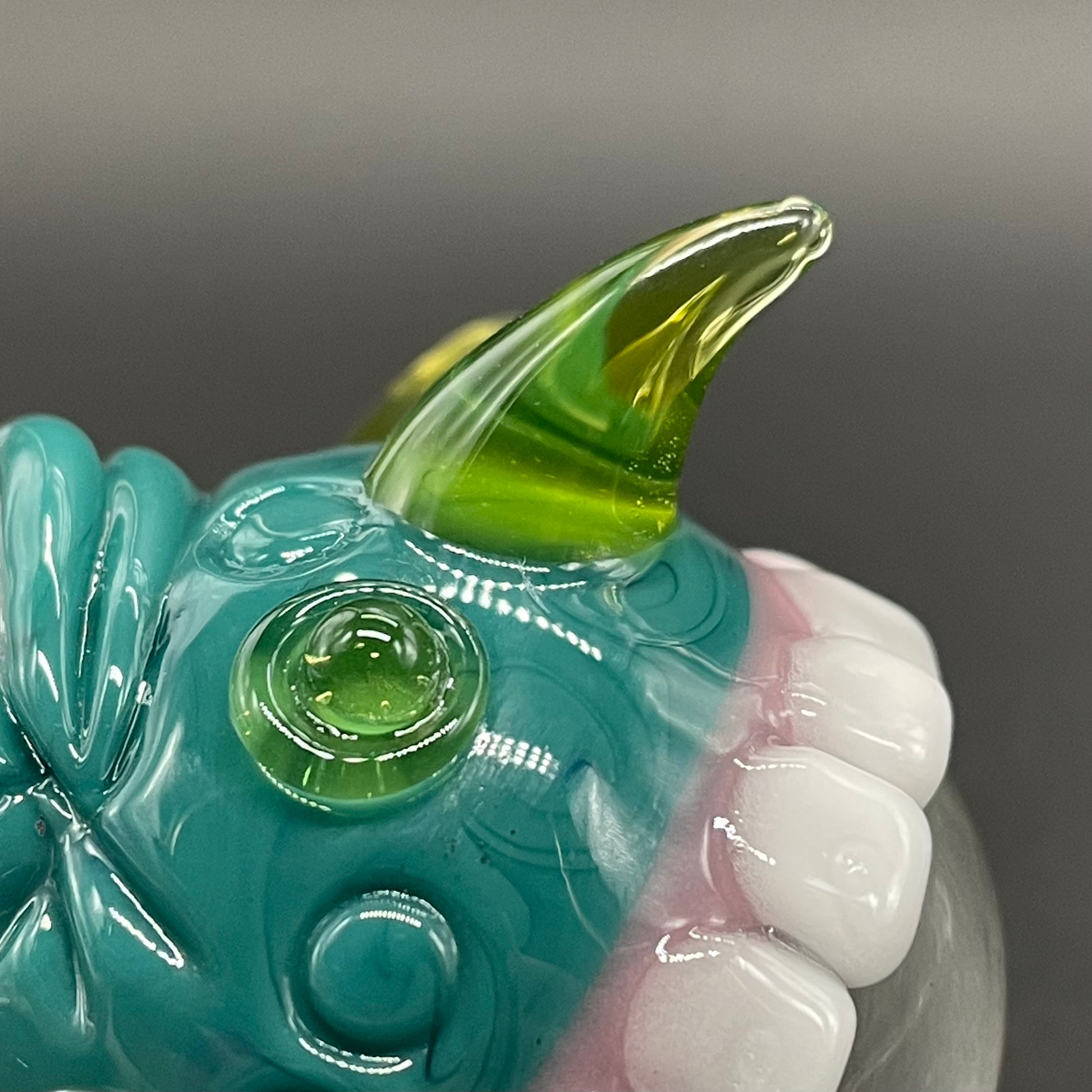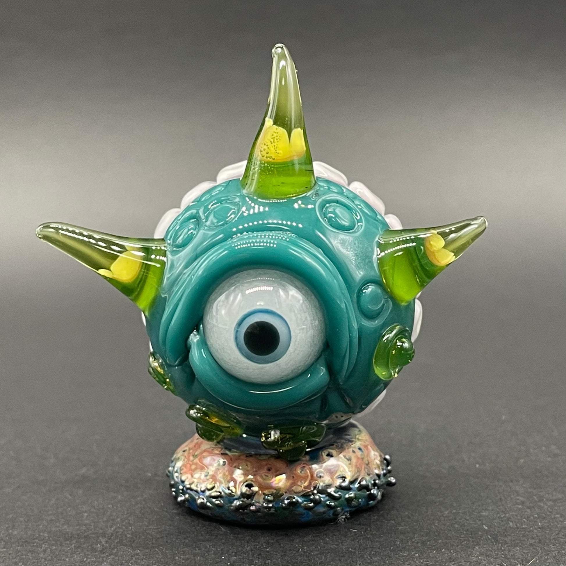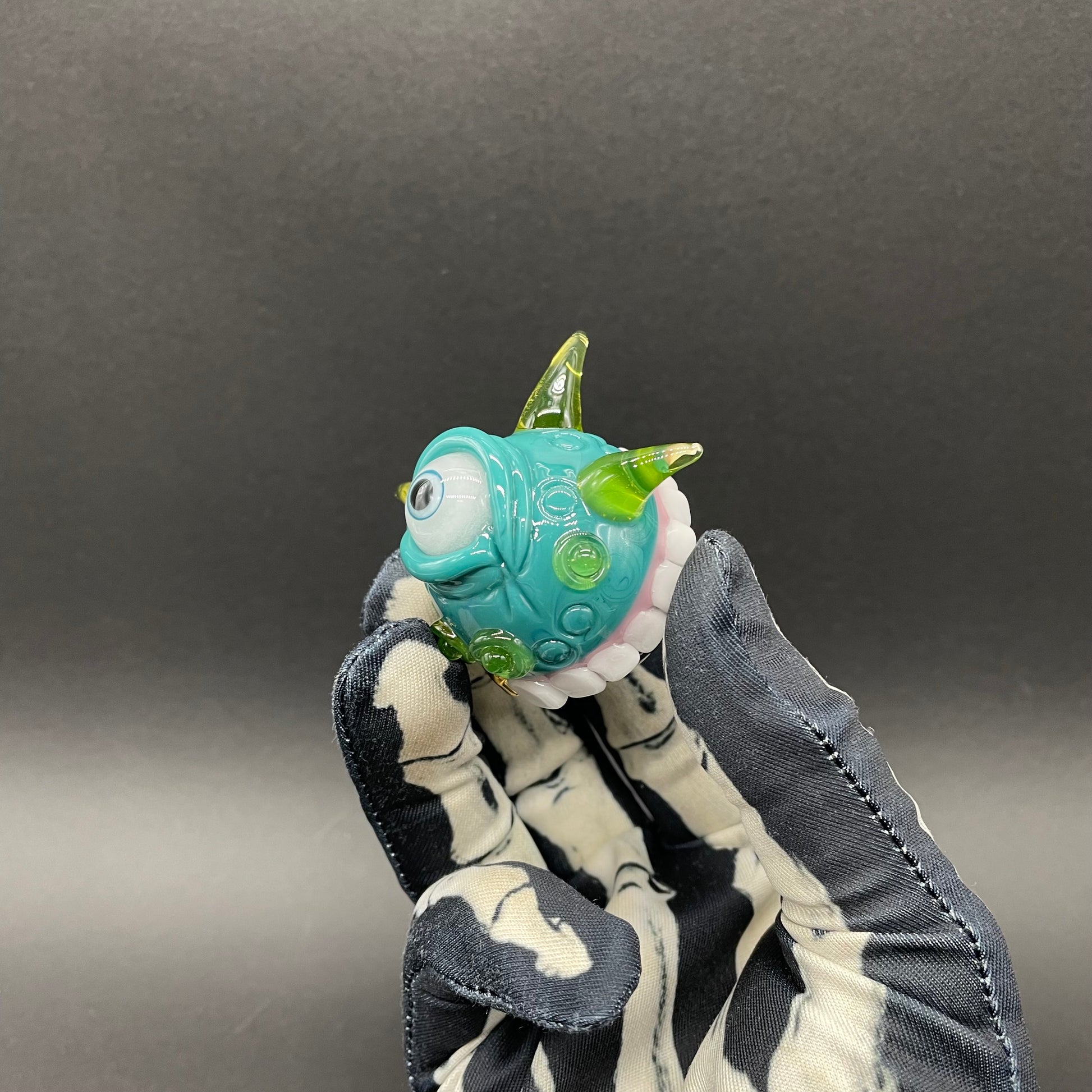 This highly detailed glass marble features a sparkling dicroic core accentuated by a sculpted face. Adorned with blacklight reactive horns a glow in the dark eye and hungry teeth. This piece will surely be the focal point of any collection.