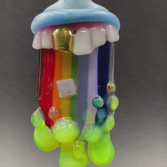 The mind is like a parachute; it works best when it’s open. This drippy, rainbow tongue glass pendant features a 5 millimeter square white opal. With the slightest movement this square opal sparkles like fireworks.