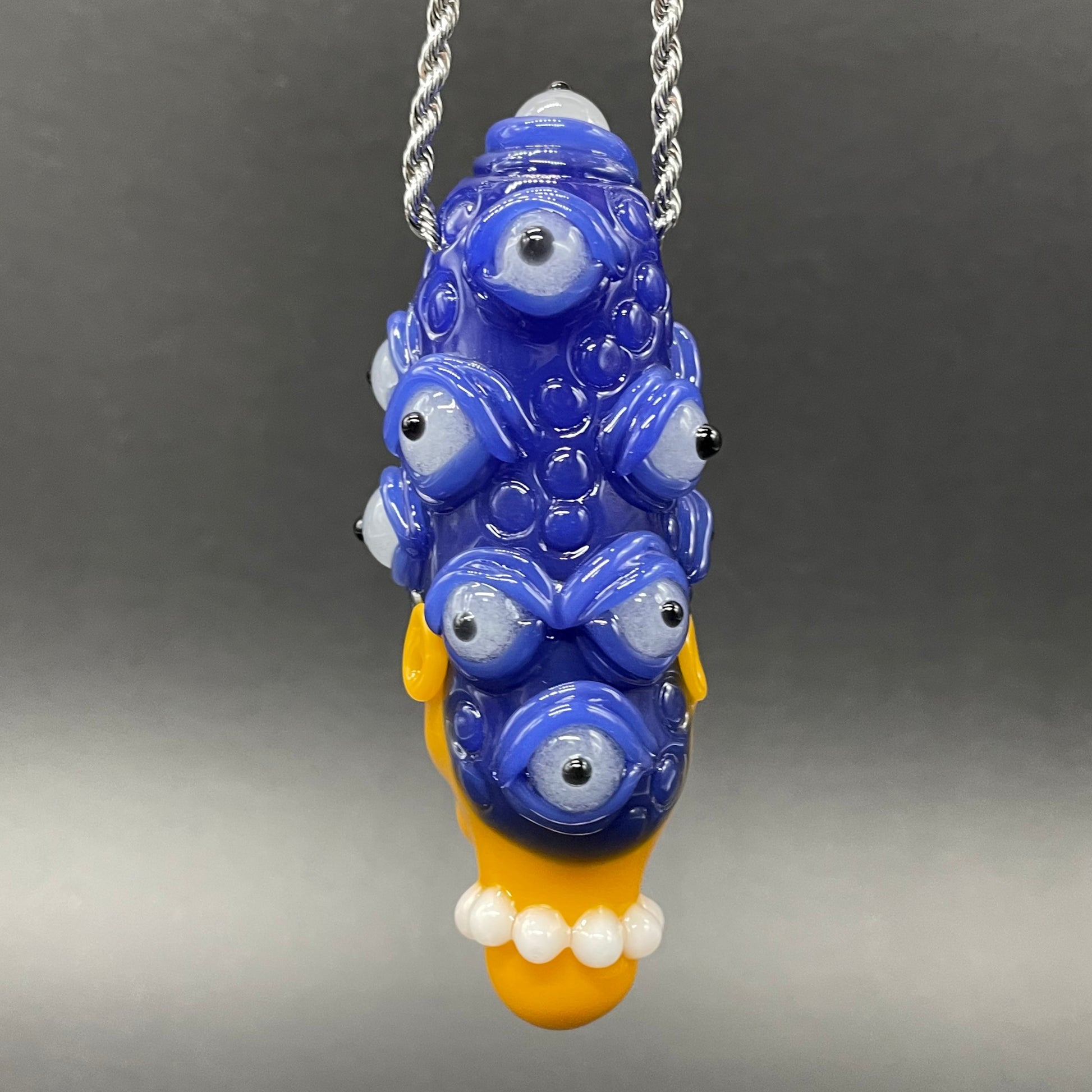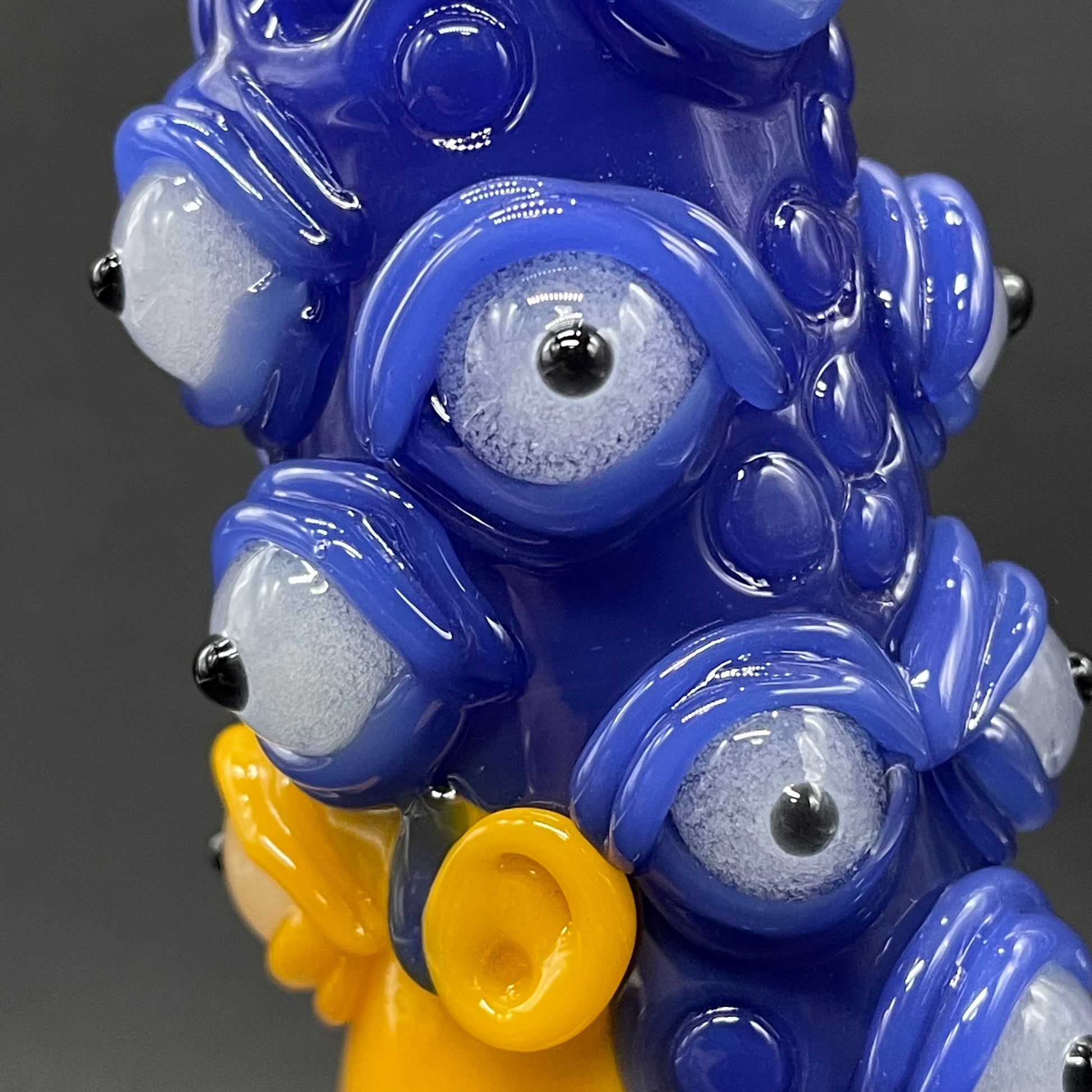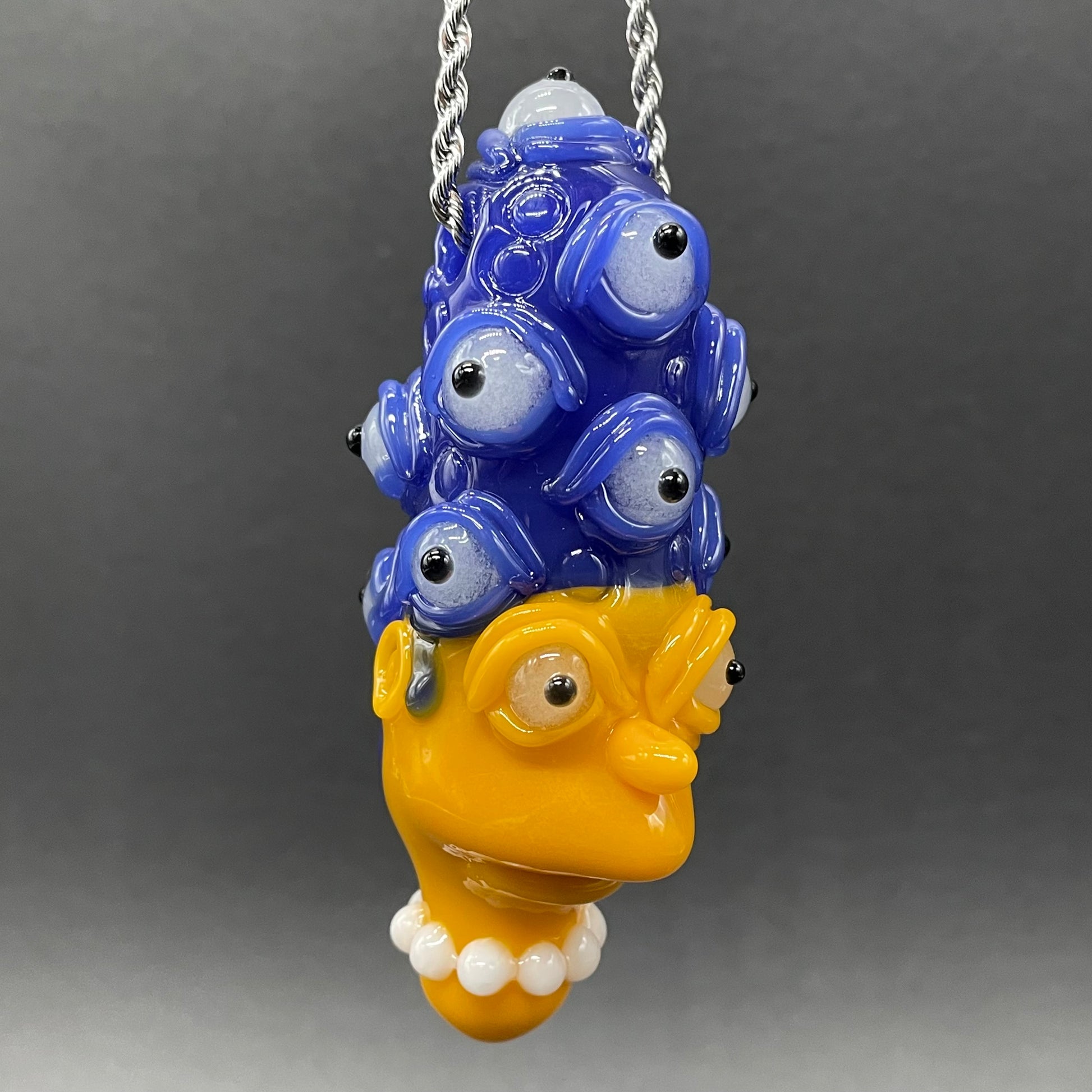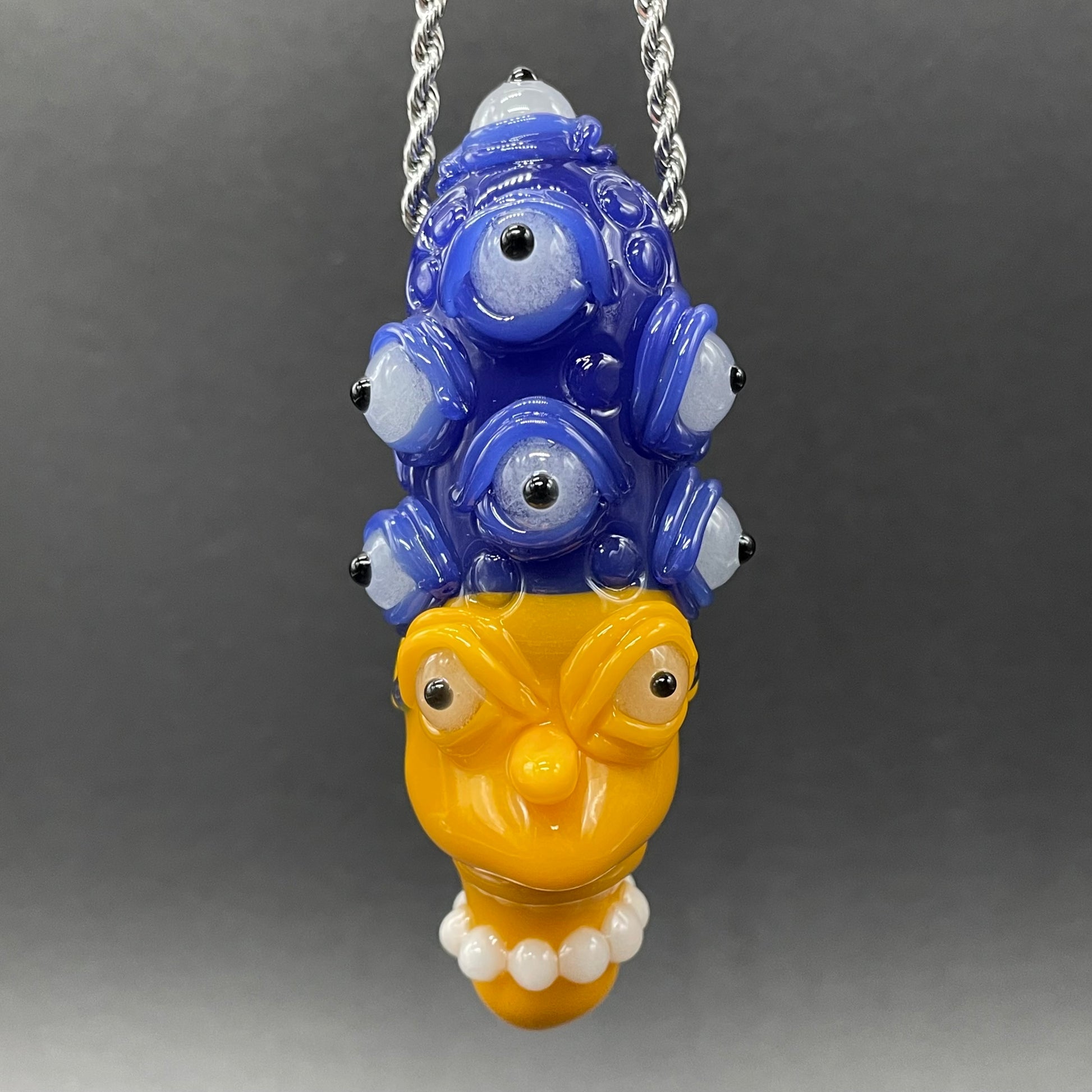 This eerie and eye-catching hollow glass pendant reimagines the iconic Marge Simpson. Featuring her unmistakable blue beehive hairdo, this version of Marge has sprouted multiple glow in the dark eye growths that protrude from her towering hairstyle, adding a surreal, mutant twist to the beloved cartoon matriarch.