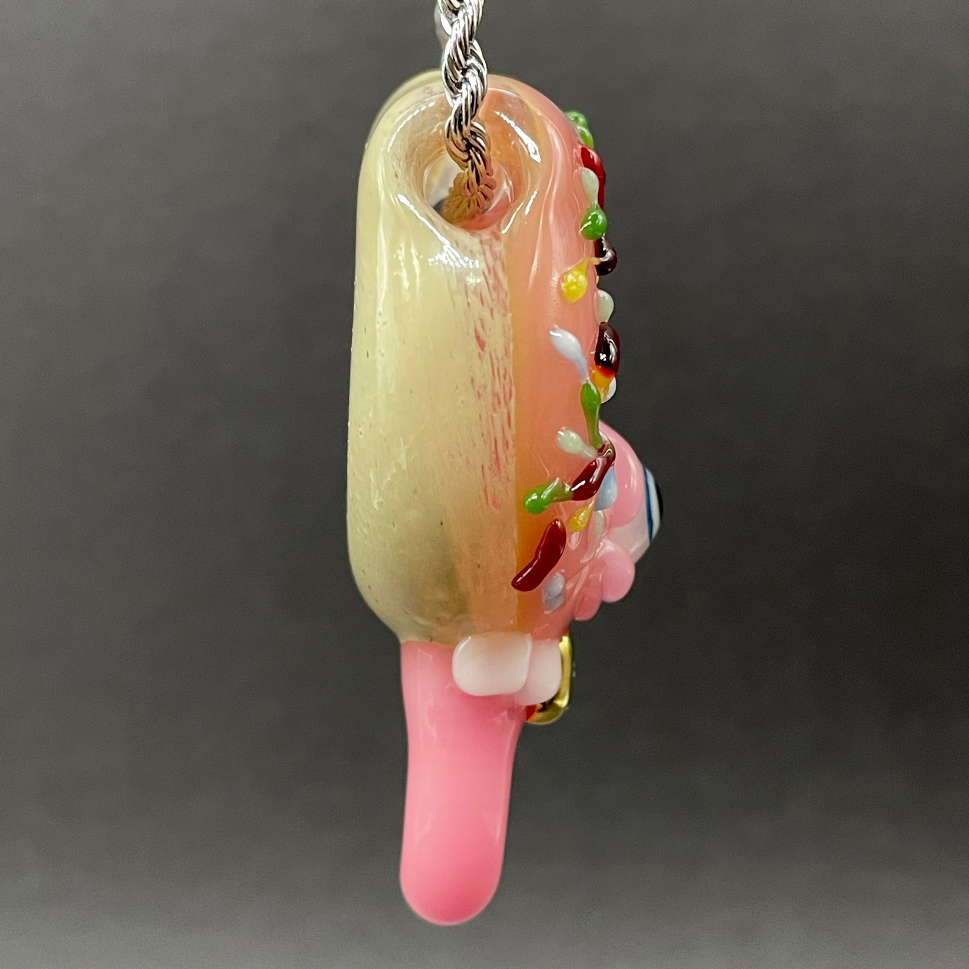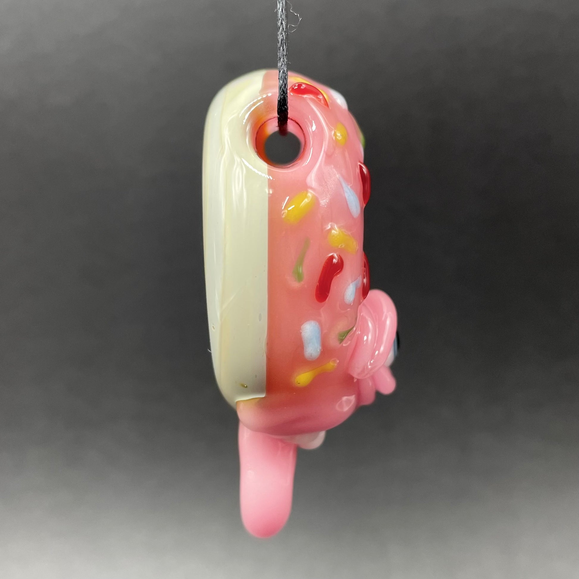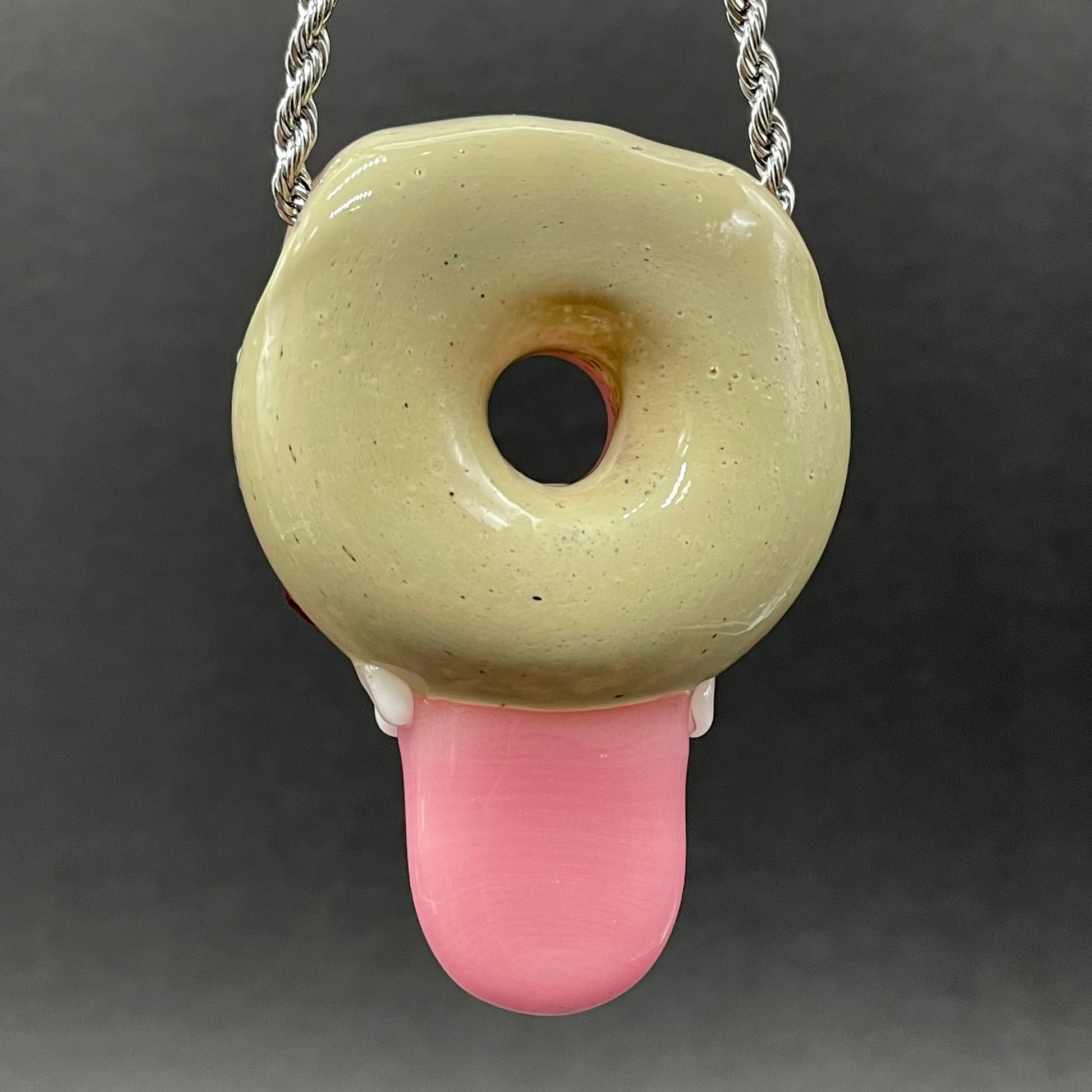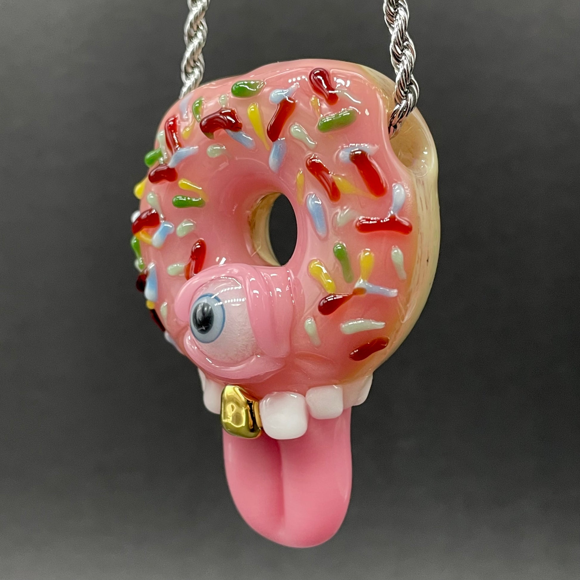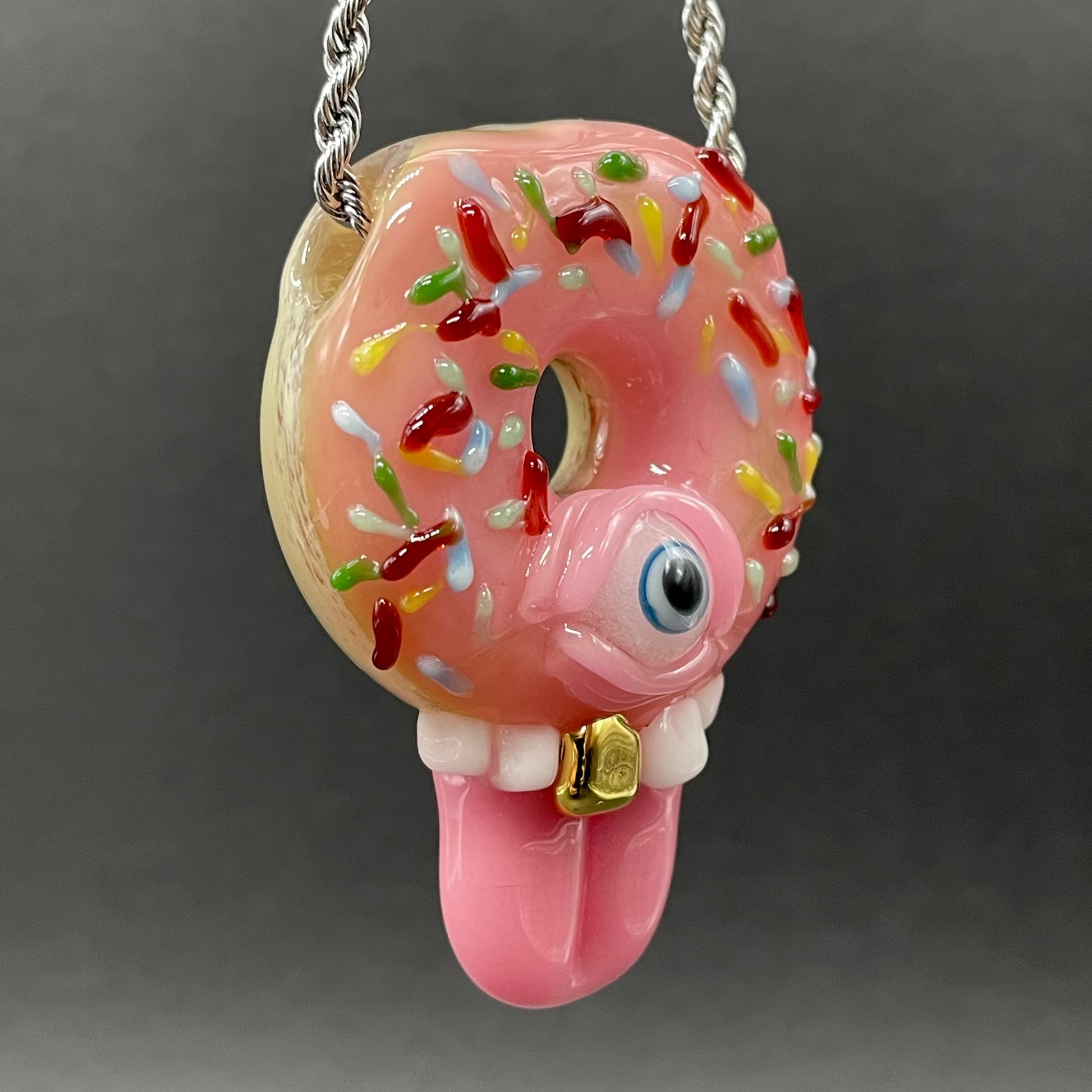 This hollow glass doughnut pendant features a glow in the dark eye, drippy icing, sprinkles, buck teeth and pink tongue