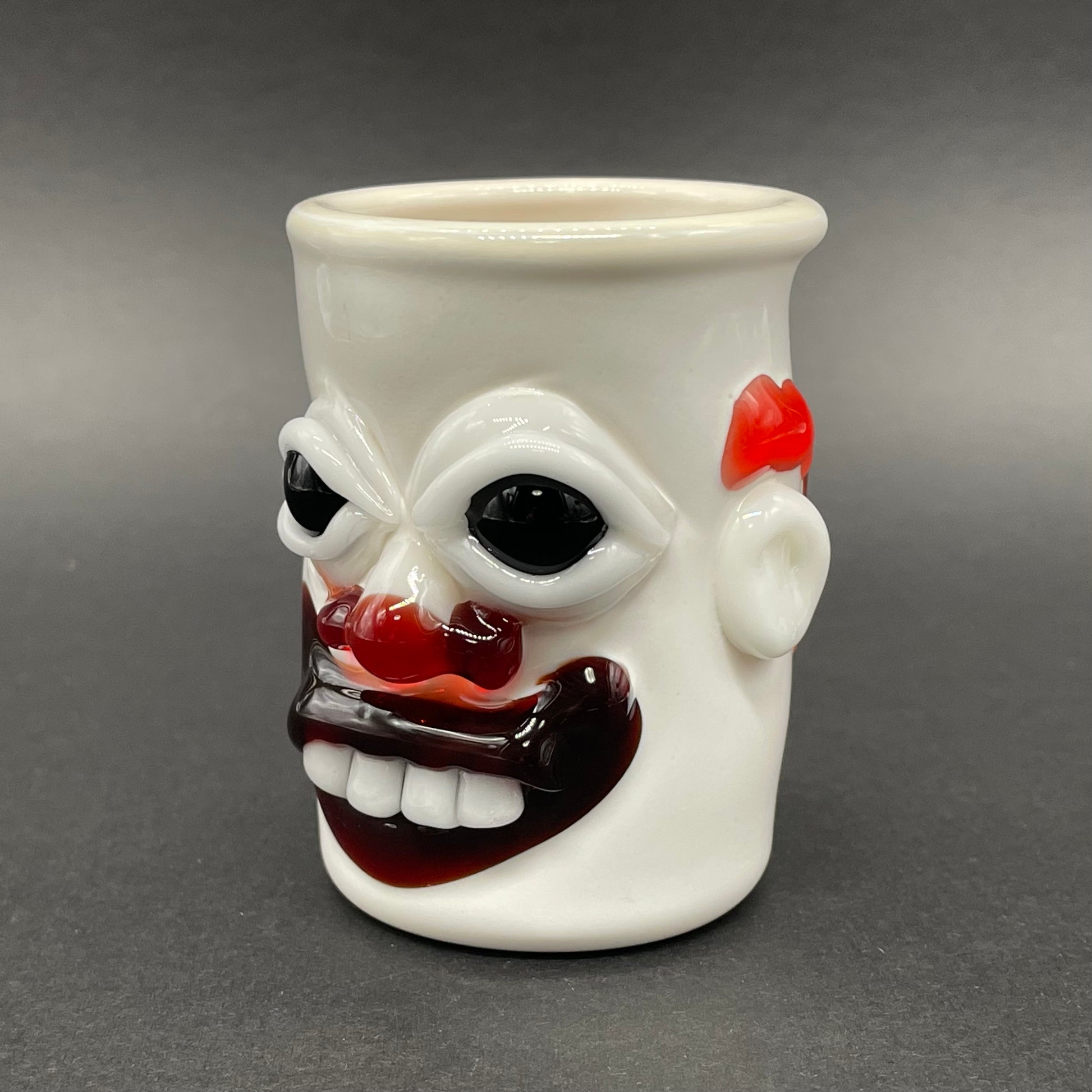 One of the most disturbing creations to leave my torch. This shot glass bears the face of a creepy clown, smeared in sinister makeup. Its jagged teeth jutting beneath lifeless, pitch black demonic eyes. A vessel born from nightmares.