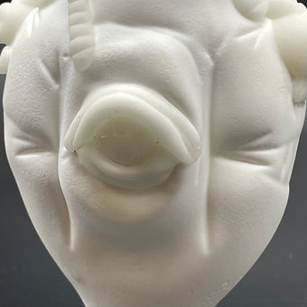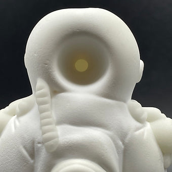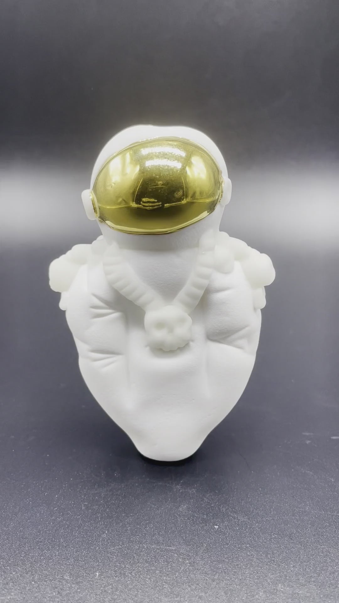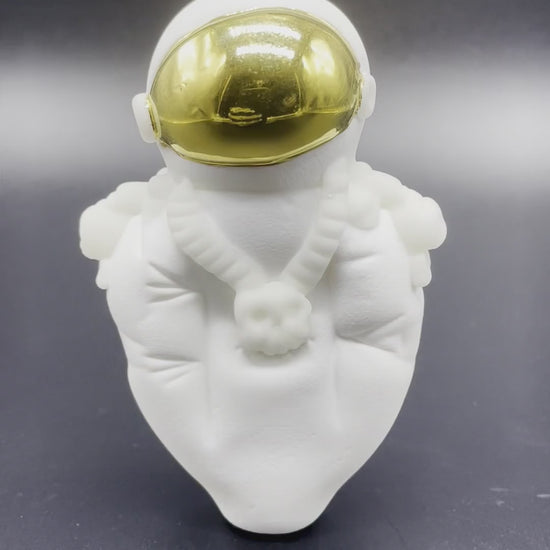 This sandblasted piece has a gold enammeled astronaut face shield. Adorned with an eye and faces.