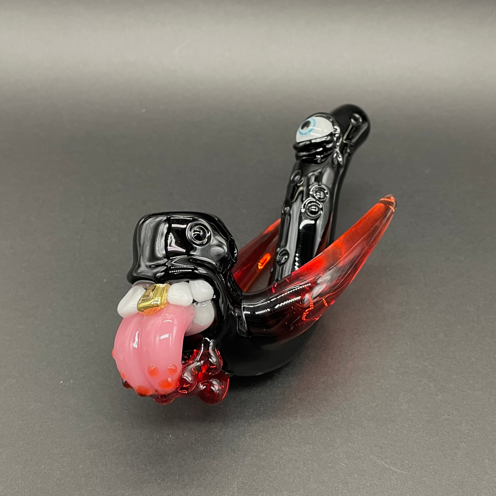 This dark and menacing Sherlock features a deep onyx body with two striking red tusks, a blood dripping tongue and a textured surface that feels alive in your hand. A single glow in the dark eye watches while a gleaming gold tooth completes its sinister grin.