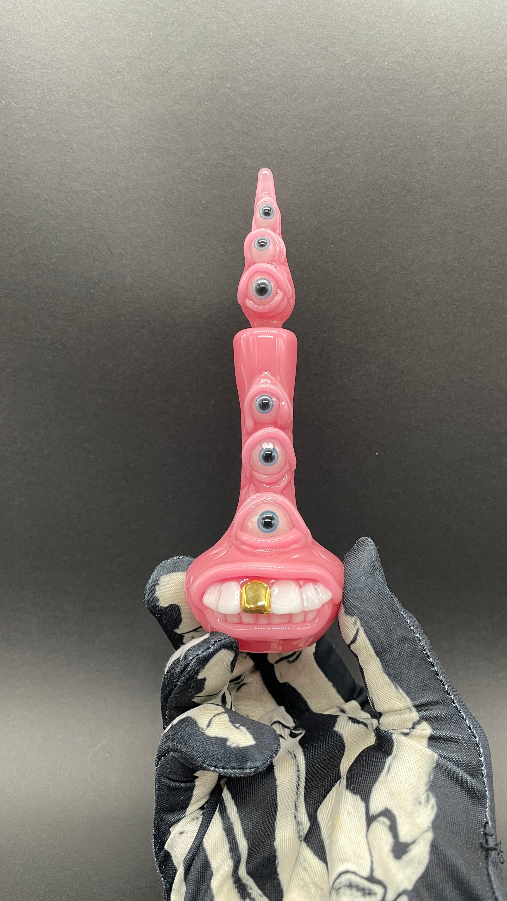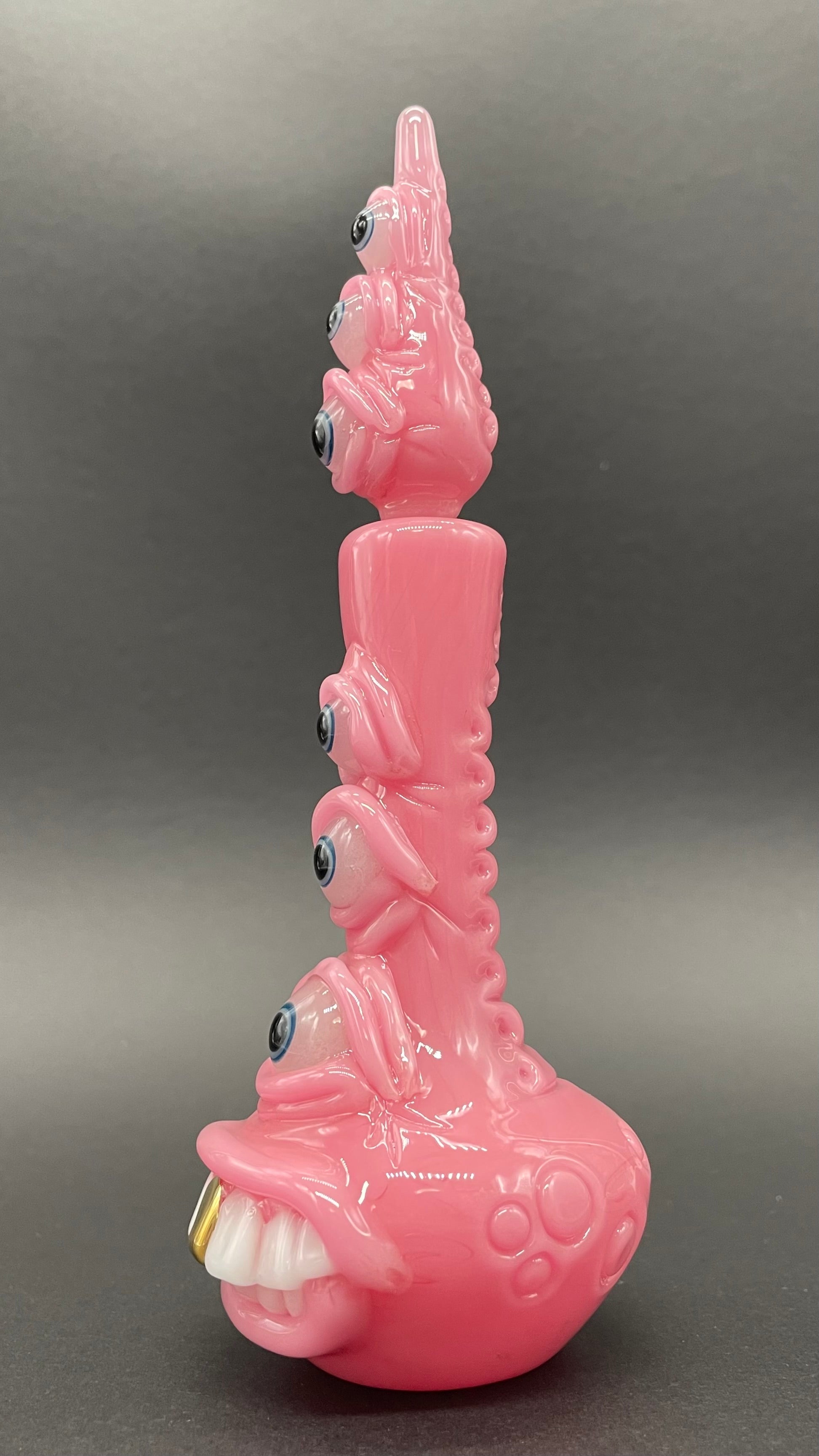 This pink potion jar is crafted with a snug-fitting stopper to keep your most precious brews from evaporating. Its strange design features multiple eerie, glow-in-the-dark eyes and A single gold enamel tooth that grins from the surface, like the smile of something that knows too much.