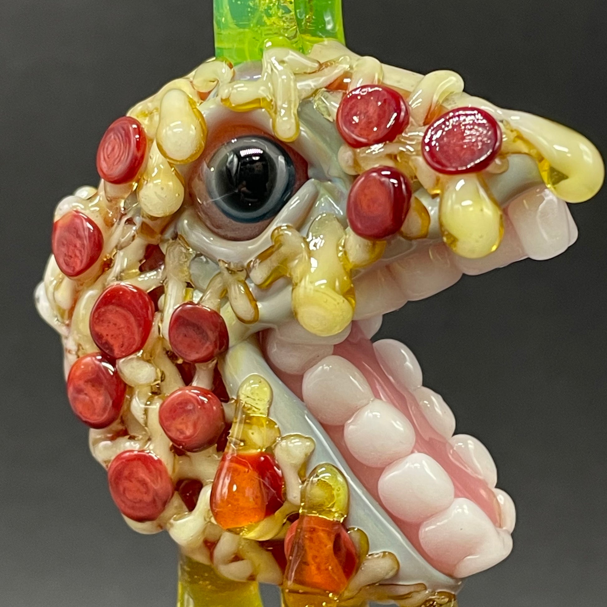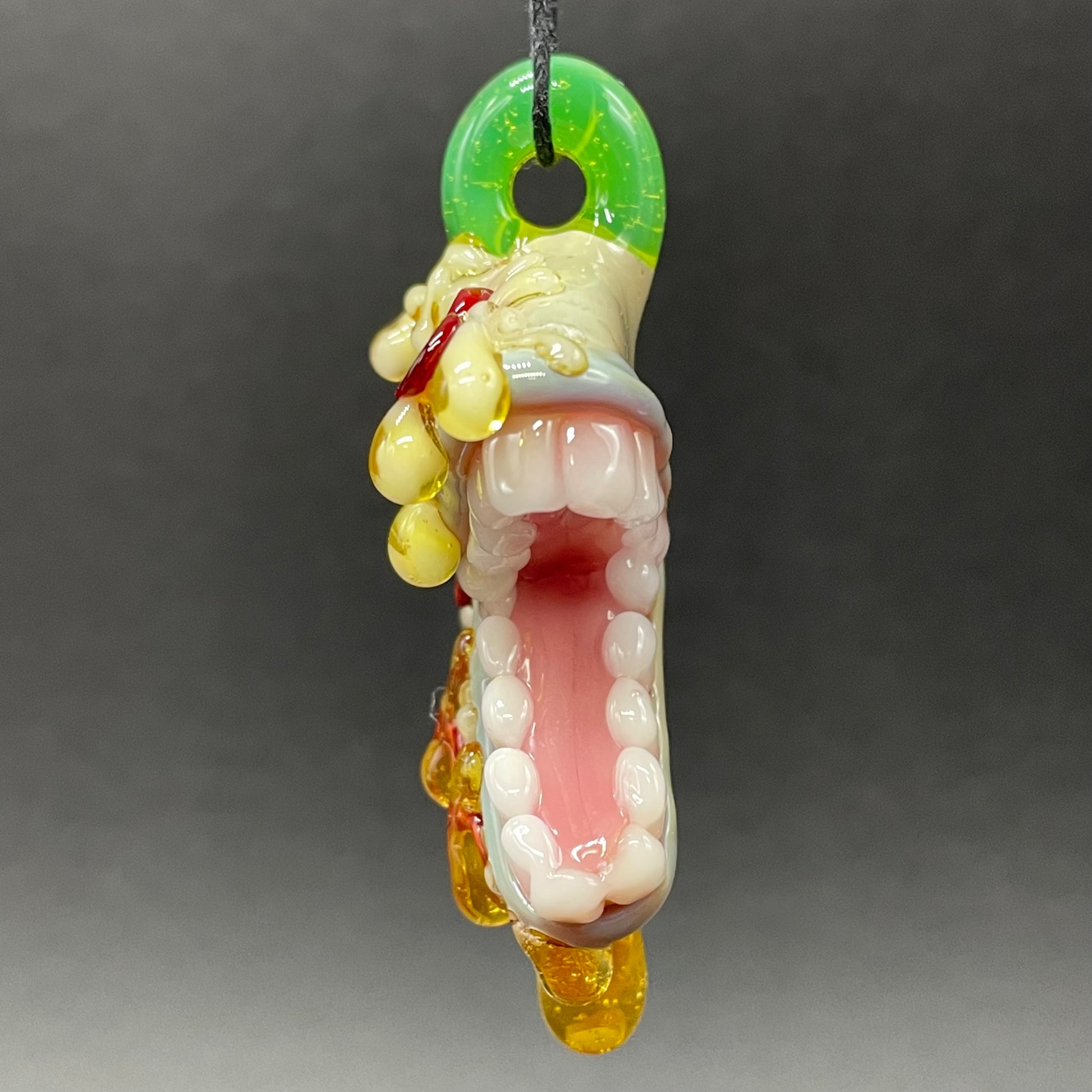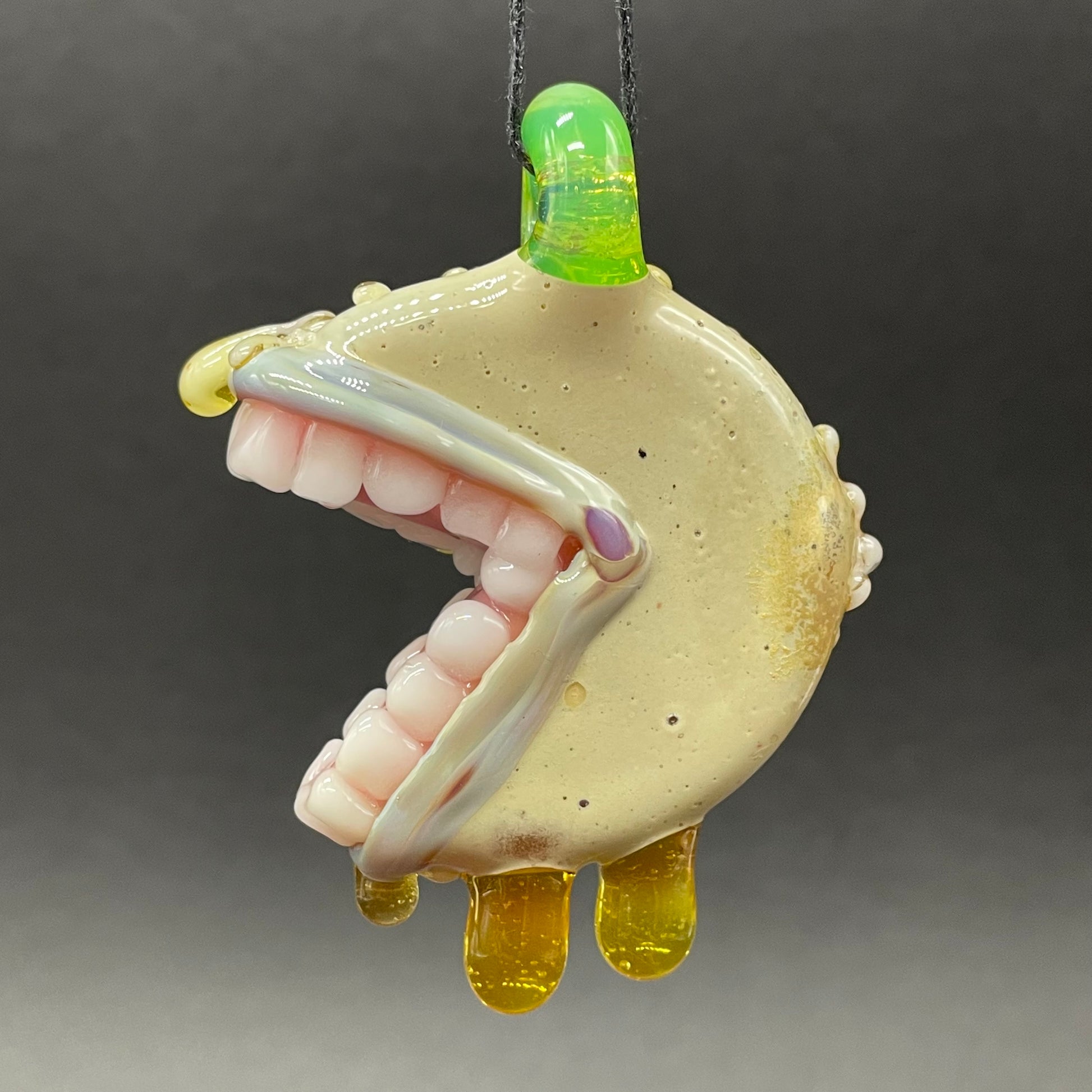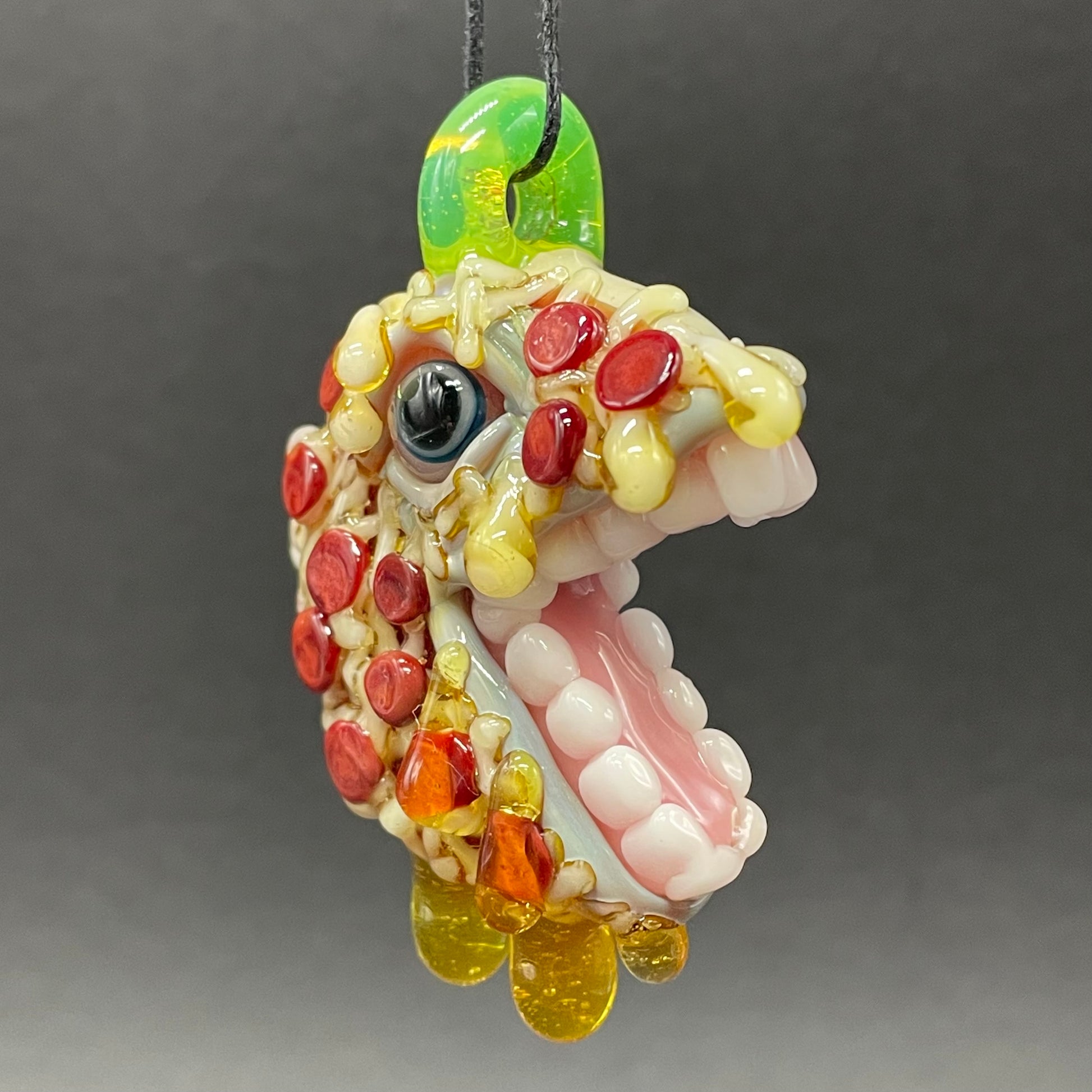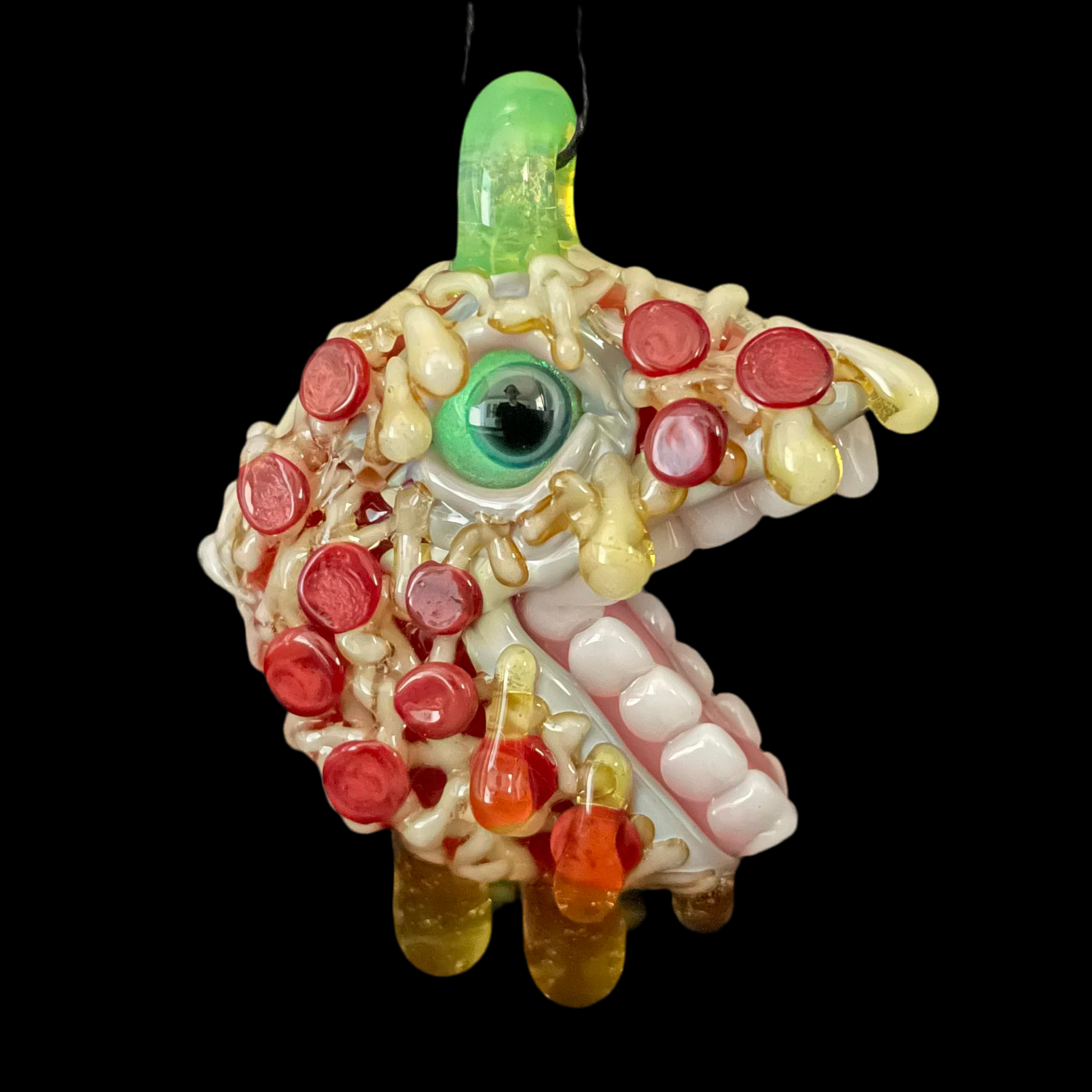 This detailed glass pendant features a glow in the dark eye dripping cheese and dangerous teeth. Imagine all the compliments you will get with such a unique design.