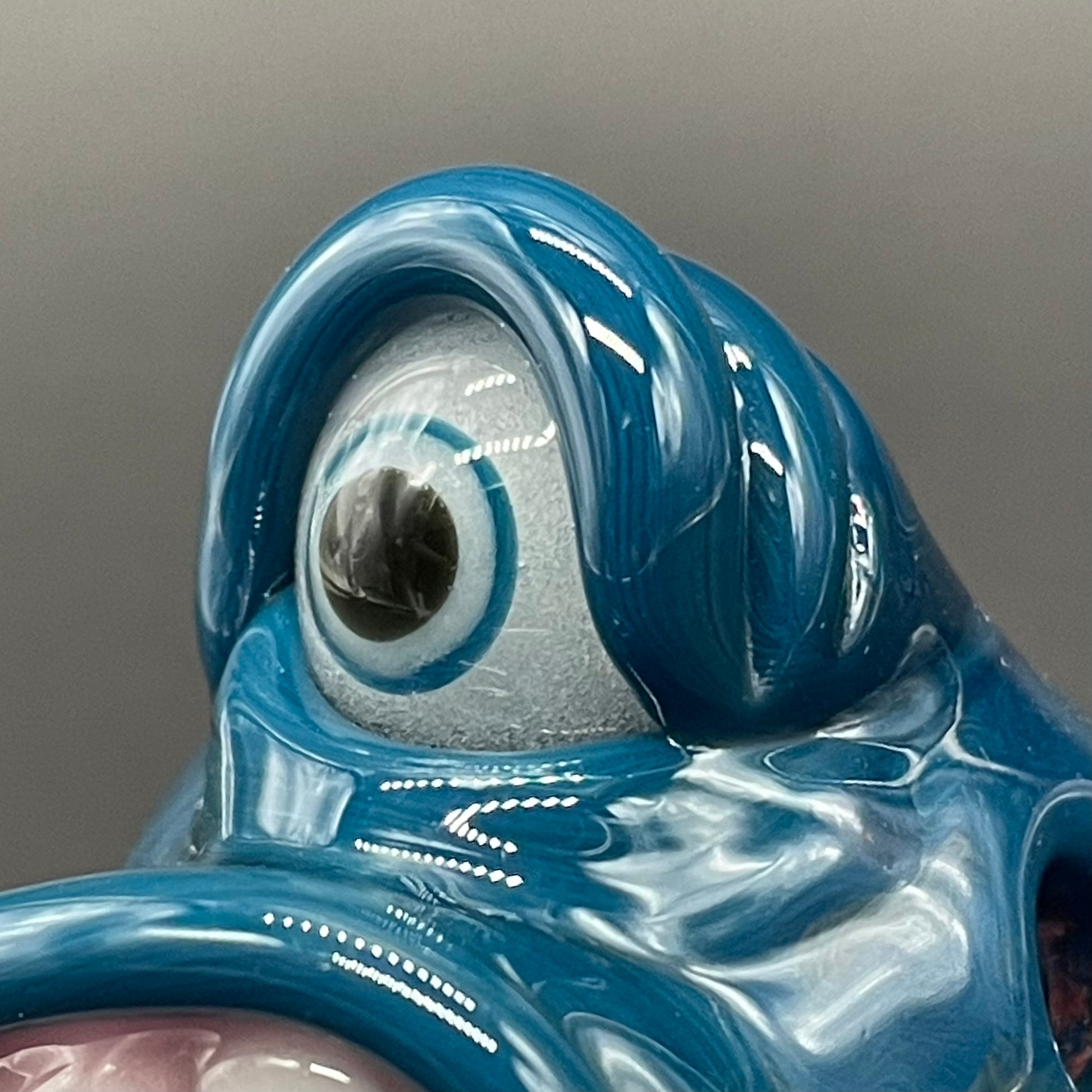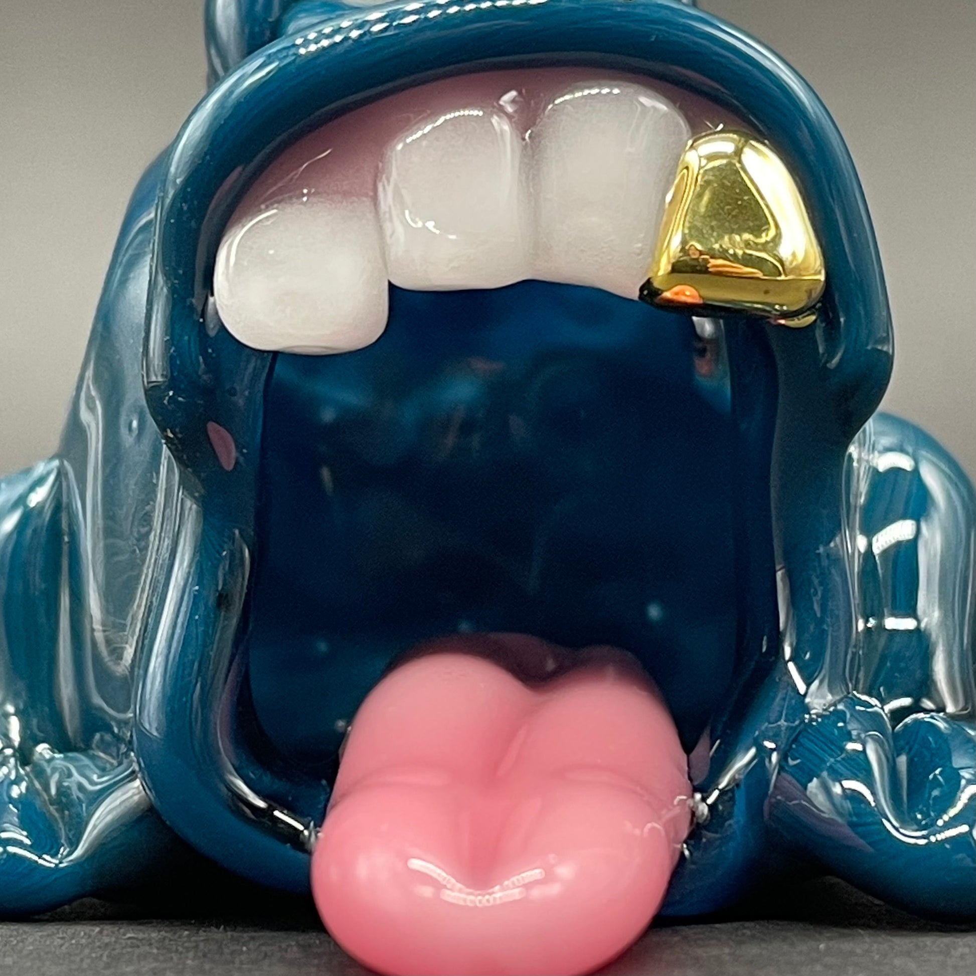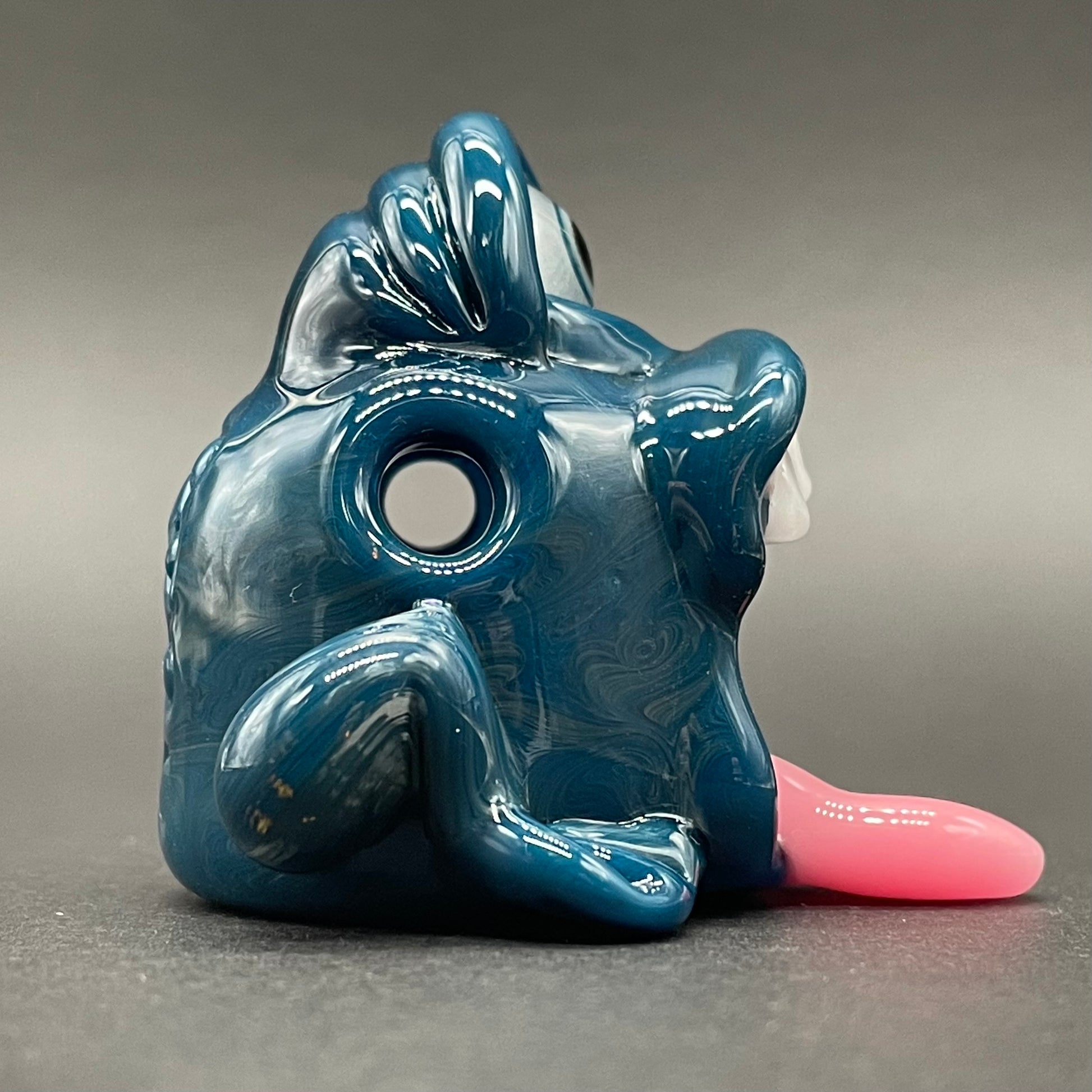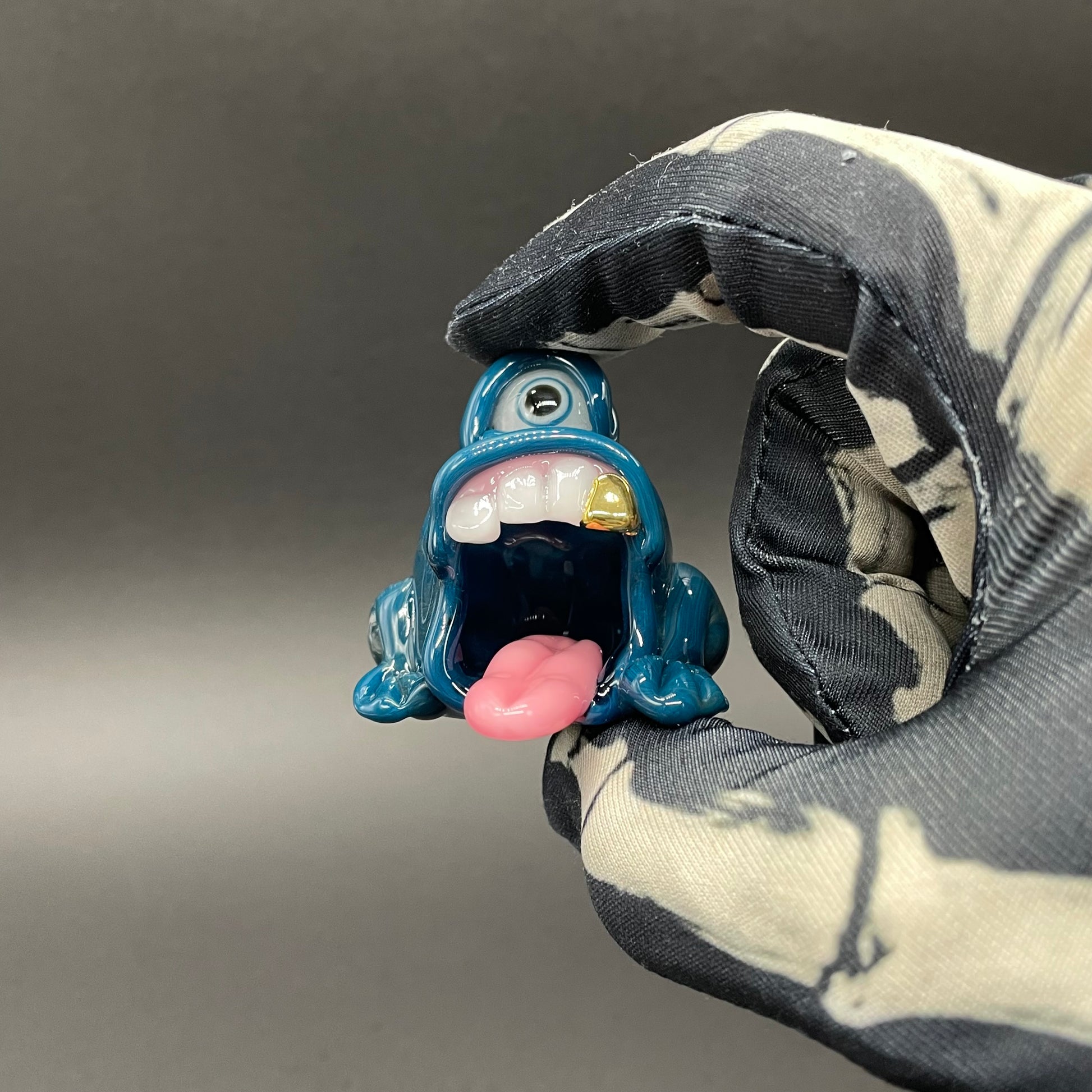 This blue glass warty frog pendant features a long tongue, glow in the dark eye and blinged out gold grill.