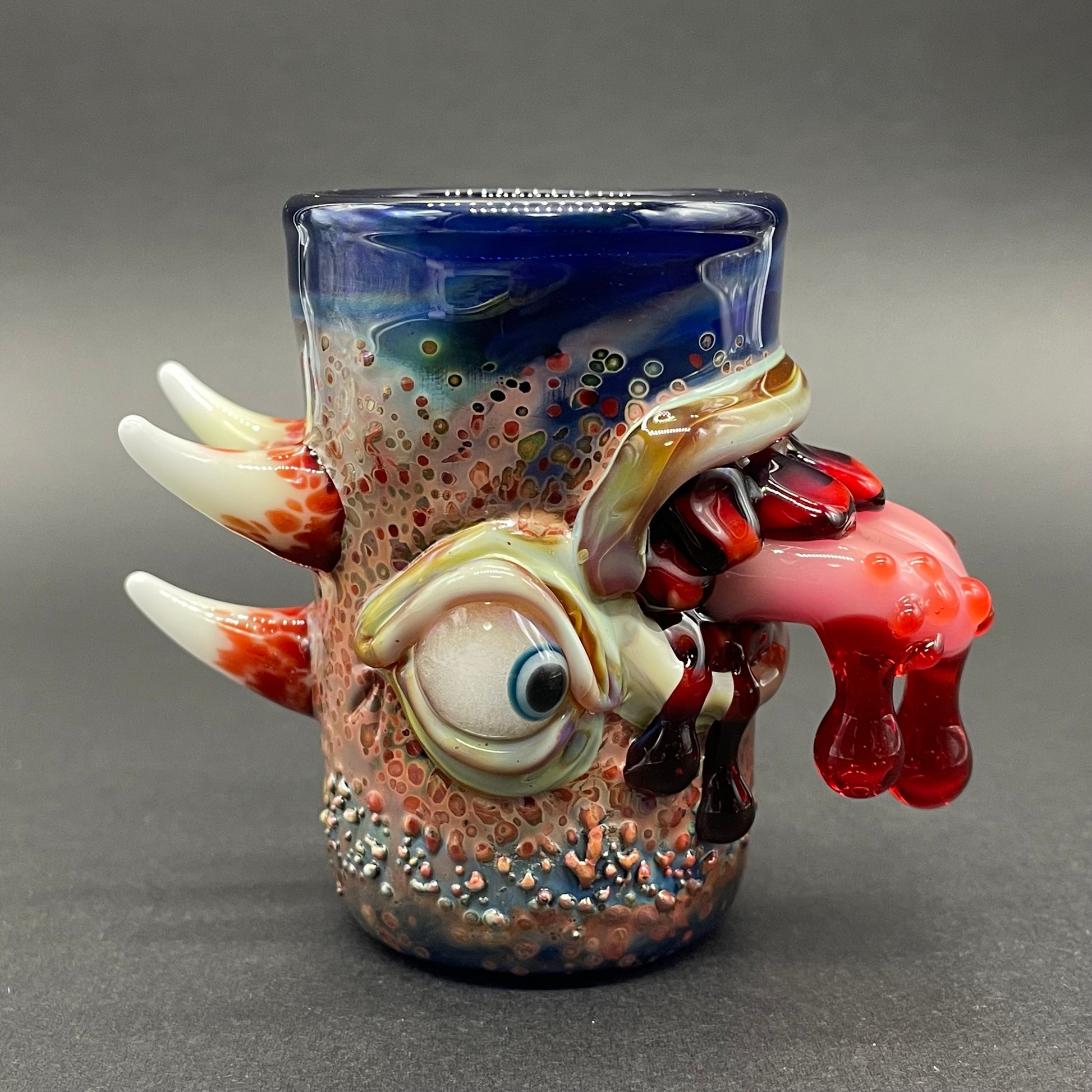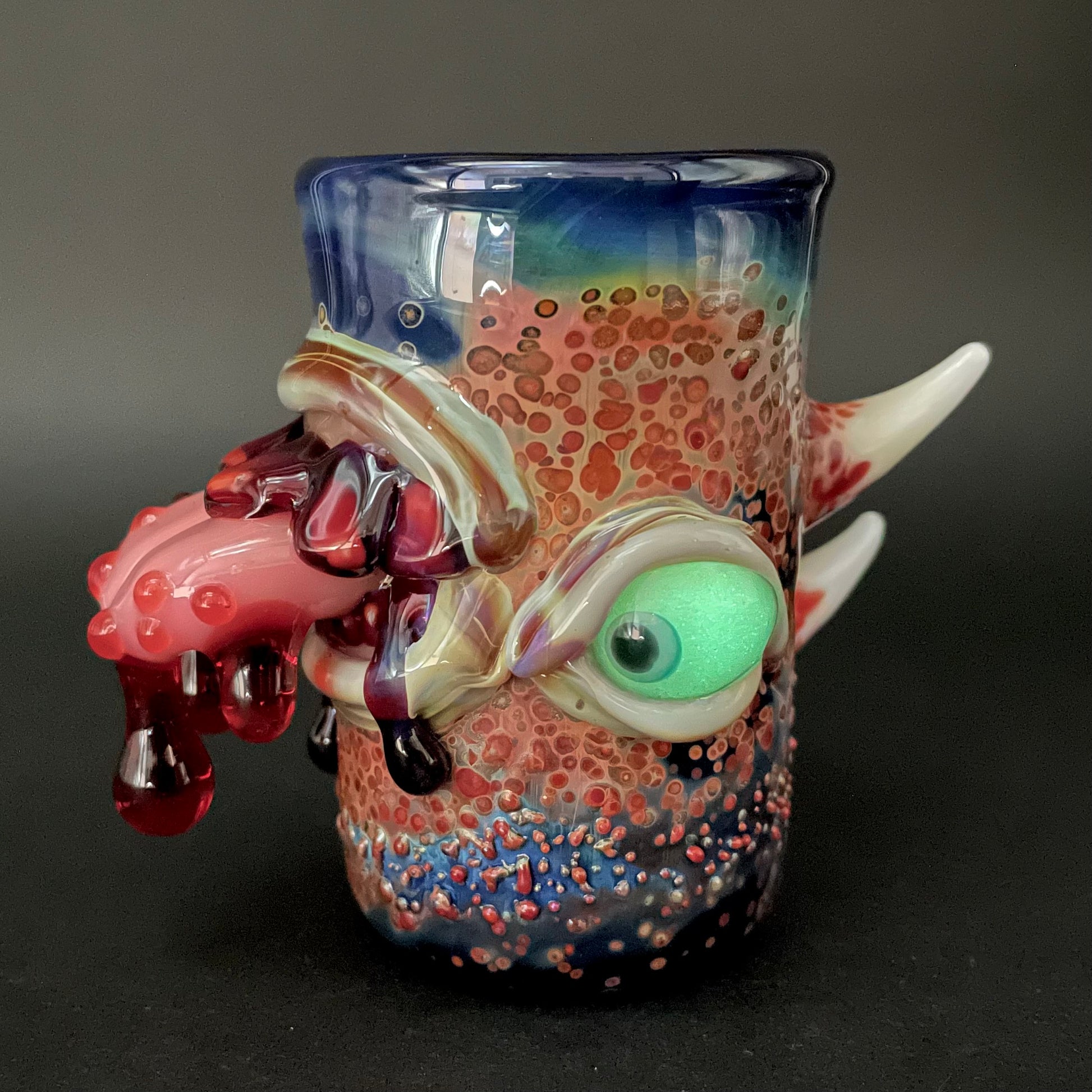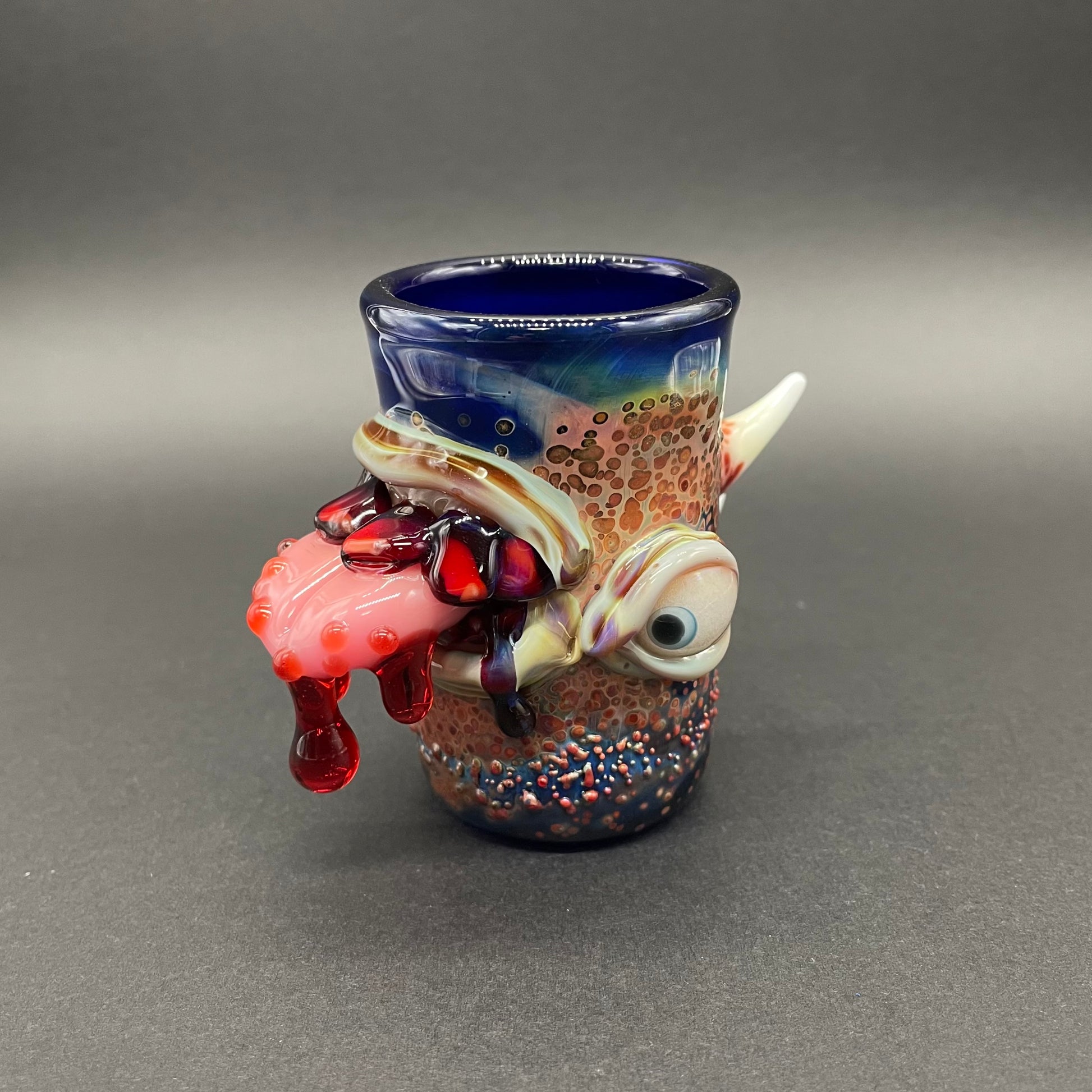 Taste the rainbow shot glass features a bloody tongue and teeth. This piece is also easy to find in the dark with its glow in the dark eye.