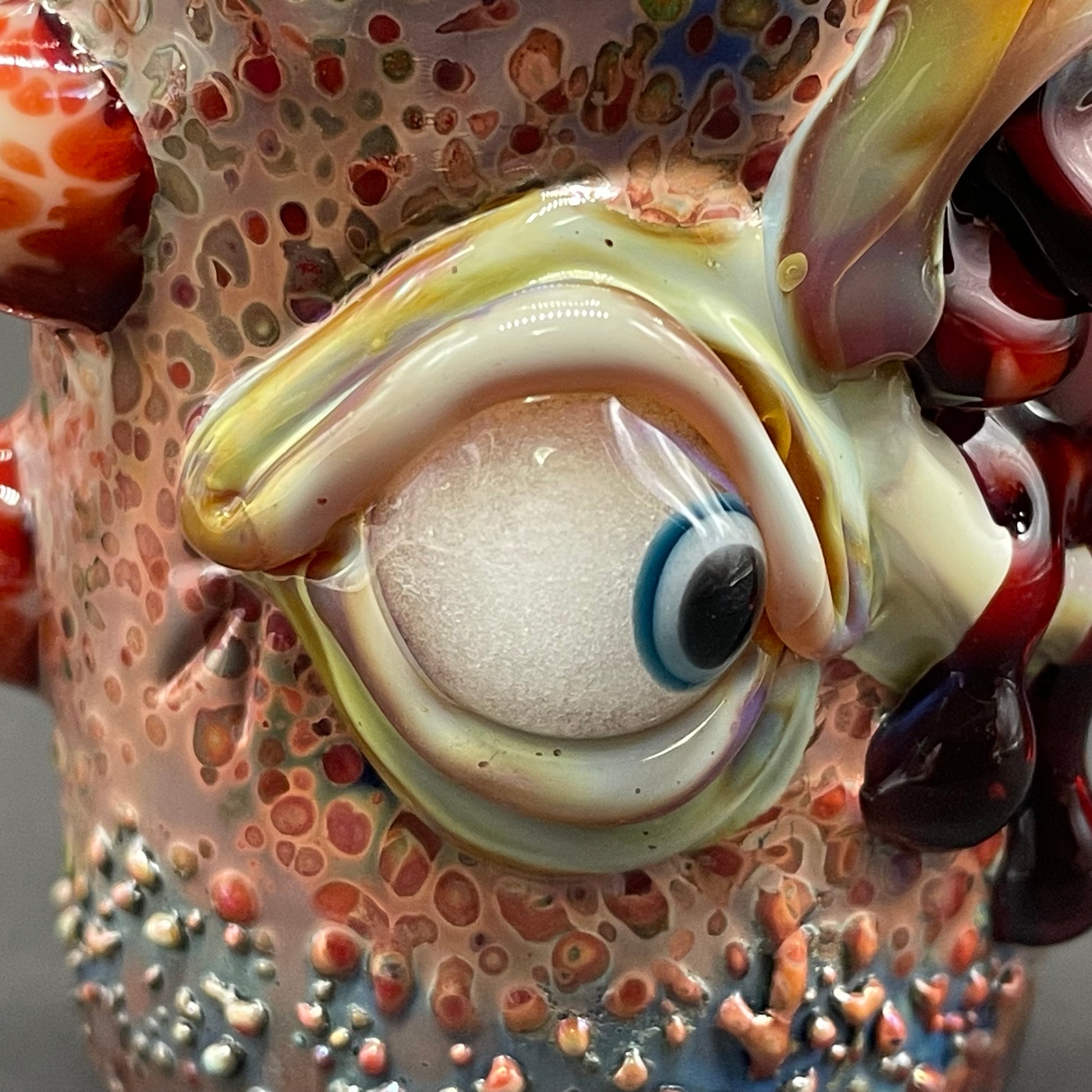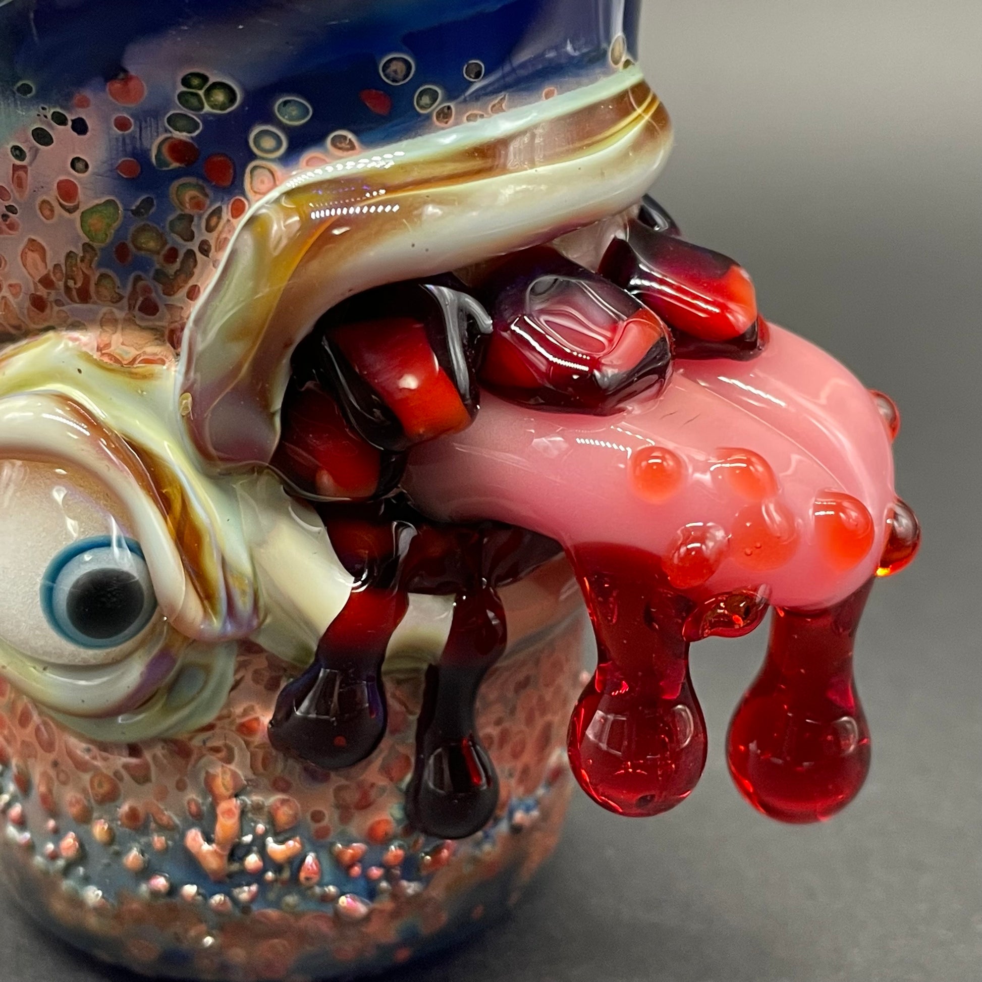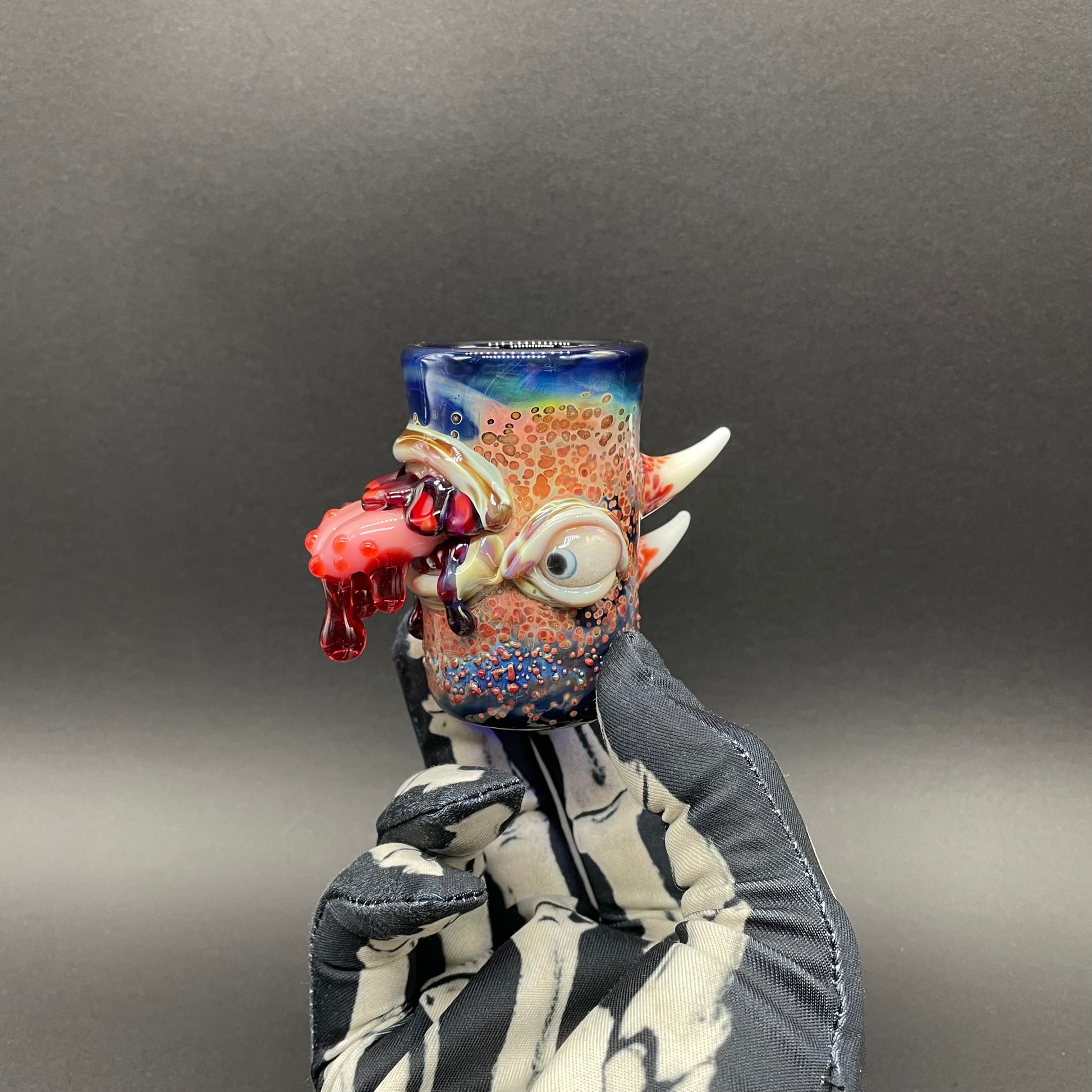 Taste the rainbow shot glass features a bloody tongue and teeth. This piece is also easy to find in the dark with its glow in the dark eye.