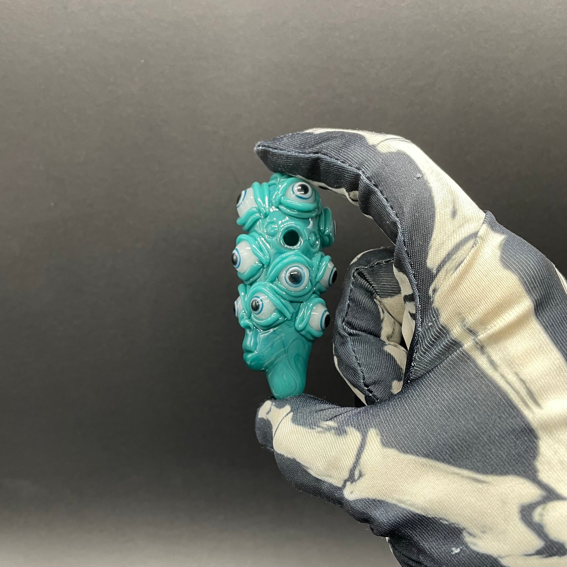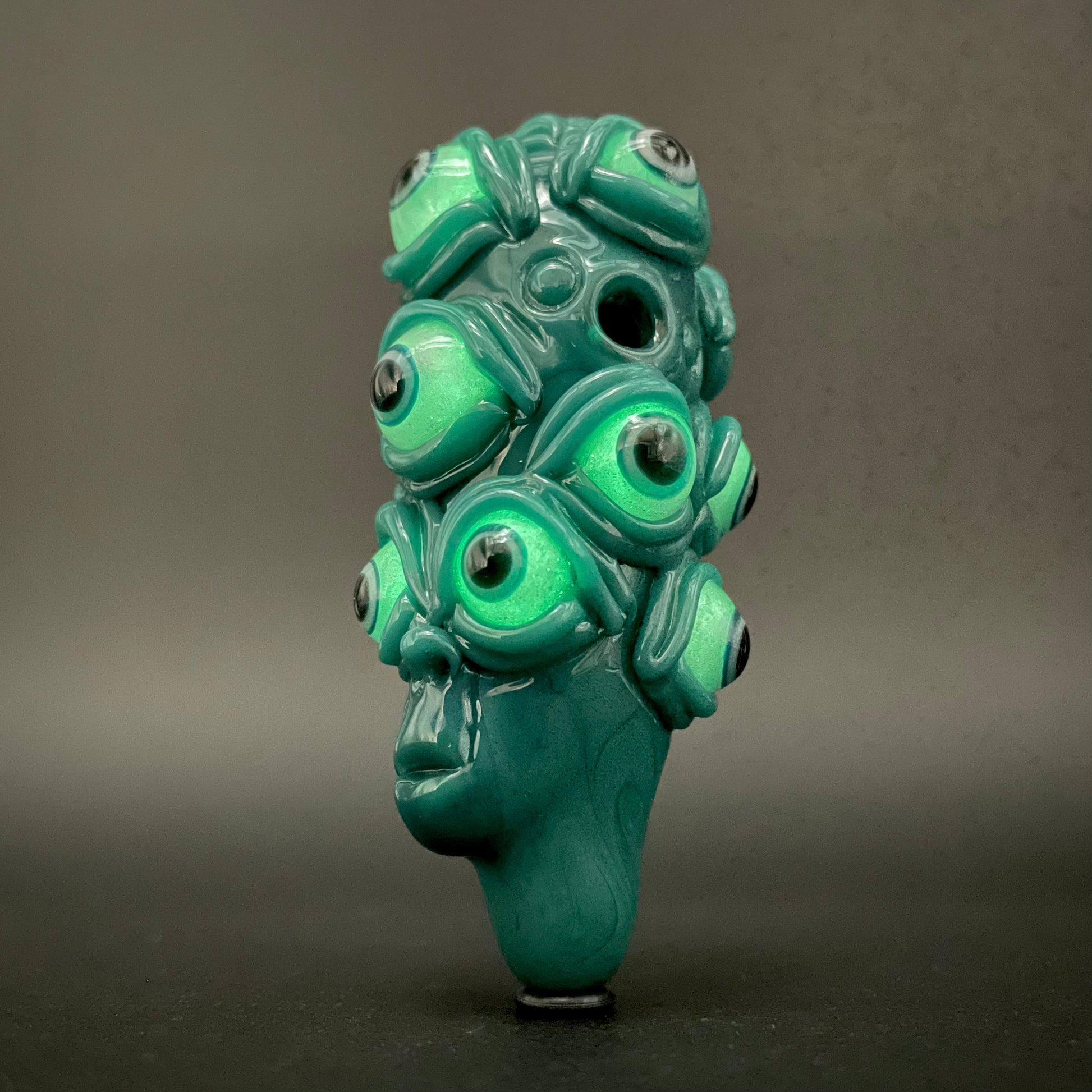 An alien straight from your darkest dreams. This glass pendant boasts an elongated head swarming with glow in the dark eyes that seem to follow you wherever you go. A hauntingly beautiful piece for lovers of the strange and uncanny.
