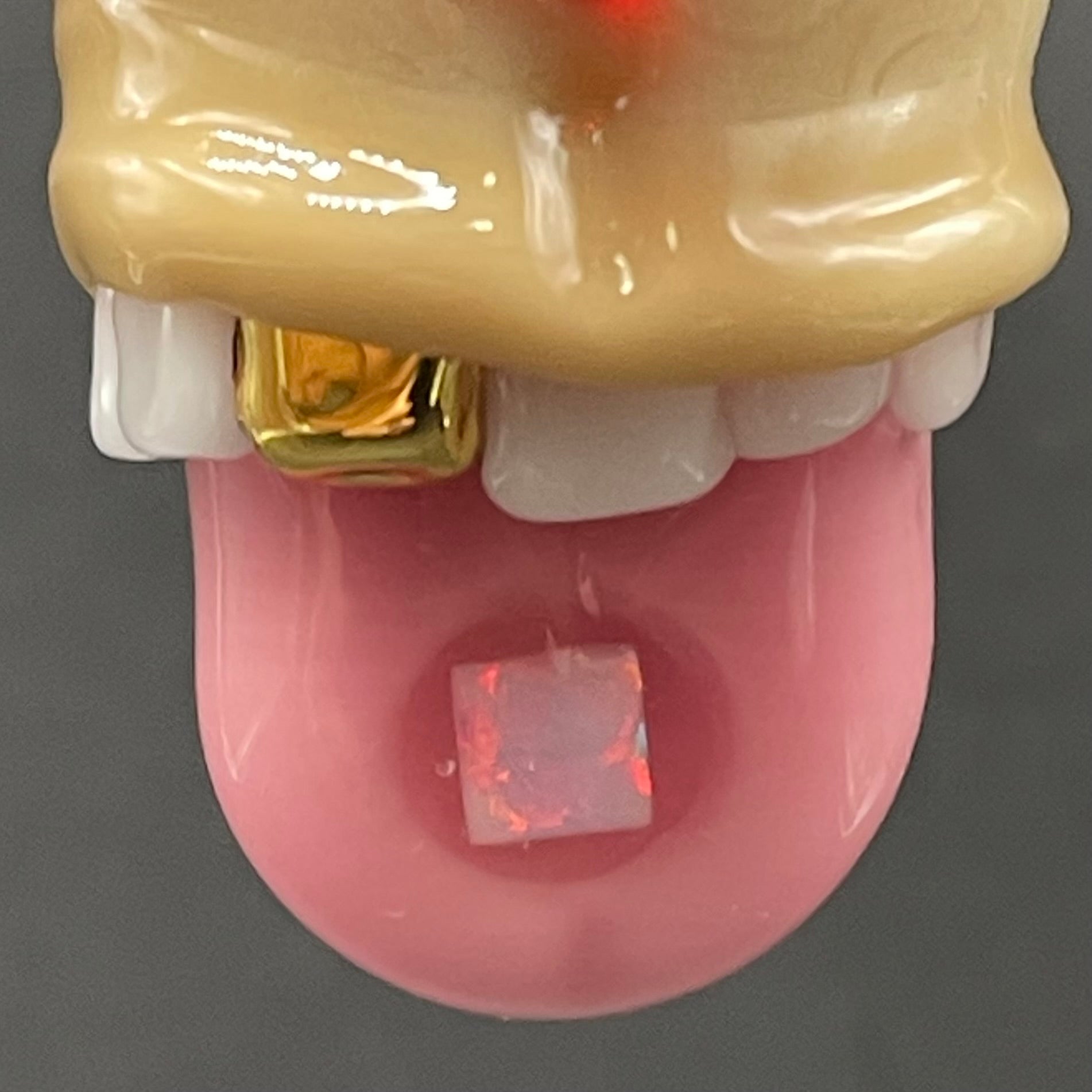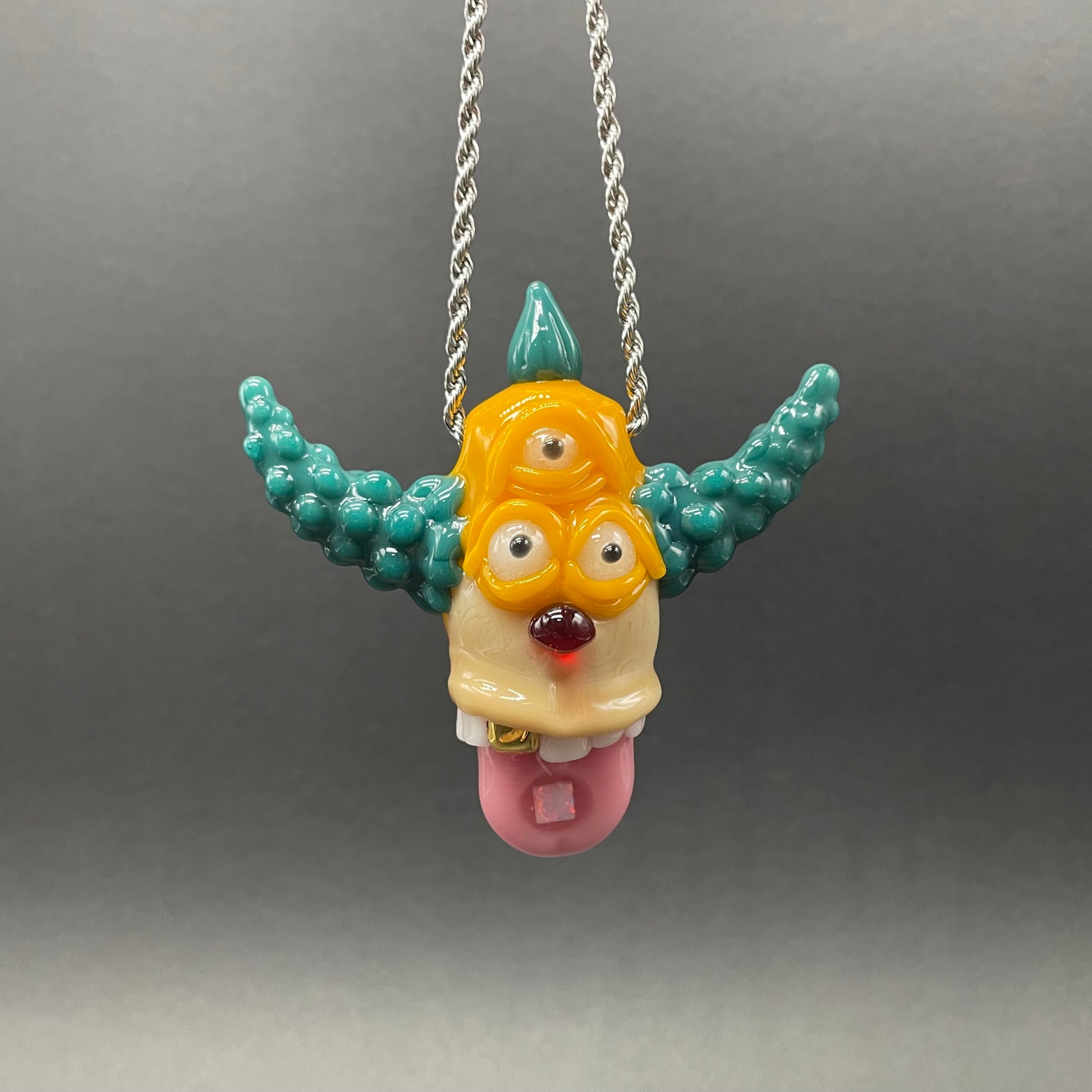 This one of a kind glass pendant features krusty the clown with 3 bulging glow in the dark eyes, his trademark green hairdo and a long lolling tongue with a 5mm square opal tab. This cosmic trickster is perfect for fans of Simpsons oddities, mutant mashups, and unique glass art.