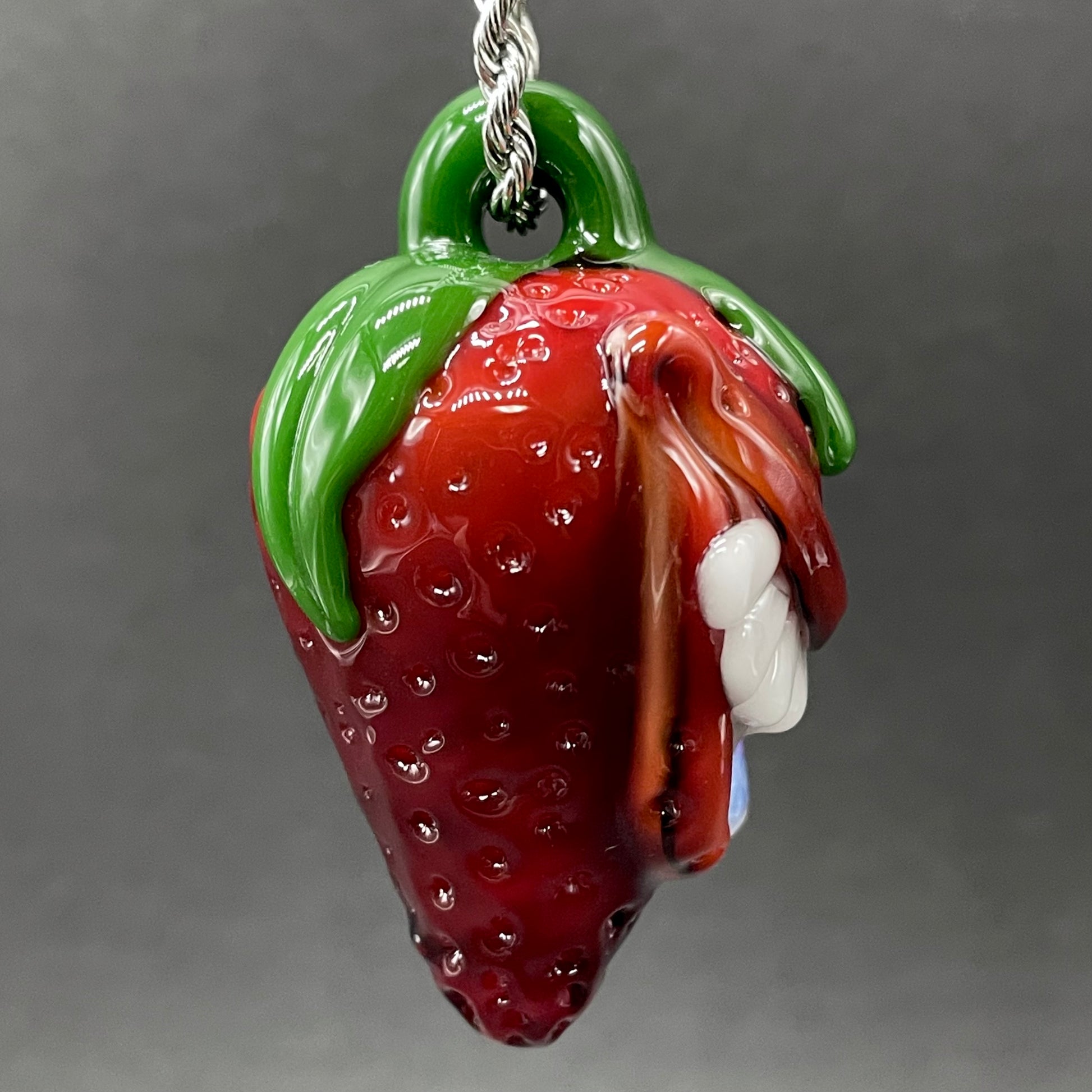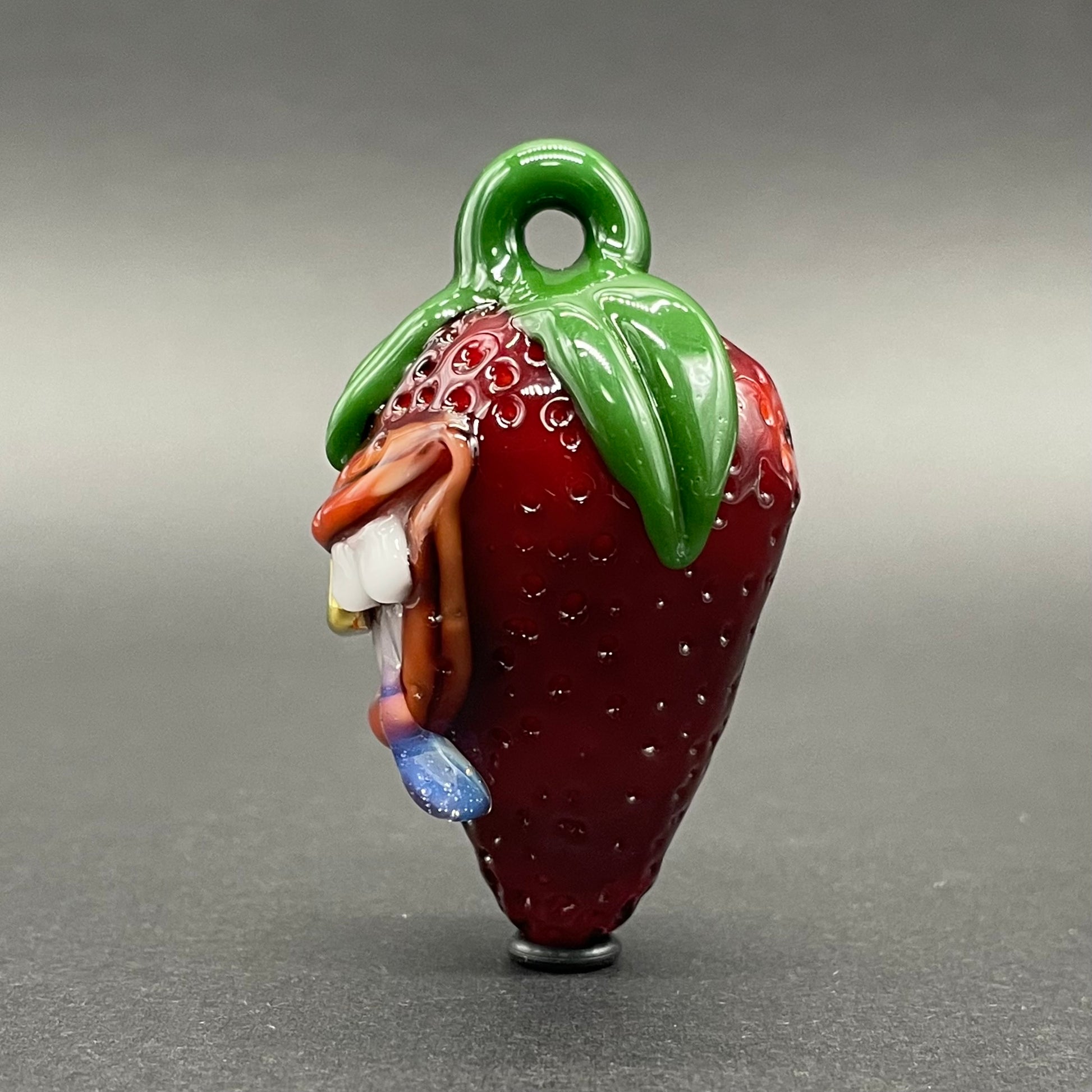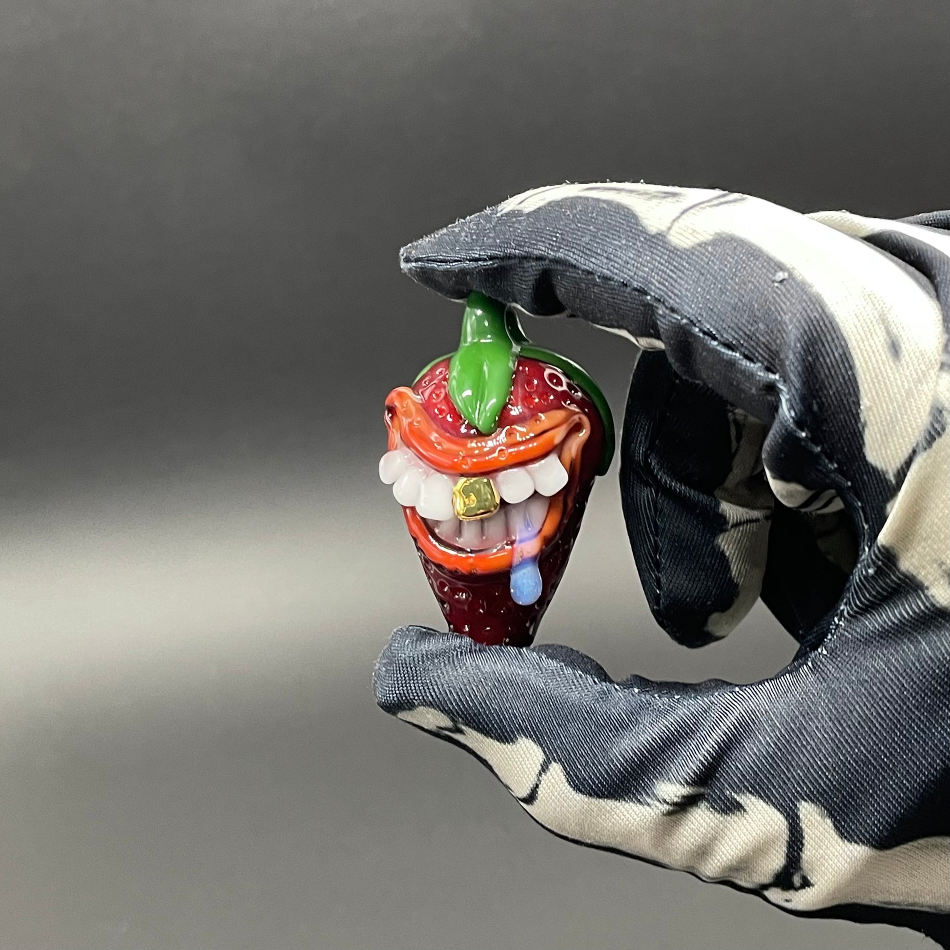This one of a kind glass strawberry pendant grins wide with pearly white chompers and a single sparkling gold enamel tooth. Both sweet and sinister, it’s a playful twist on wearable art perfect for lovers of the unusual, creepy-cute, and truly unique accessories.