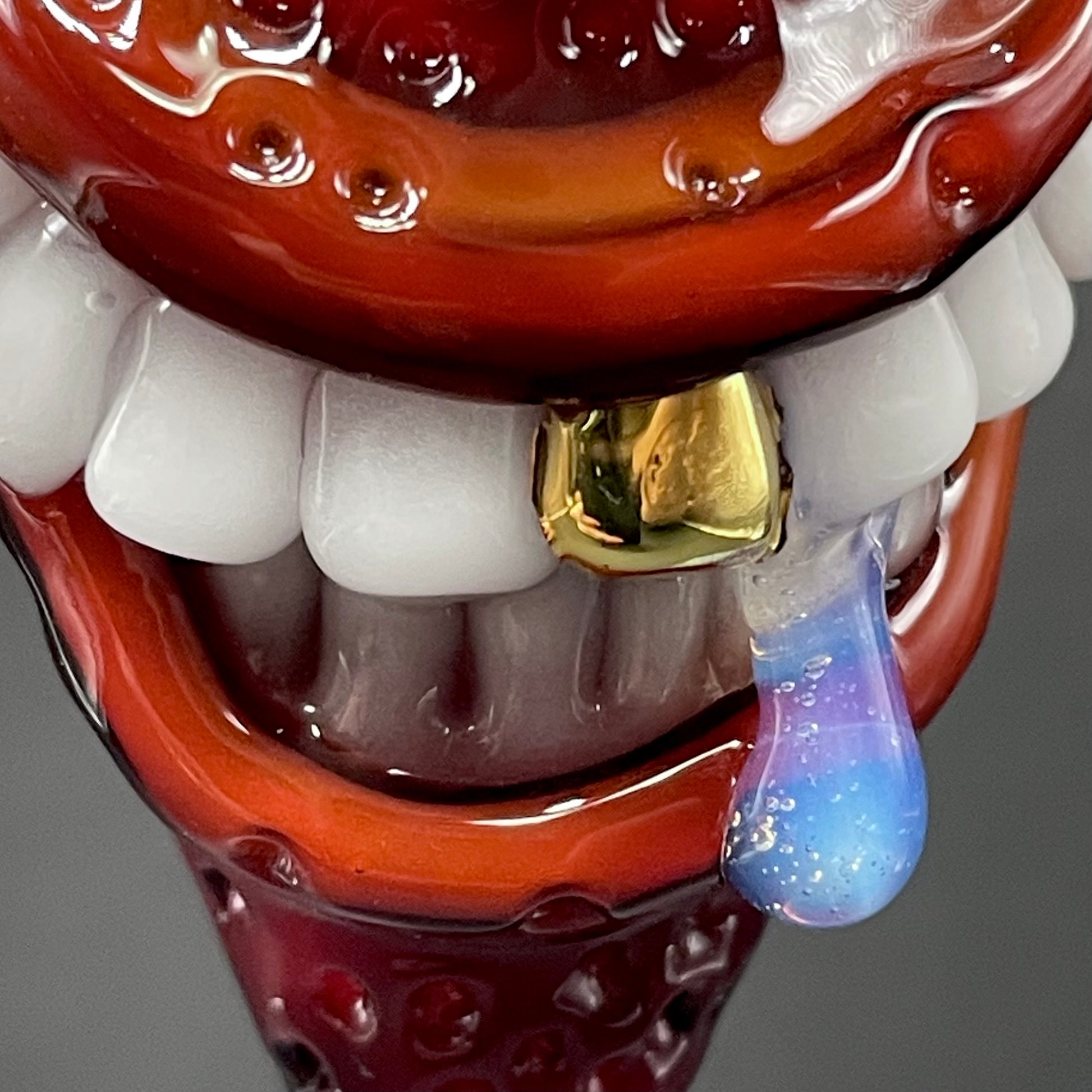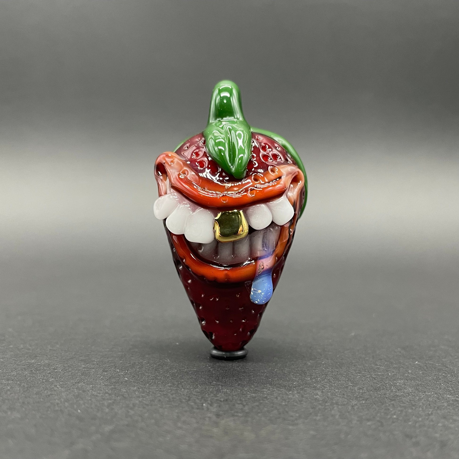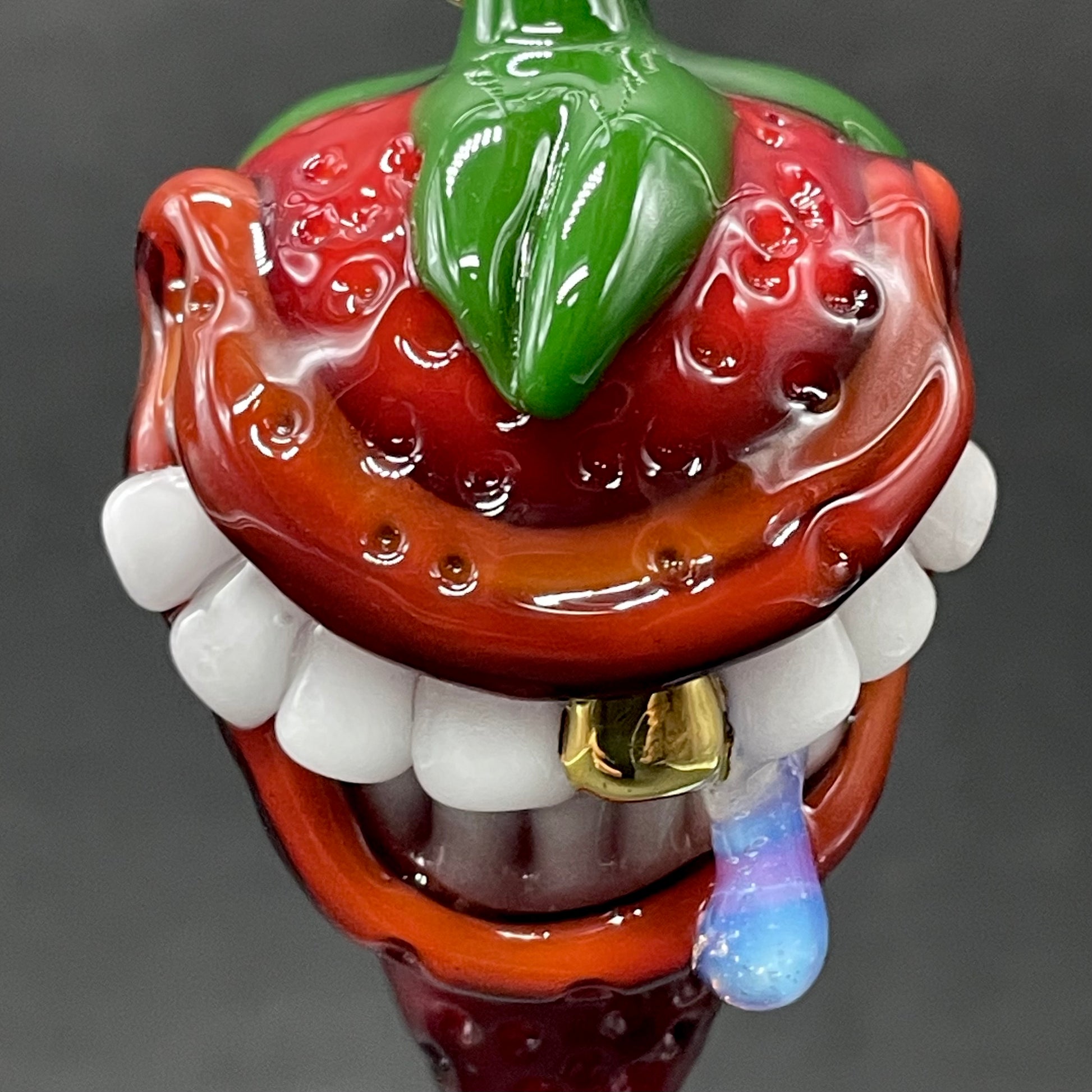 This one of a kind glass strawberry pendant grins wide with pearly white chompers and a single sparkling gold enamel tooth. Both sweet and sinister, it’s a playful twist on wearable art perfect for lovers of the unusual, creepy-cute, and truly unique accessories.